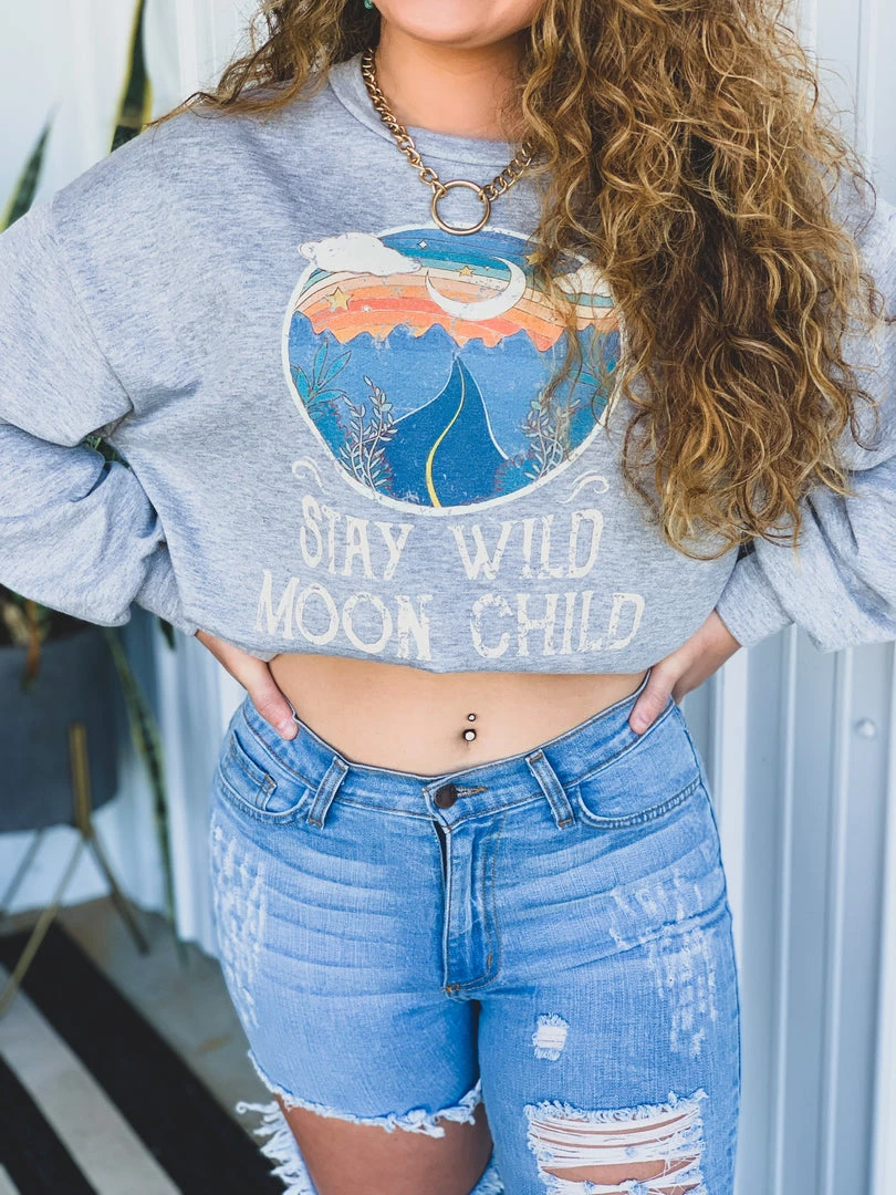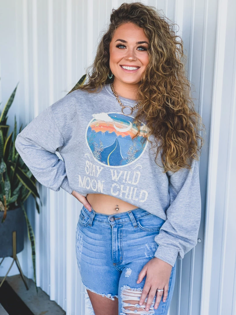 Our gorgeous gray colored “Stay Wild Moon Child” light weight sweatshirt is a must in your wardrobe! Features a round crew neckline and lightweight comfy feel with the western graphic “Stay Wild Moon Child” in shades of pink, yellow, blue, and peach. Perfect to pair with a comfy pair of shorts, denim cut offs, or jeans as the weather cools off!