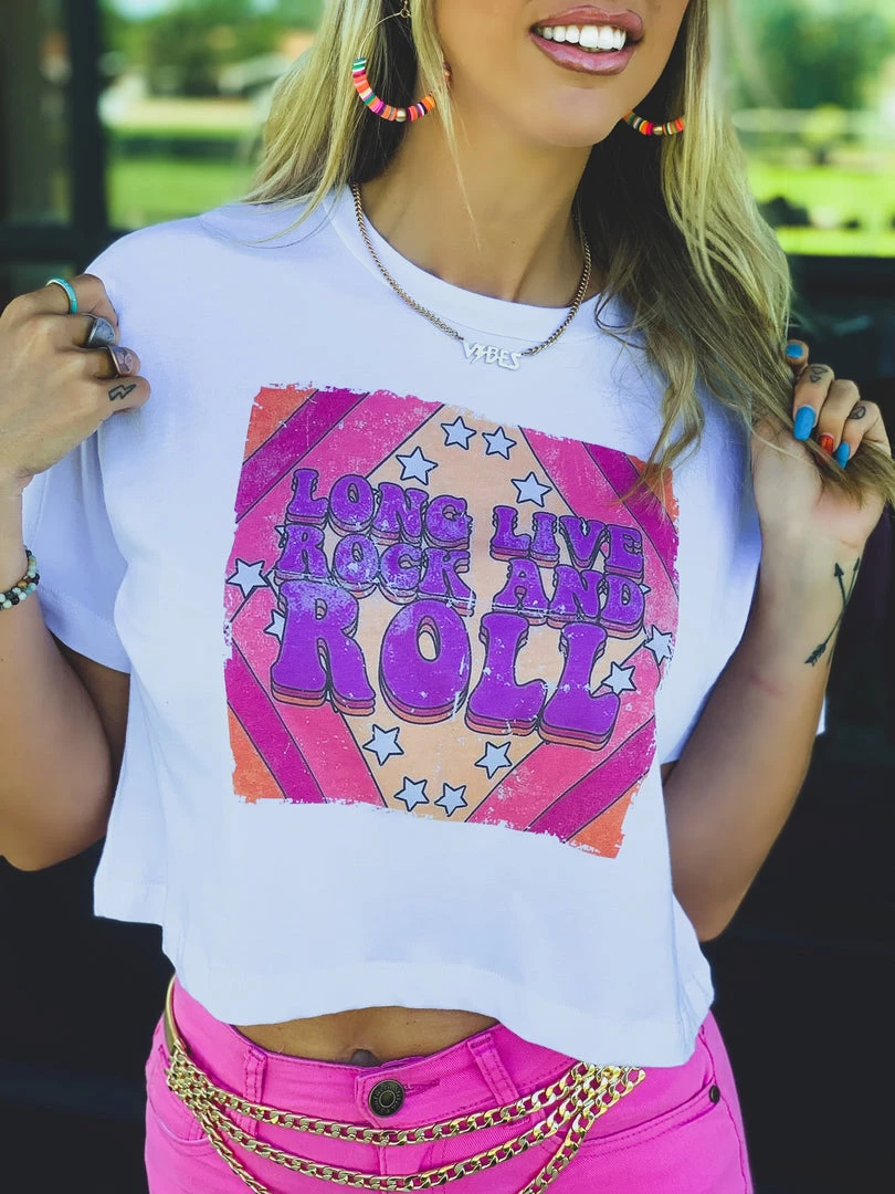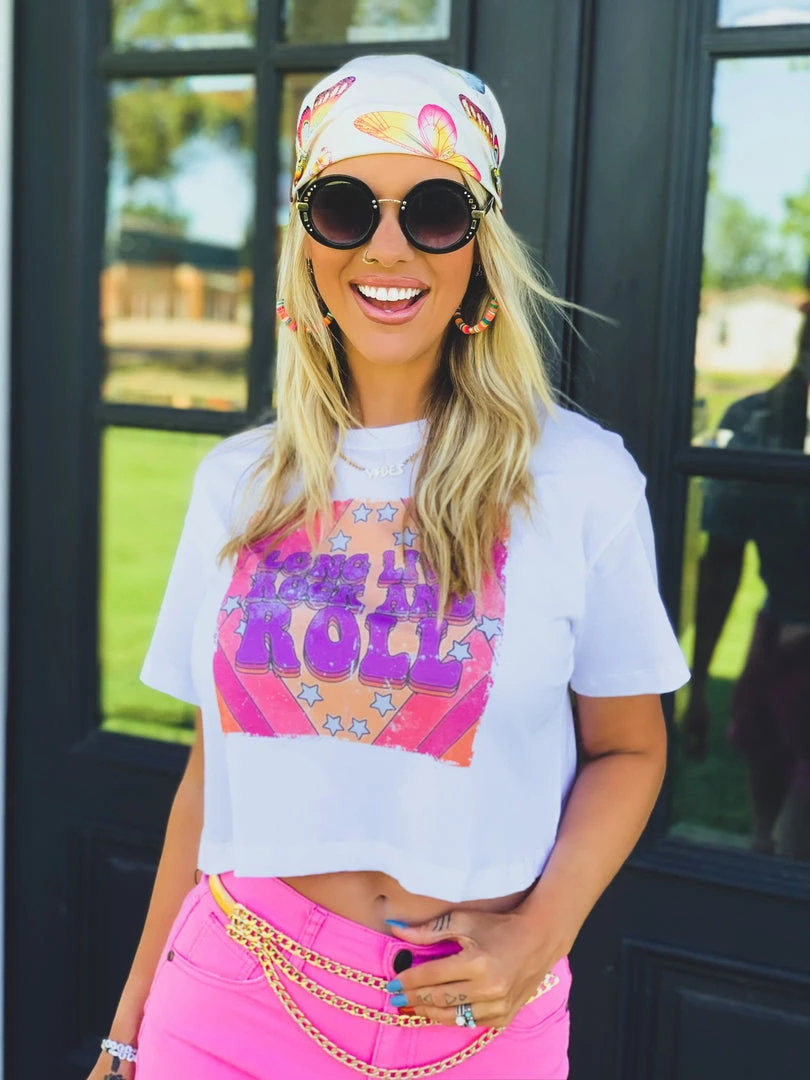 White crop graphic tee “Long Live Rock And Roll” is a must. Tee features a colorful pink retro vintage distressed graphic, “Long Live Rock And Roll” quote, short sleeves, and a cropped length. Pair with our Kirvin Shorts, Poynor Belt, and our Eldorado Wild Rag for the complete look!