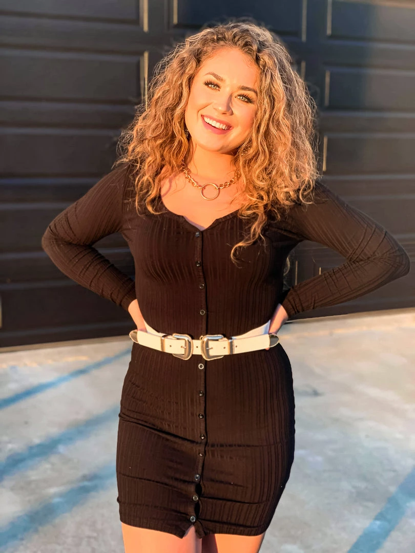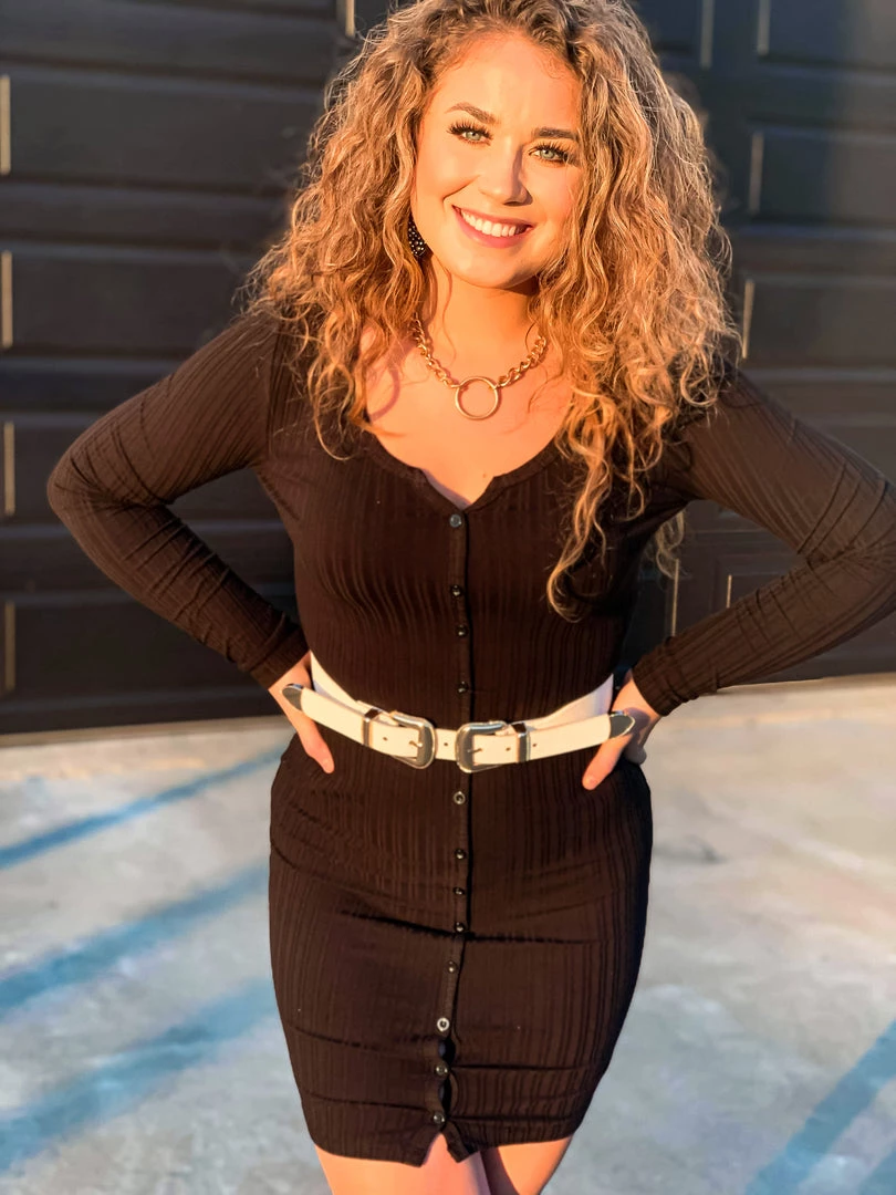 Classic black button down dress is perfect for all your Holiday occasions! Features a rust ribbed texture, fitted style with fitted long sleeves, a v-neckline, midi length, and button down closure. Style with your favorite belt and jacket!