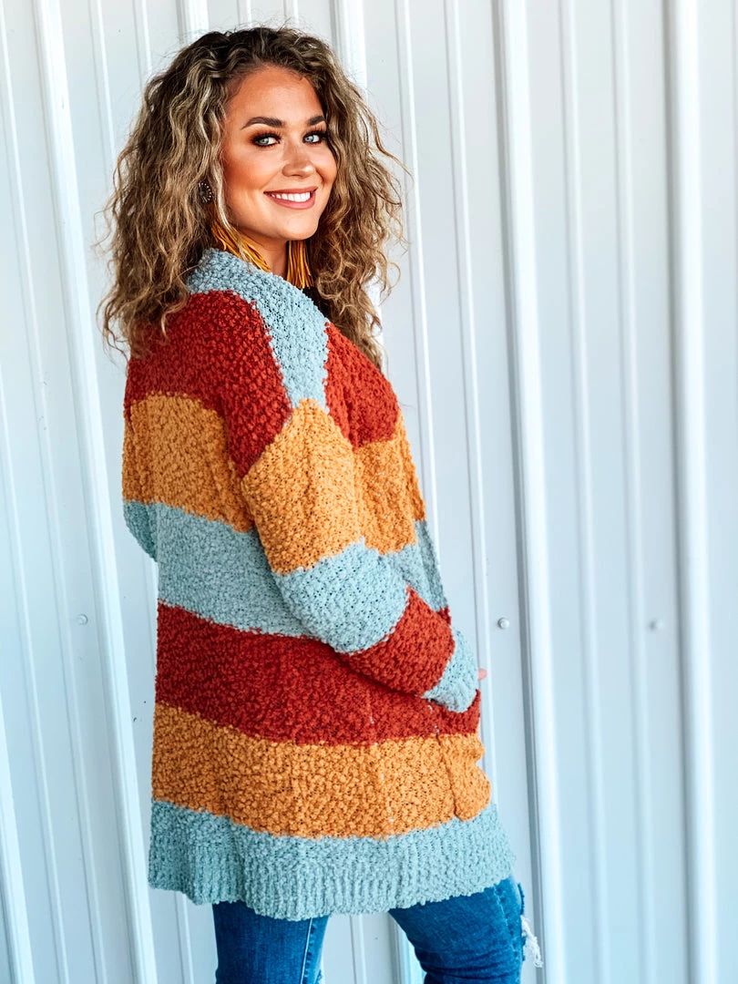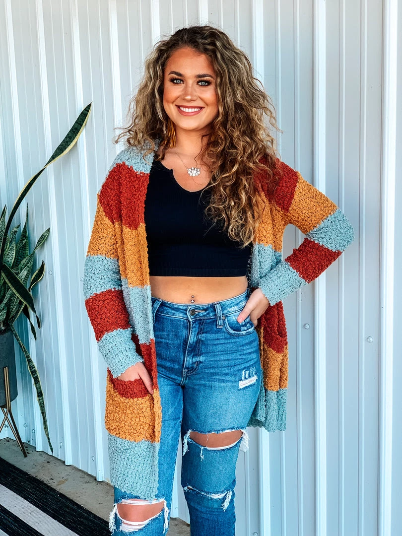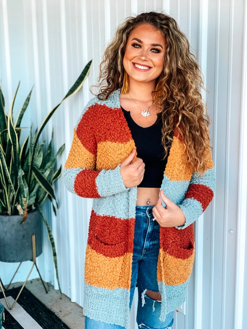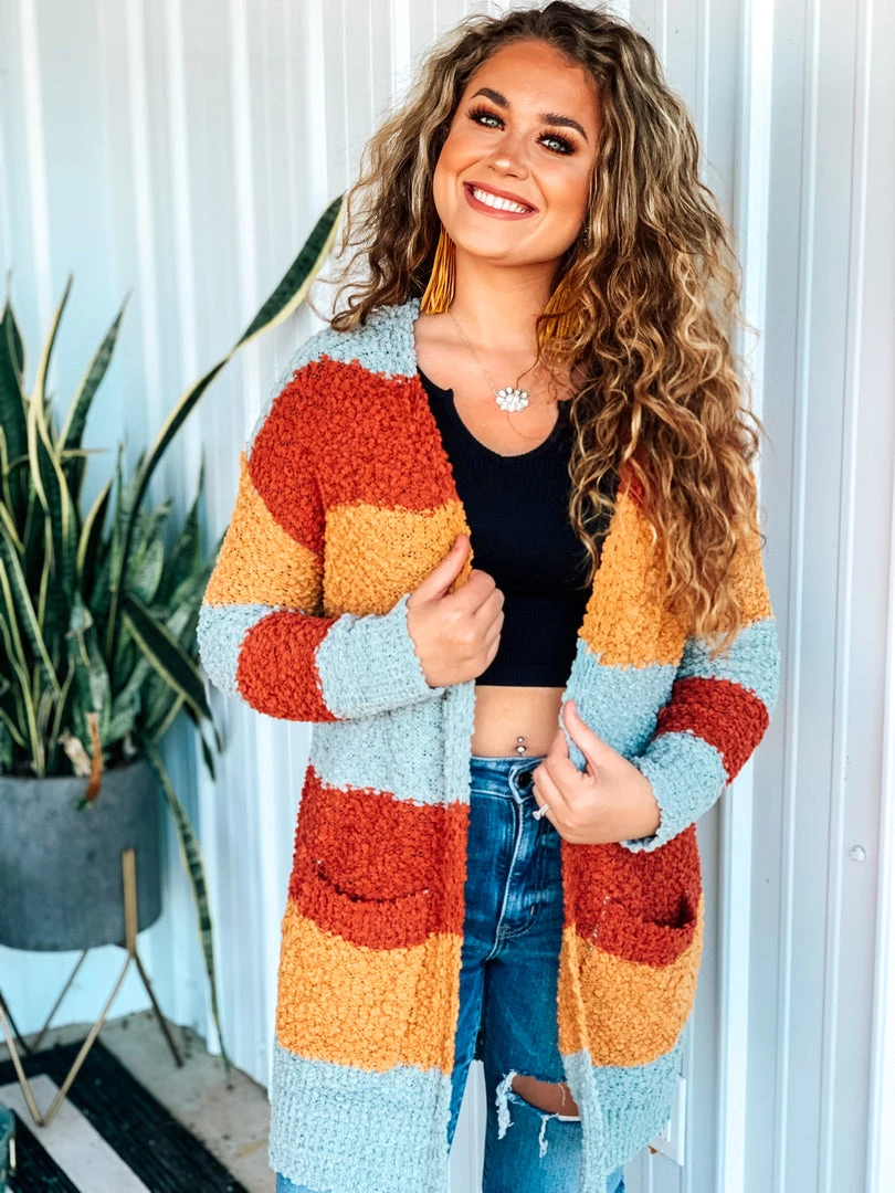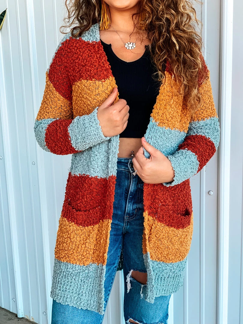 Beautiful multicolored popcorn knit cardigan is the perfect finishing layer to pair over all your favorite Fall crop tops, bodysuits, and graphic tees. Features popcorn knit texture, horizontal color block stripes – with colors of rust/marsala, mustard, and blue, long sleeves, and two open slip pockets. Such a cute and cozy must have for this Holiday season!
