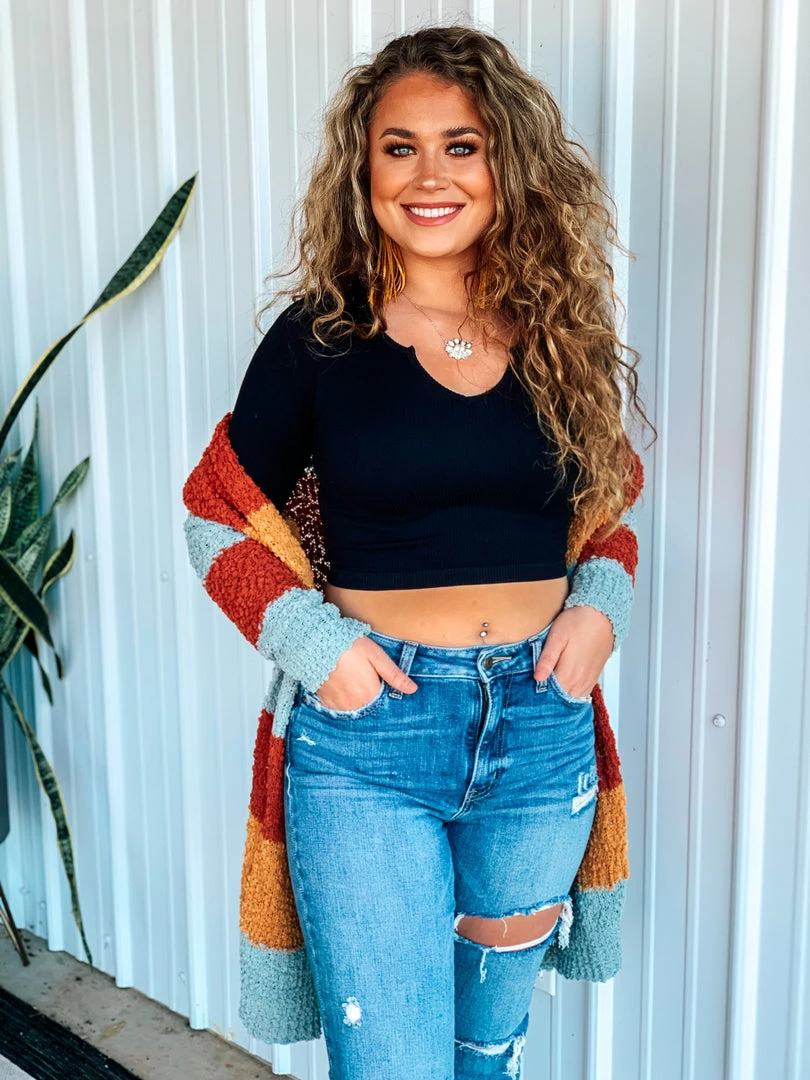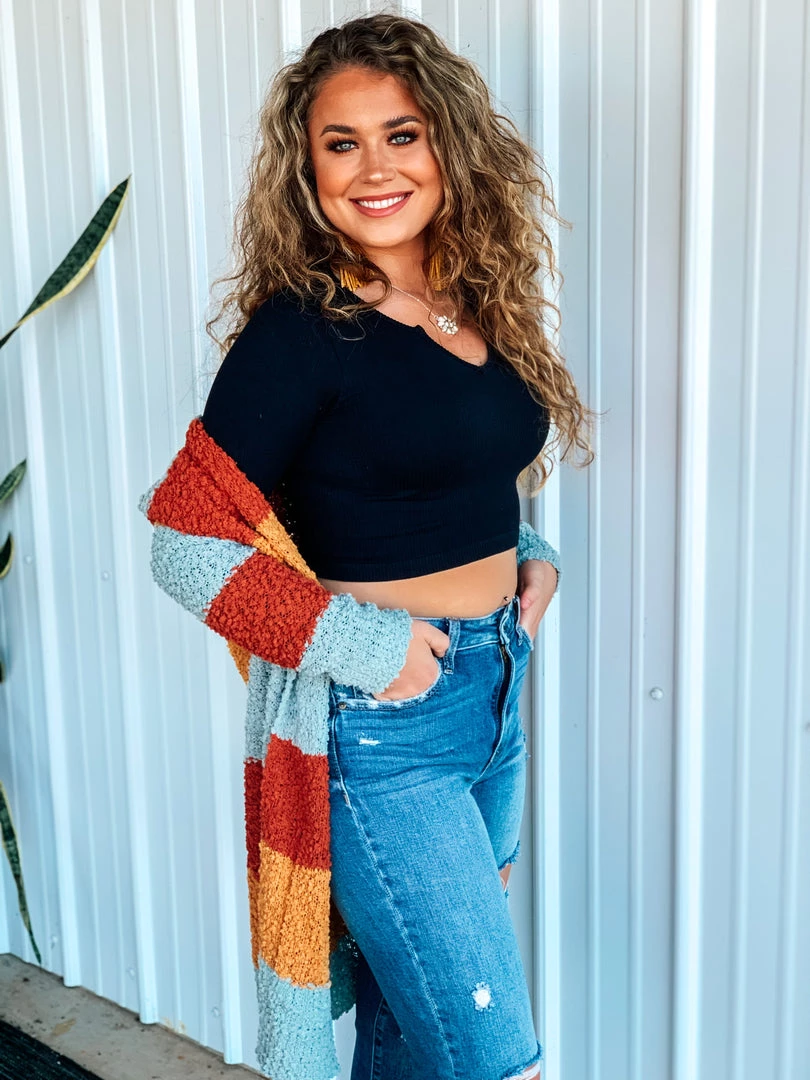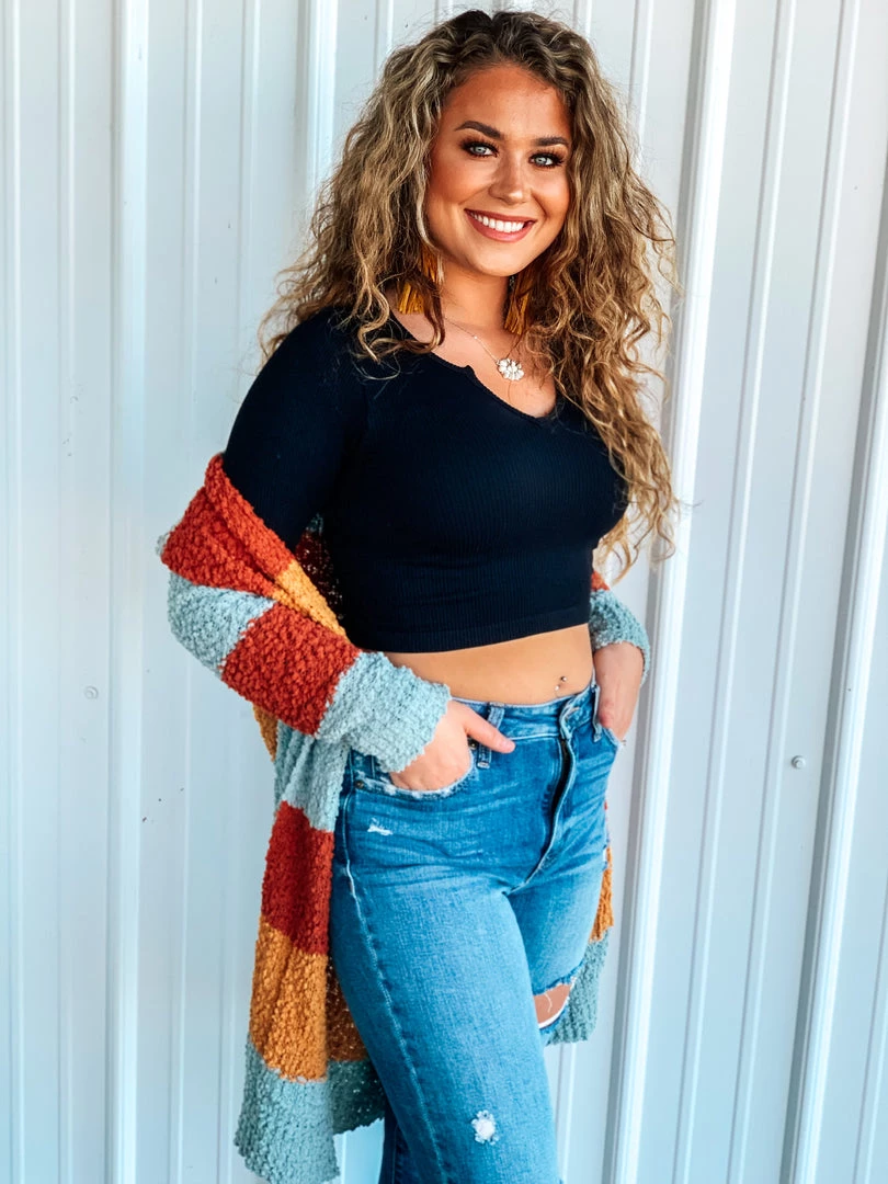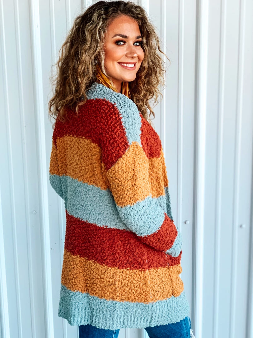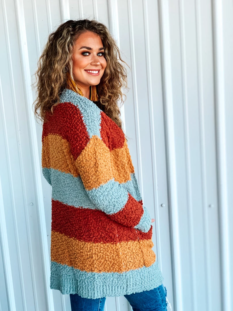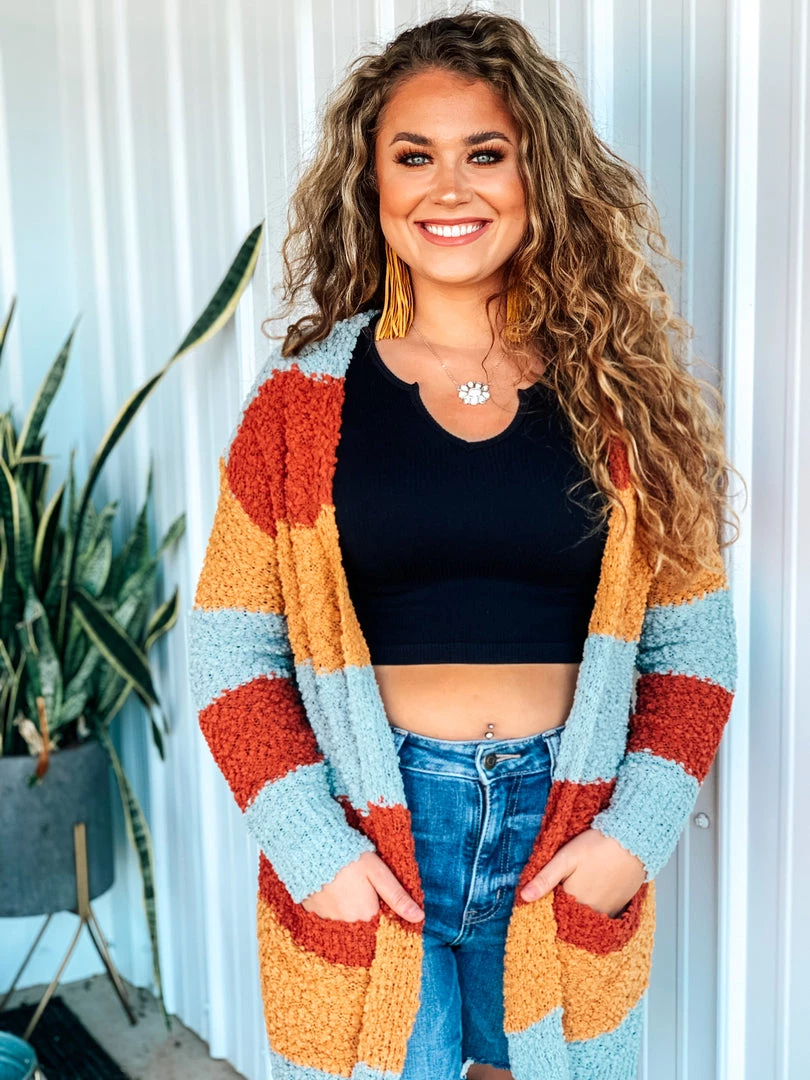 Beautiful multicolored popcorn knit cardigan is the perfect finishing layer to pair over all your favorite Fall crop tops, bodysuits, and graphic tees. Features popcorn knit texture, horizontal color block stripes – with colors of rust/marsala, mustard, and blue, long sleeves, and two open slip pockets. Such a cute and cozy must have for this Holiday season!