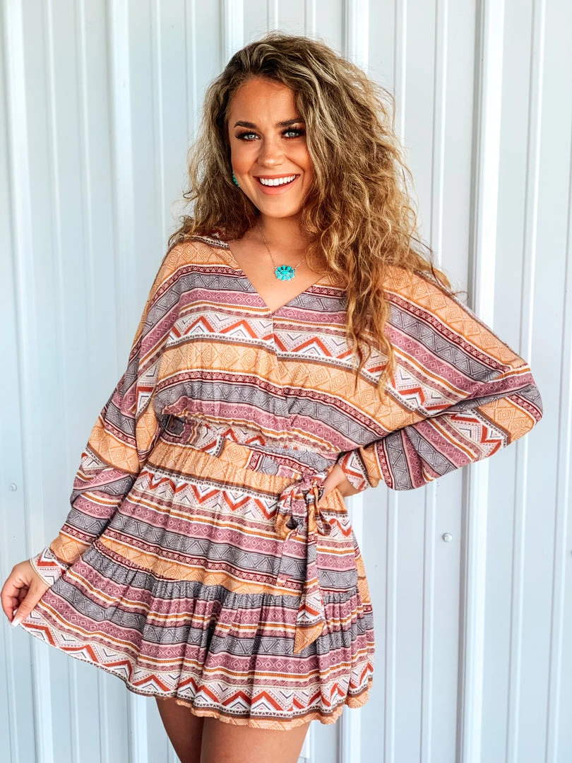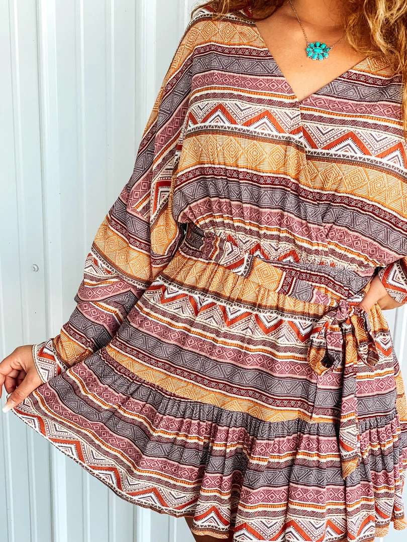 Boho style aztec printed mini dress is the cutest look for all your Fall season events! Features a cross over wrap top with a v-neckline, neckline has a button snap closure for easy slip on, a self tie adjustable bow makes the perfect detail, lightweight long sleeves, ruffle style on the skirt of the dress, has a built in inner-lining underneath for no see through, and an all over aztec boho pattern. So cute to pair with our Sealy Necklace and your favorite knee high boots.