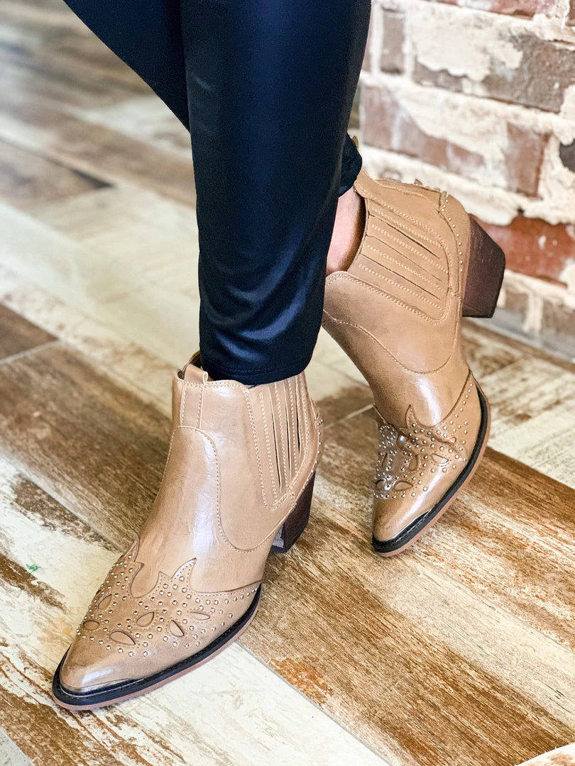 Studded detail for the fashion win this Fall/Winter. Taupe pull on almond pointed-toe studded leather booties. Boots features silver studded detail on the toe and heel, a silver toe rand, and a mid-height heel. Booties are comfortable and look perfect for every occasion. Make your statement in every outfit with these bad boys.