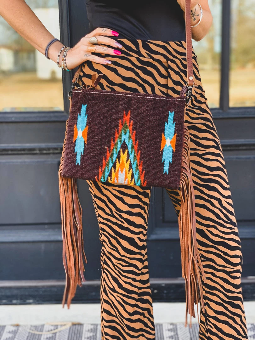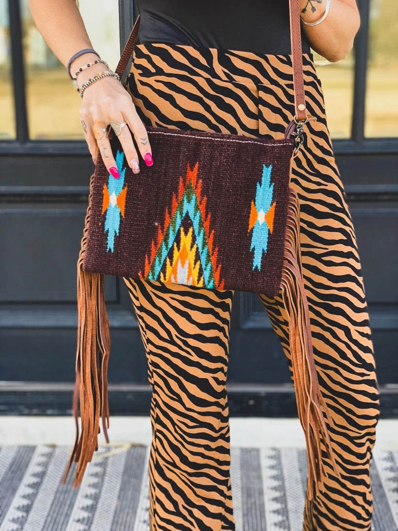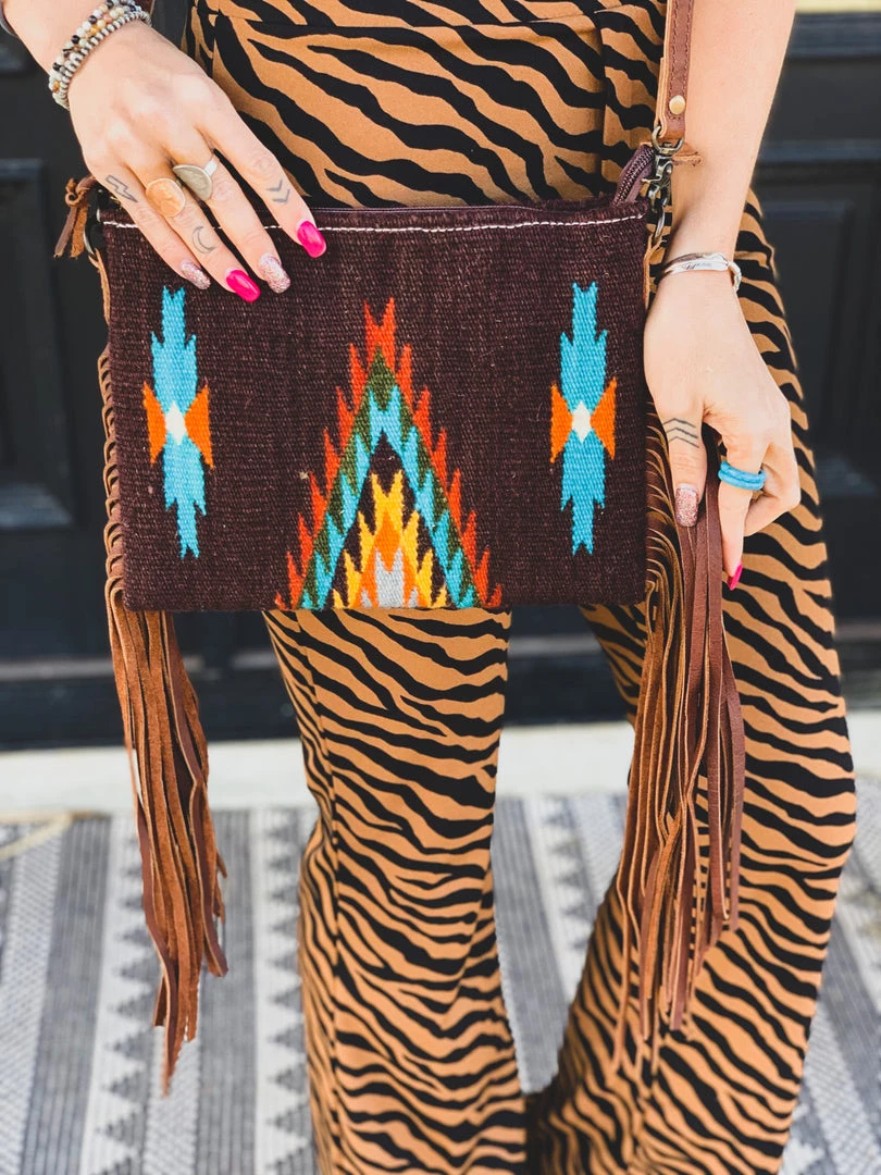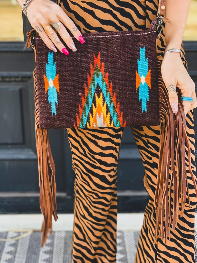 Gorgeous chocolate southwest saddle blanket aztec print crossbody purse with zipper top closure and brown leather fringe down each side. Crossbody features a southwest saddle blanket design with colors of chocolate brown, grey, orange, mustard, and turquoise. Purse comes with a fully adjustable removable leather strap, an interior open pocket, and an interior zipper pocket. Can be worn on the shoulder, crossbody, or without strap as a clutch.Â