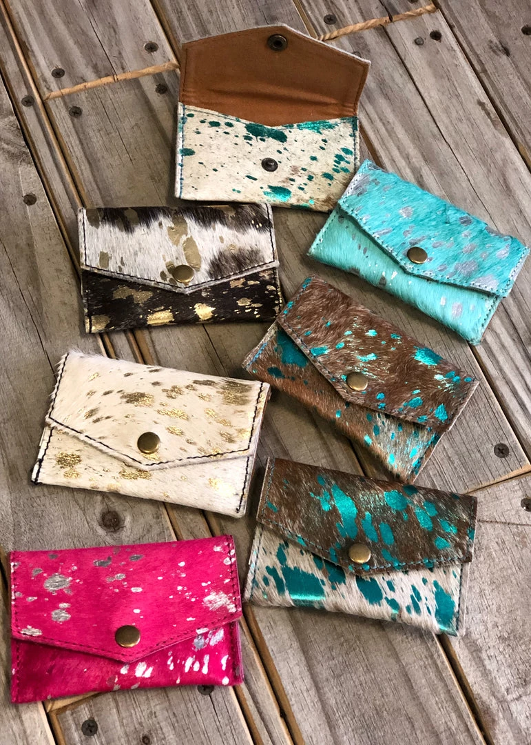 Envelope style hair on hide card holders with brass button snap closure. The perfect cowhide card holder for all your cash, debit/ credit cards, and I.D. All card holders feature metallic acid wash.