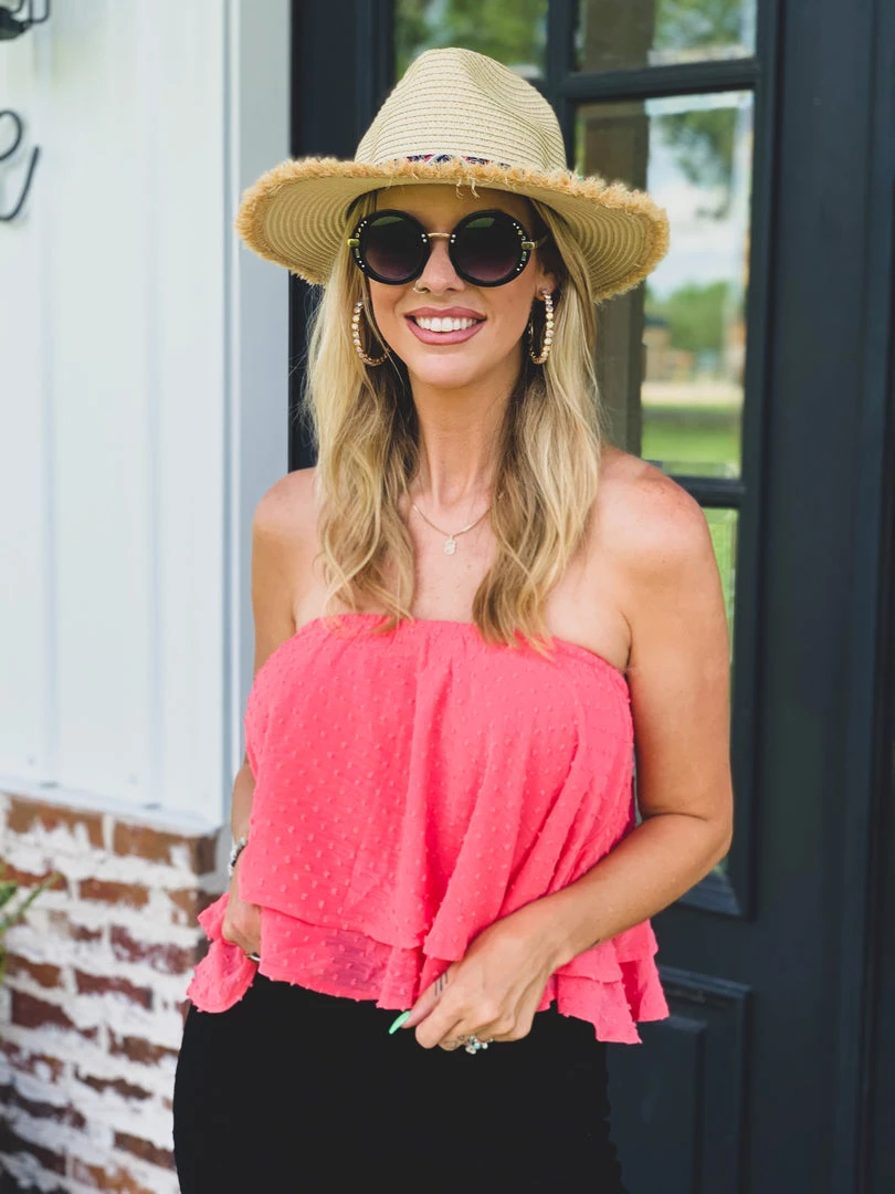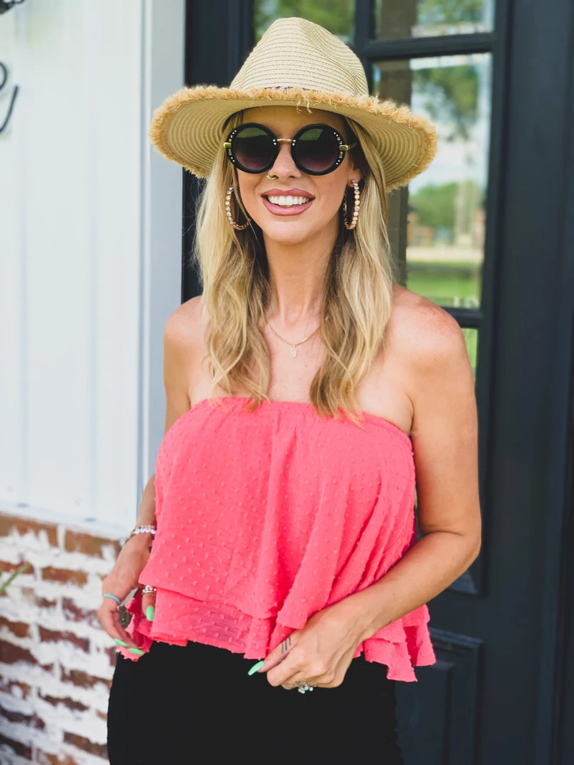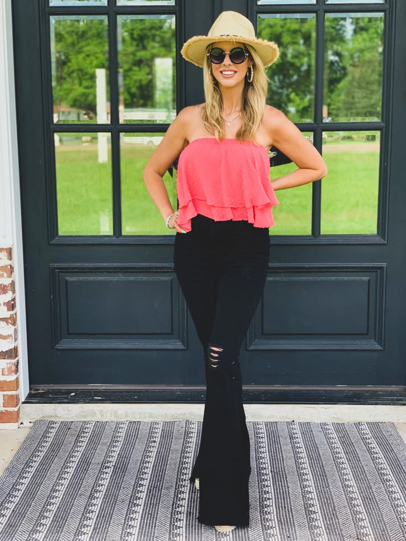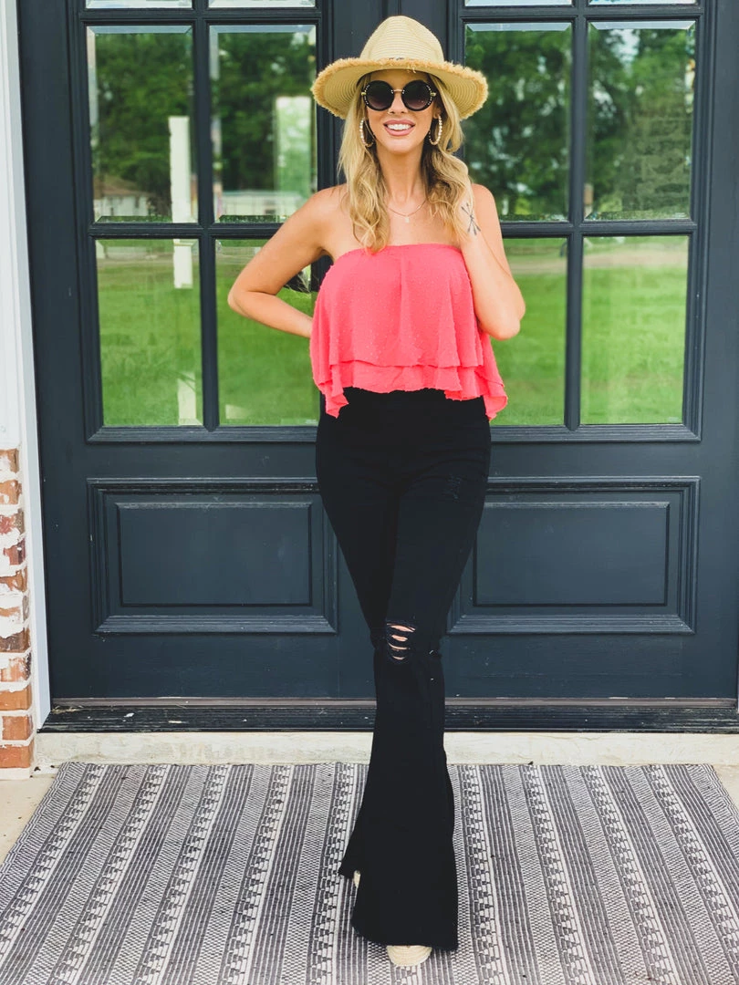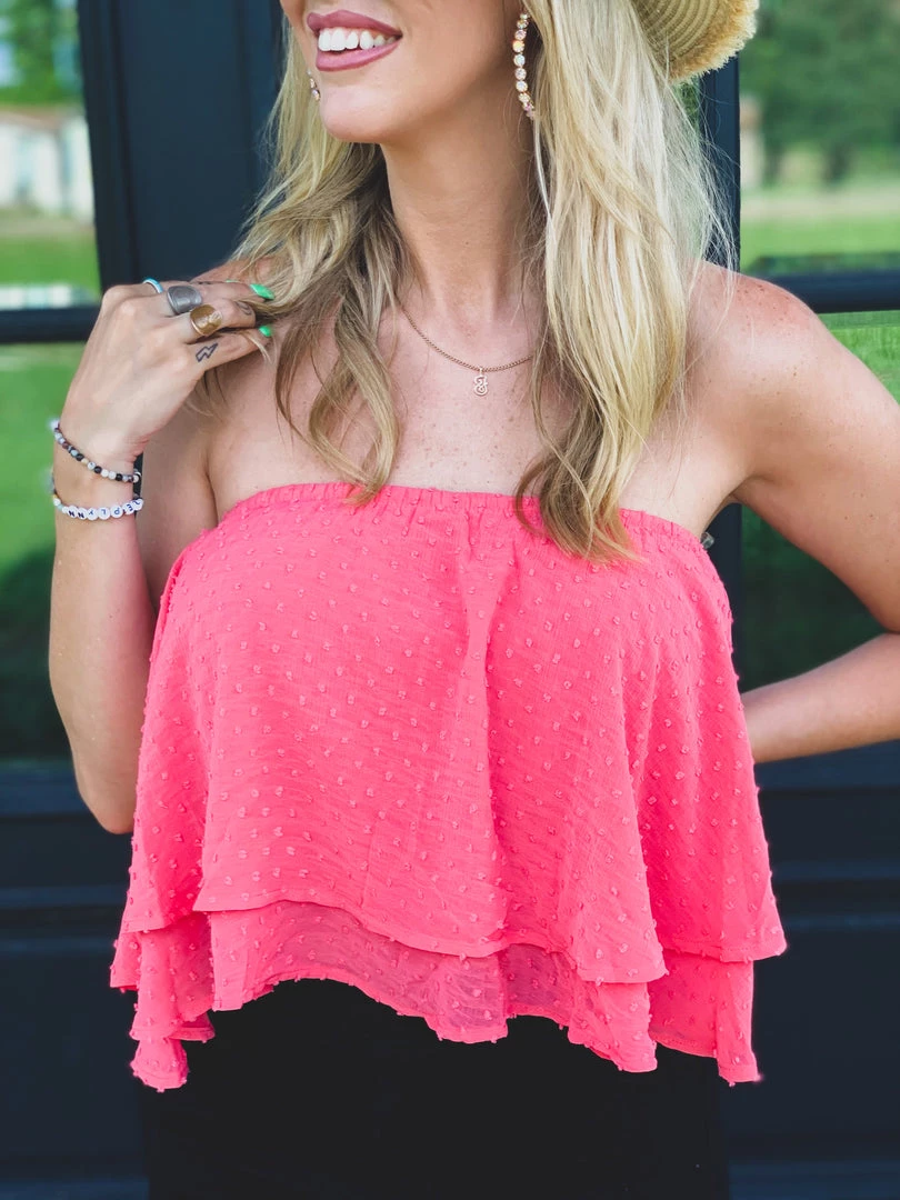 Coral tube crop top is a must for the Summer! Top features a swiss dot pattern, tube top style, elastic tube top hem, and two layers of ruffles. Top is light weight and flowy and perfect paired with your favorite bells or cut off jeans for date night or a casual day look!