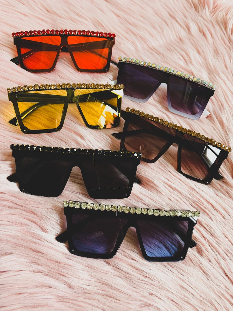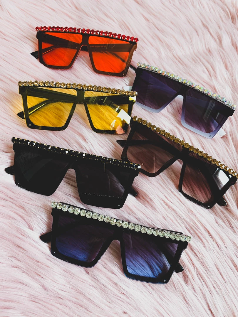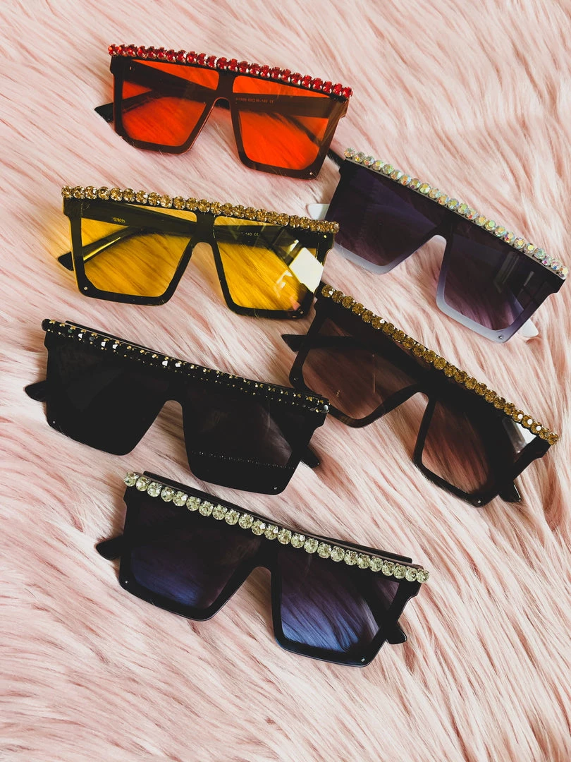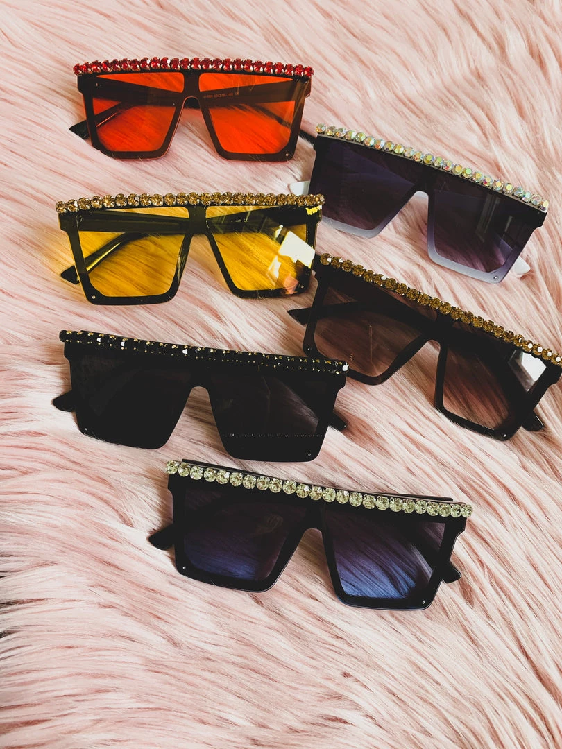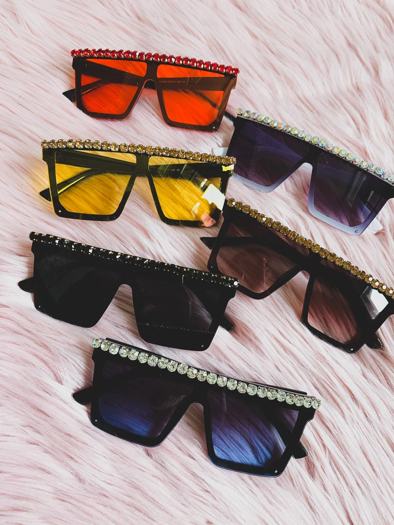 Classic fit rhinestoned sunglasses are our new go to’s. Glasses feature chunky rhinestone row on top of the frame and a cute classic fit.