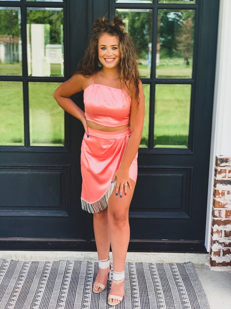 Glamorous pink two piece set is perfect for all your fun GNO. The top features non adjustable spaghetti straps, a silky material, is fitted, cropped length, and has a zipper back closure. The skirt is everything fabulous. Skirt features a tulip style, a smooth waistband, zipper back closure, is fitted, ruched front detail, and rhinestone fringe along the bottom of the skirt. Look and feel fabulous in this perfect set!