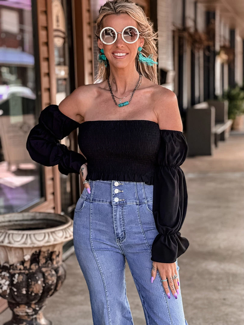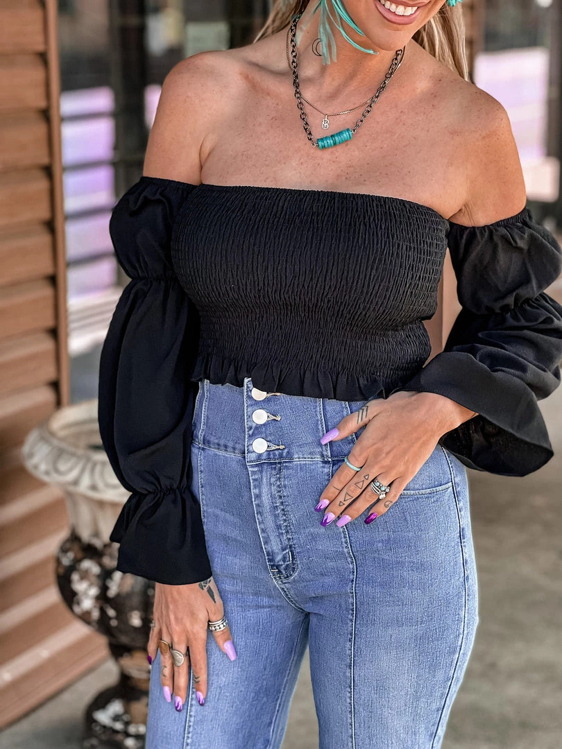 - Off shoulder style, smocked body with ruffle hem, cropped length, bubble style sleeves with elastic wrist cuff