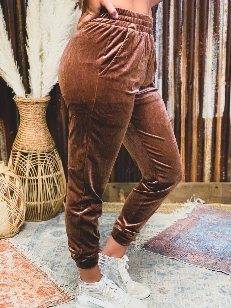 - Brown high-waisted velvet joggers with side pockets and buttery soft fabric