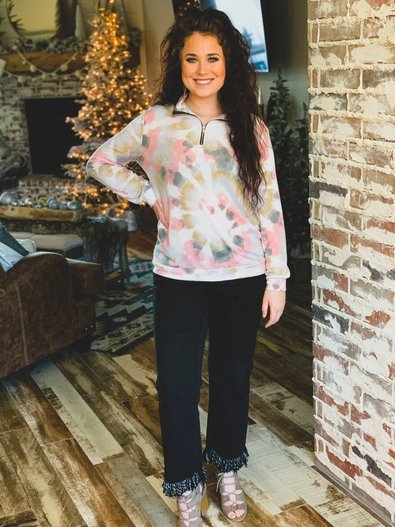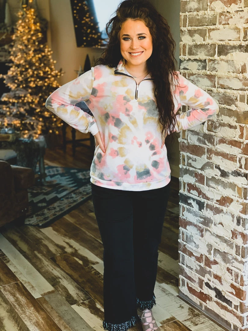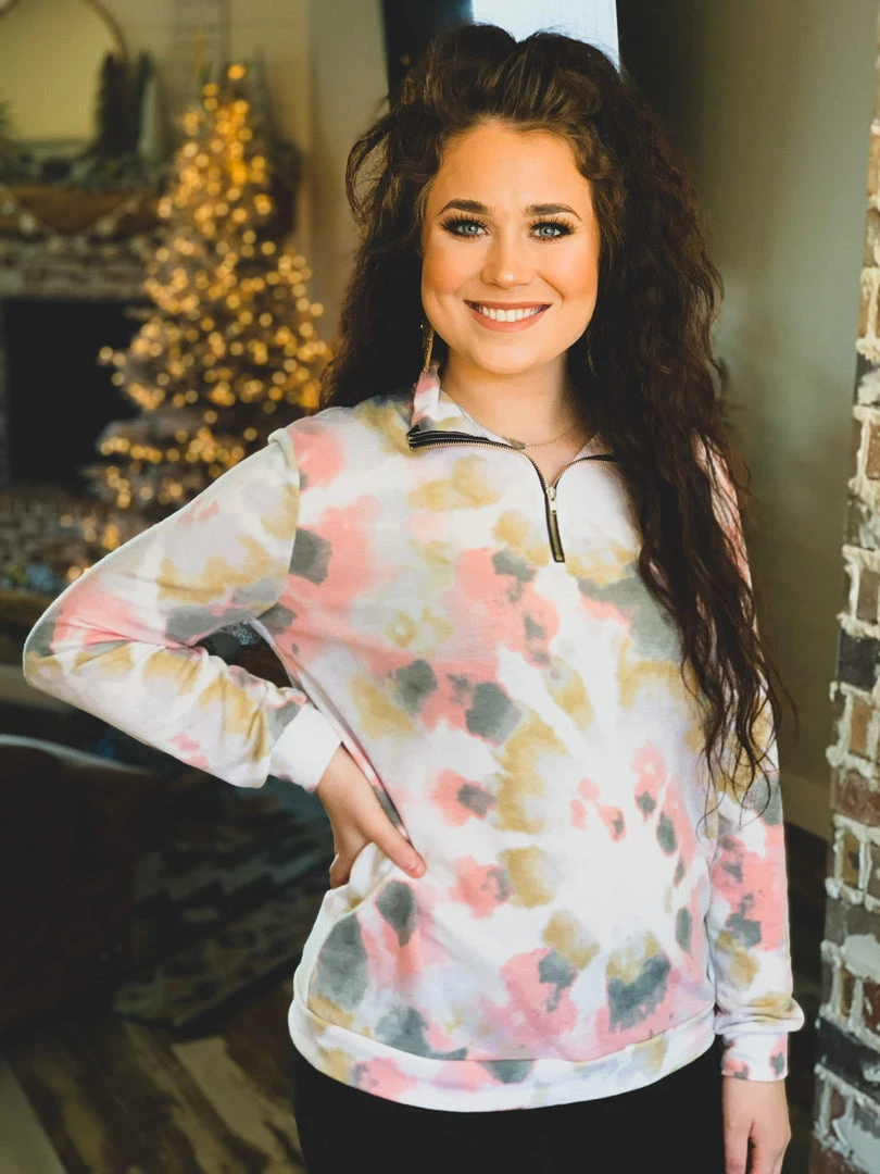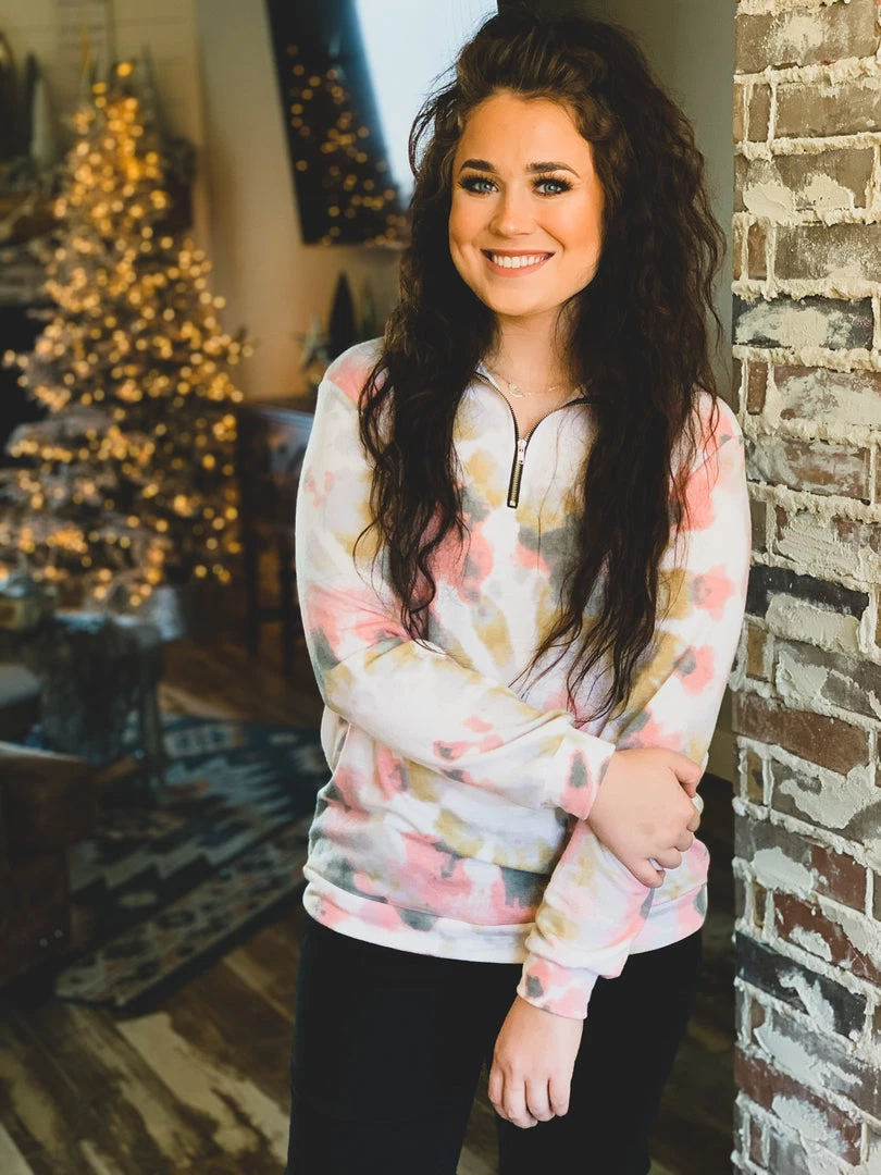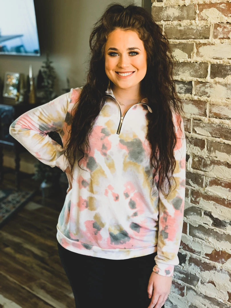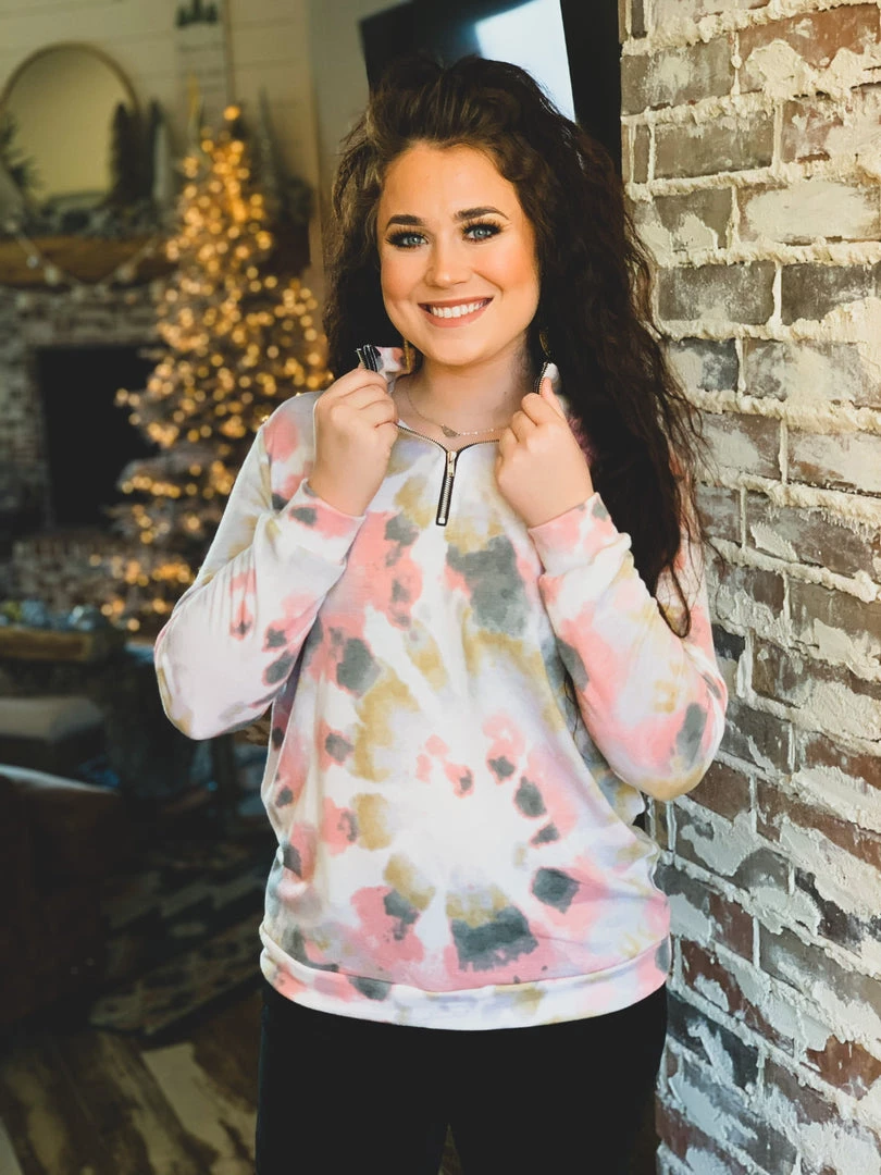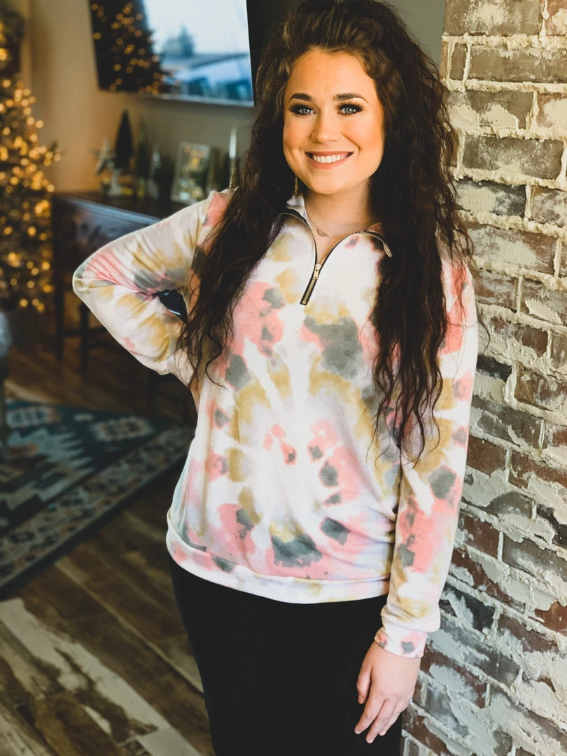 Taupe/blush pink colored tie dye pullover is the perfect top for Fall. Top features a mock collar, 1/4-length zipper from chest to chin, and comfy long sleeves. Top is a generous fit, soft, and stretchy. Great for a casual Fall look with your favorite denim skinnies or bell bottoms.Â