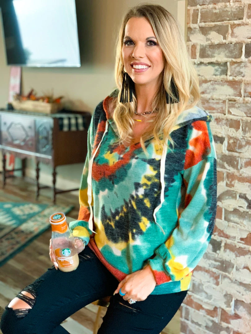 Green tie dye knit pullover is perfect for all your Fall outfits! Pullover features cream adjustable draw strings, hooded, long sleeves, and a raw cut v-neckline. Pullover has shades of green, grey, and coral/ peach. Hoodie is light weight and super soft!