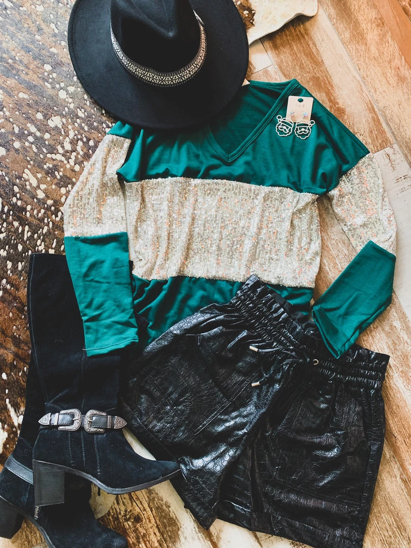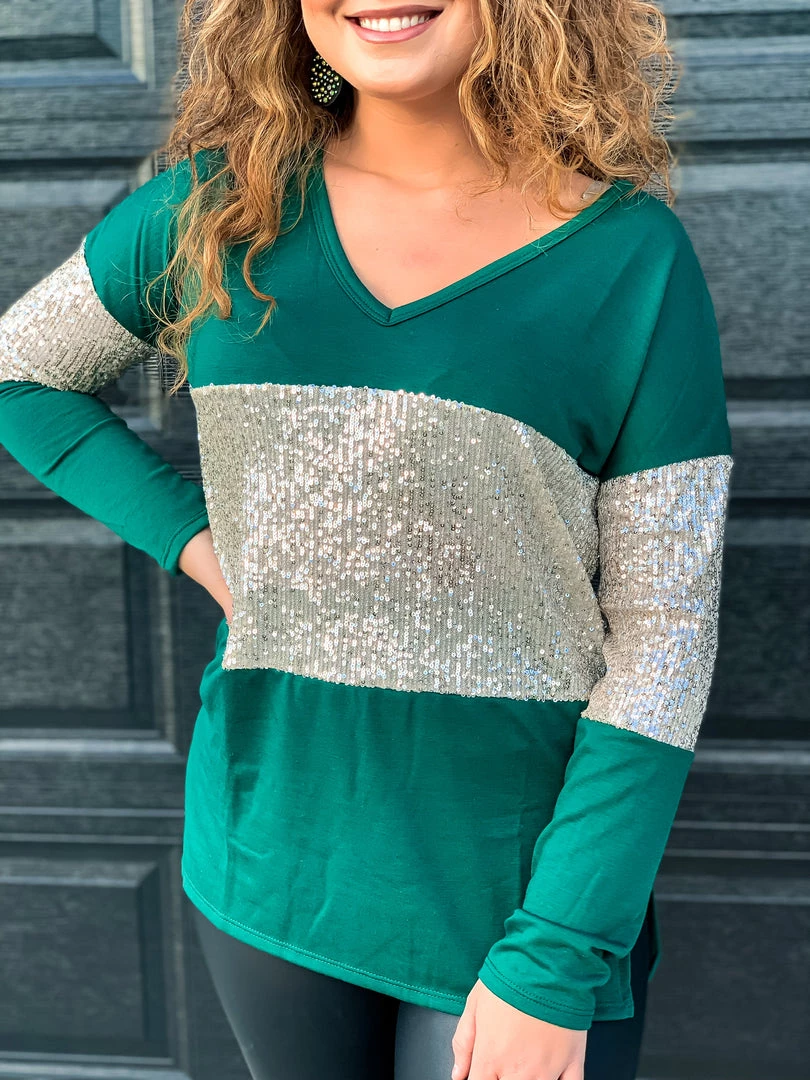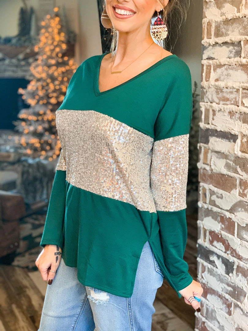 Hunter green and silver sequin color block long sleeve top is perfect for the holidays! Top features a beautiful deep hunter green color, long sleeves, a v-neckline, side slit detail on each side, and silver/champagne sequins on the front and throughout the back of the top and on the sleeves. Such a classy, cute, perfect top of the Holidays, for work, and any special events!