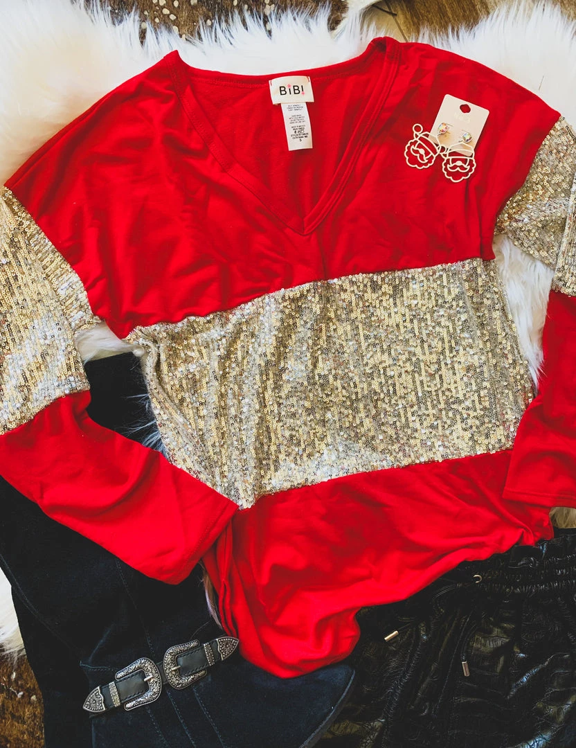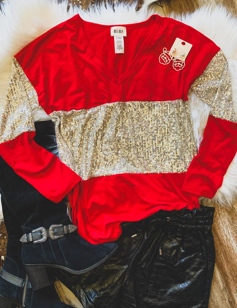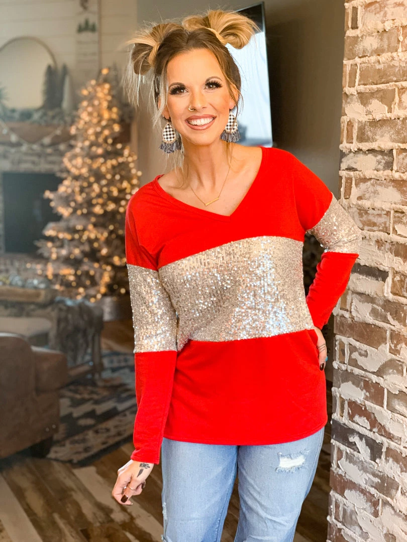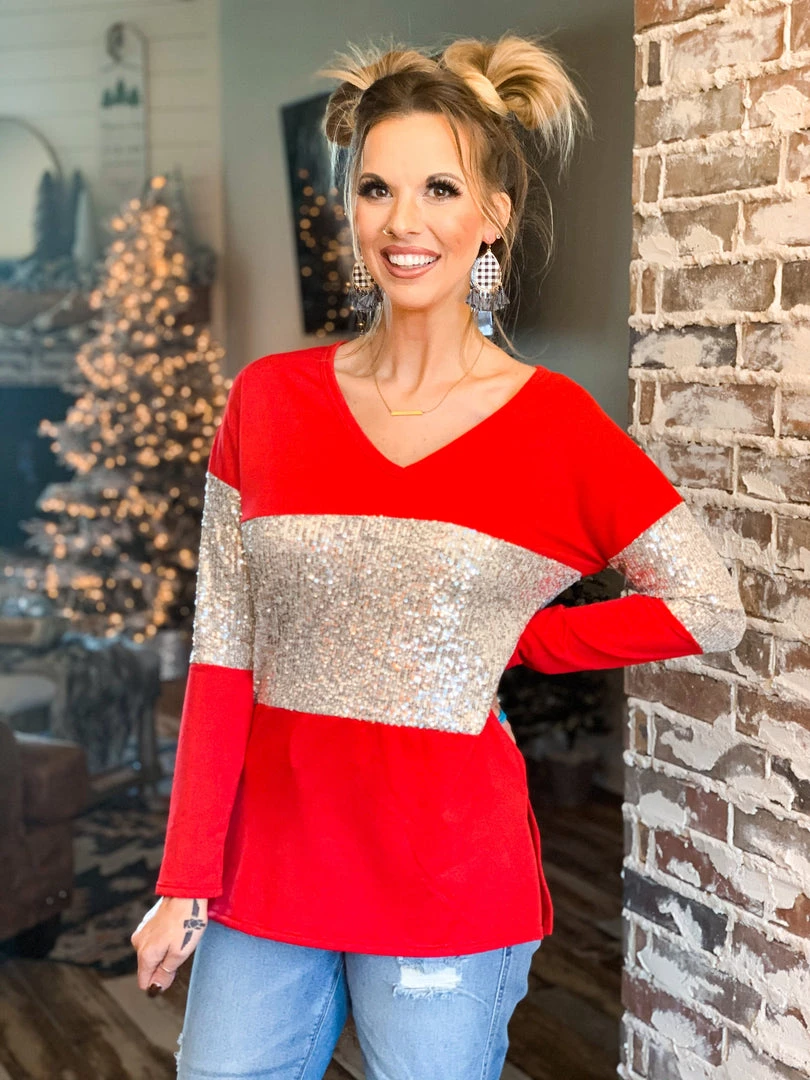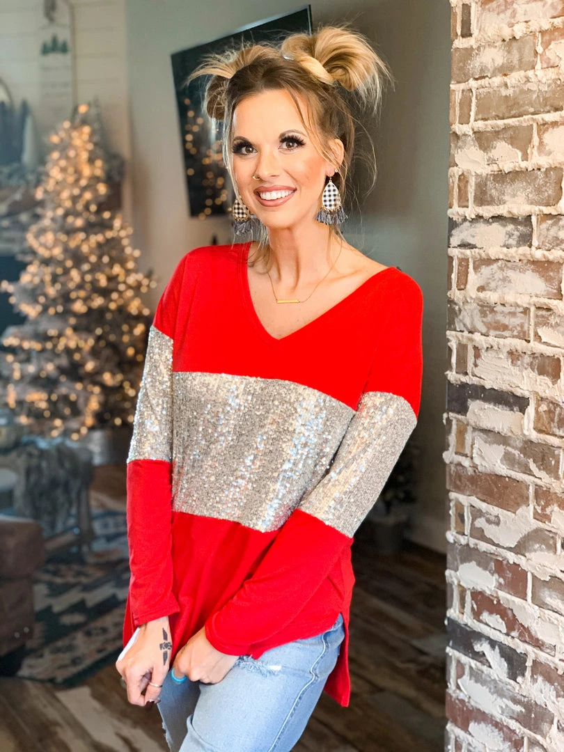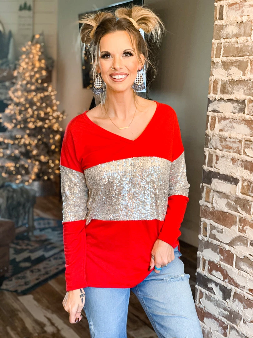Red and silver sequin color block long sleeve top is perfect for the holidays! Top features a beautiful deep red color, long sleeves, a v-neckline, side slit detail on each side, and silver/champagne sequins on the front and throughout the back of the top and on the sleeves. Such a classy, cute, perfect top of the Holidays, for work, and any special events!