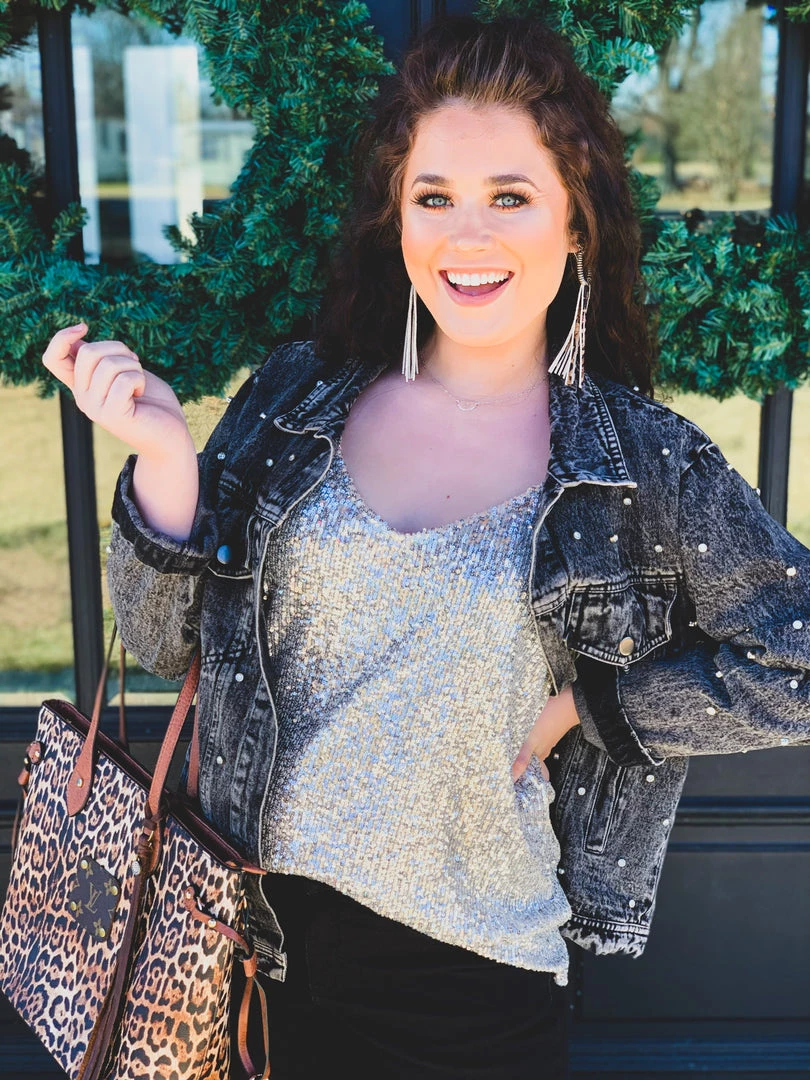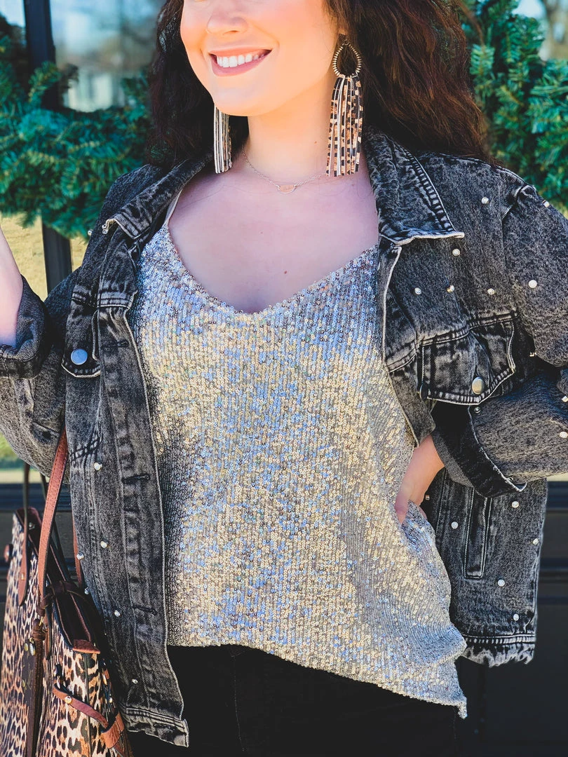 Soft gold sequin spangle fit tank top is perfect for the Holiday season and perfect for nights out on the town. Top is fully sequined, has some stretch, cami spaghetti straps that are not adjustable, and has a flowy flattering fit. Tank it a complete SHOW STOPPER. We love it paired with leather leggings or distressed denim skinnies!