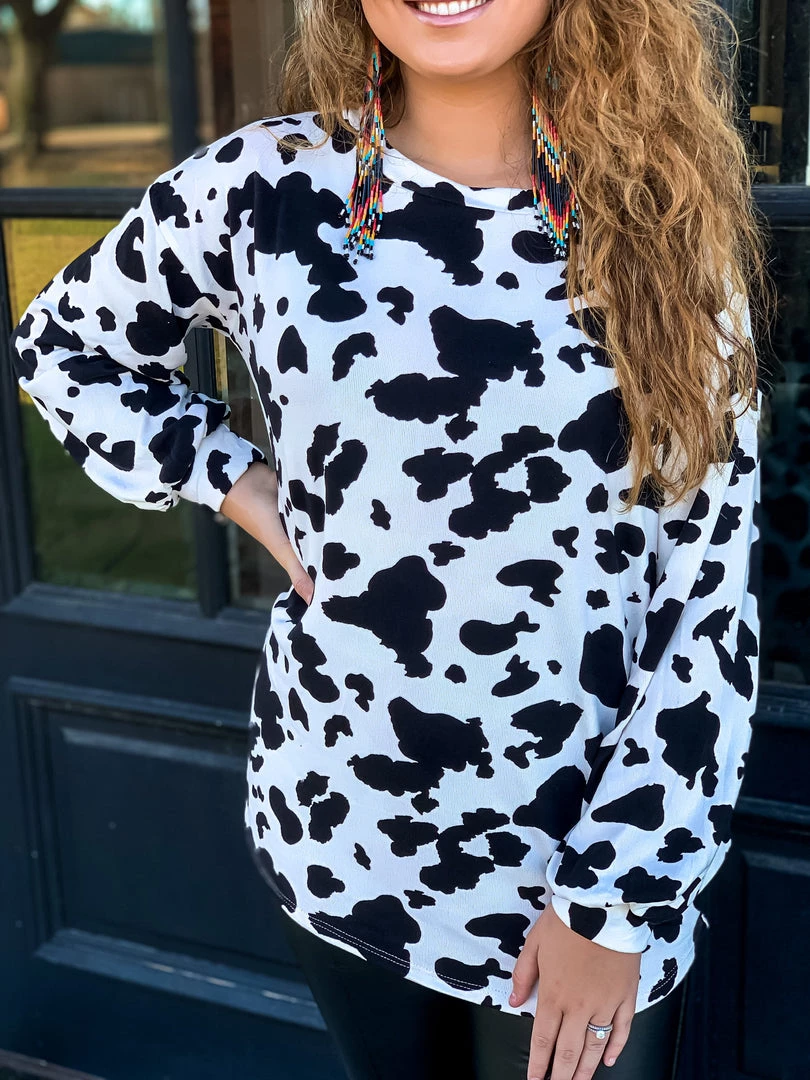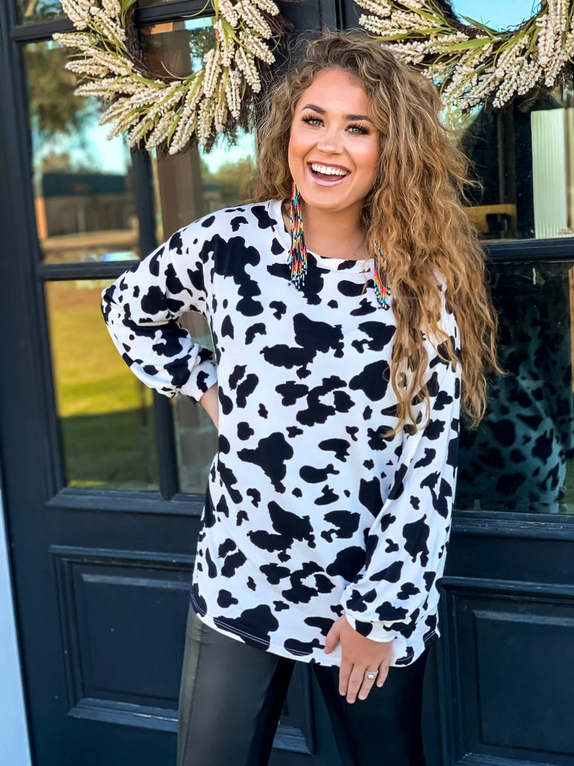 Trendy black and white cow print top is a must have in your Fall wardrobe! Features a trendy all over black and white cow print pattern, buttery soft material, long sleeves with a elastic wrist cuff, and a cute roomy fit. Perfect to pair with leggings or denim!