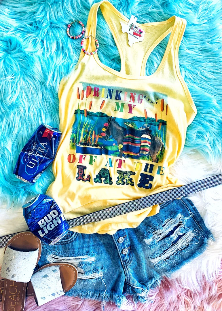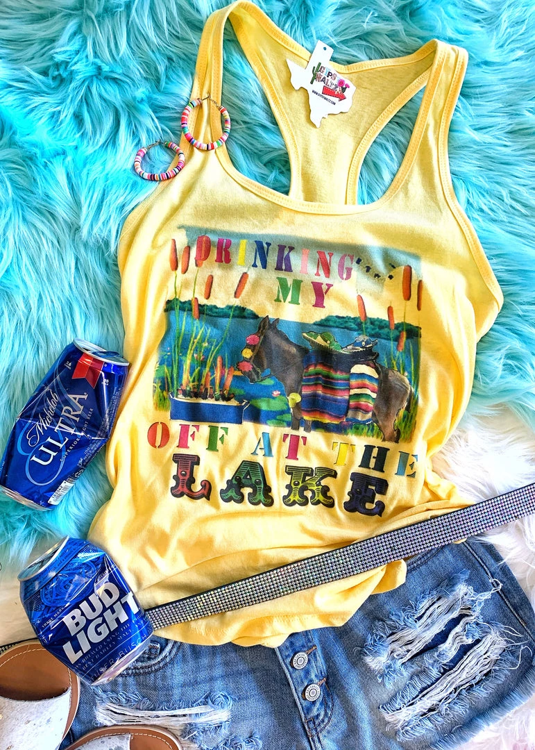 Yellow women’s fit tank top features the colorful fun quote, “Drinking My (*image of a DONKEY)(a**) Off At The Lake” and the graphic of a colorful fiesta donkey at the lake. Tank is the perfect lake day tank top to pair with denim shorts or over your swim suit.