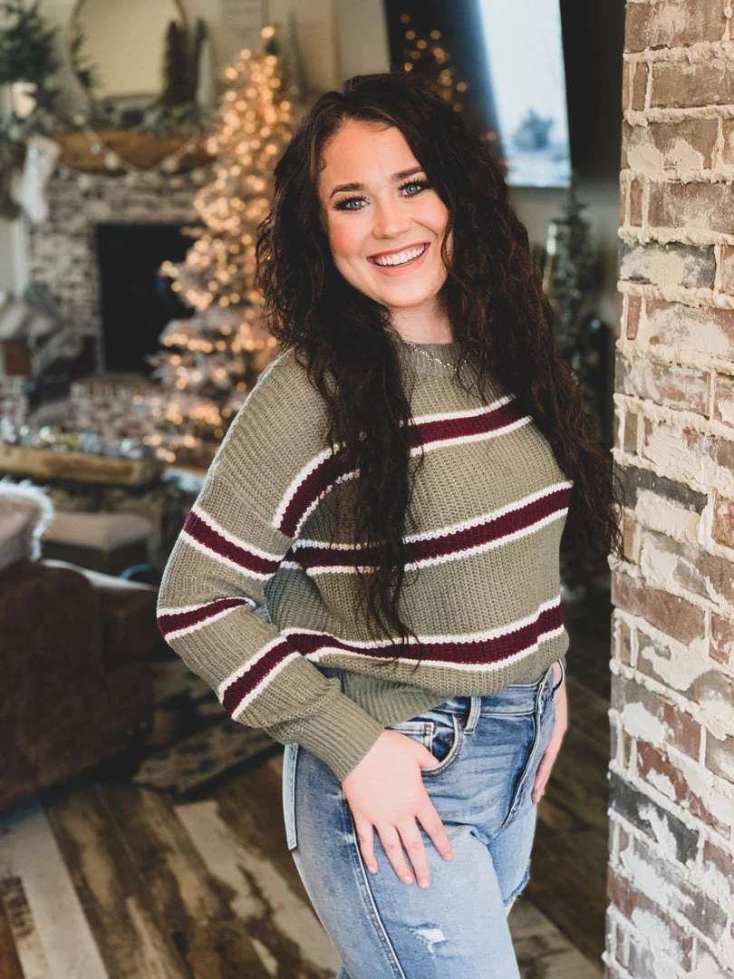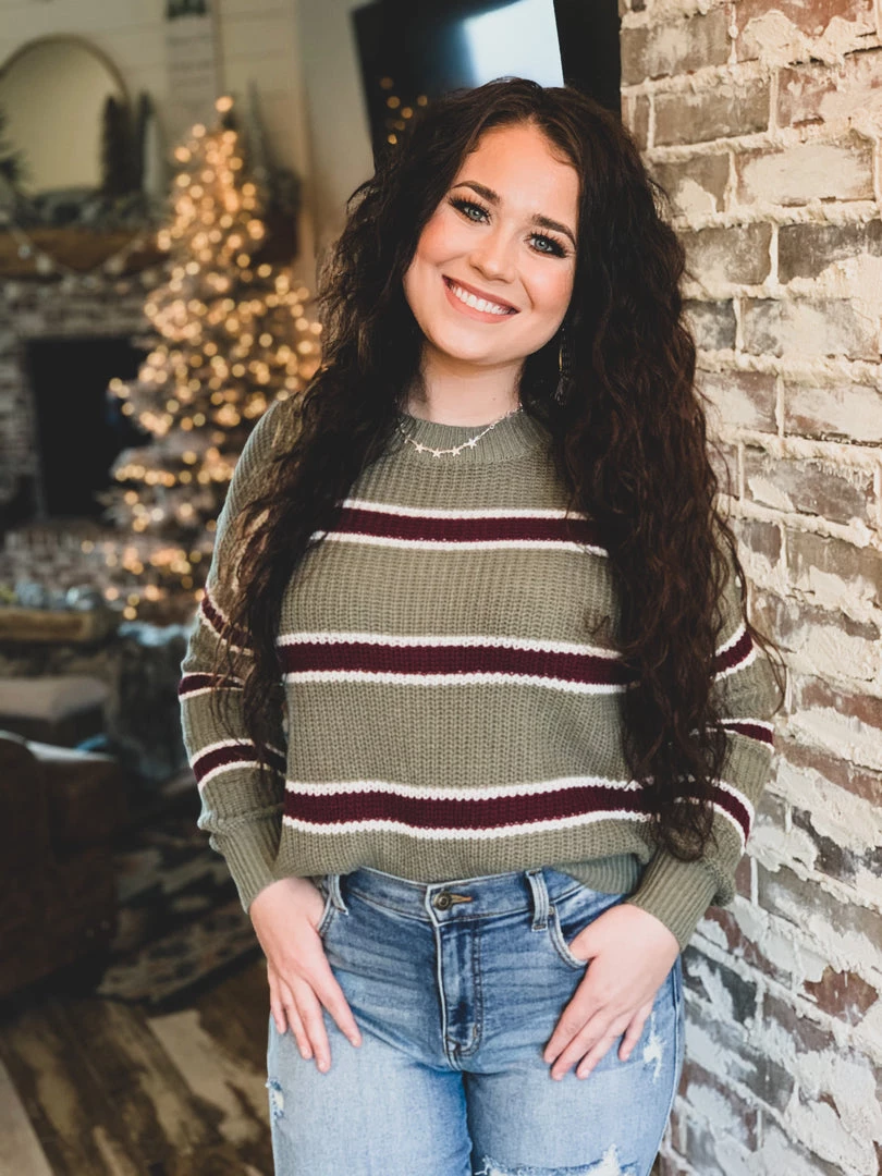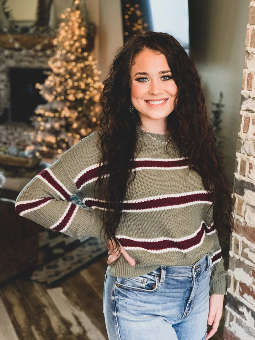 Olive green and maroon striped sweater is such a cute piece to have in your closet! Sweater is a knit material, long sleeves, and has a long crop length. So cute to pair with our Mesquite pants!