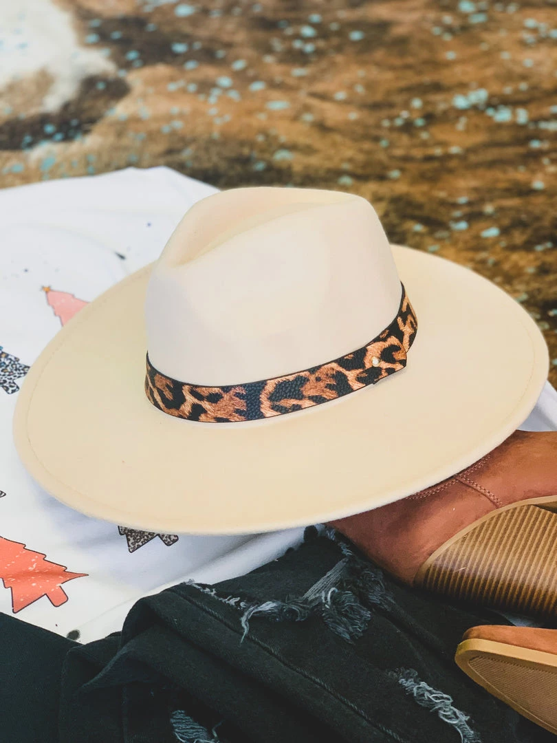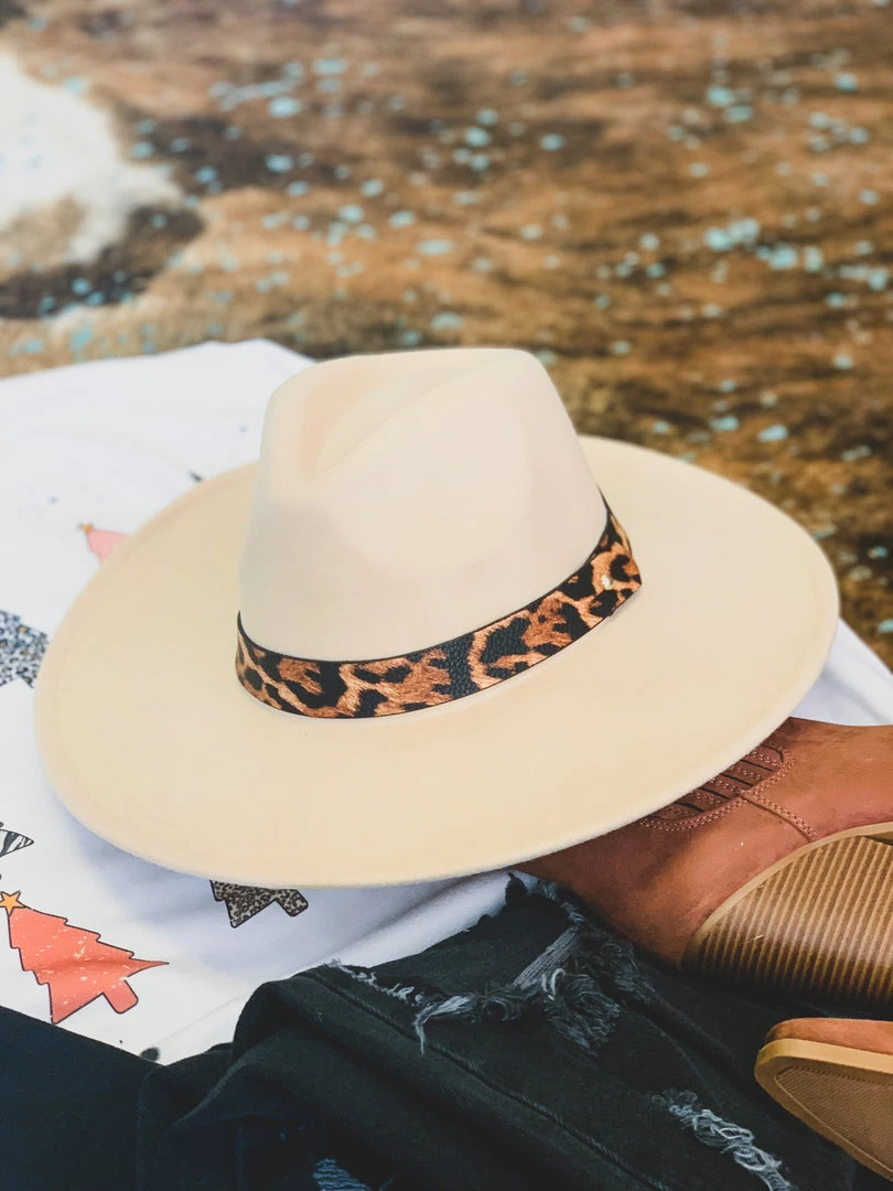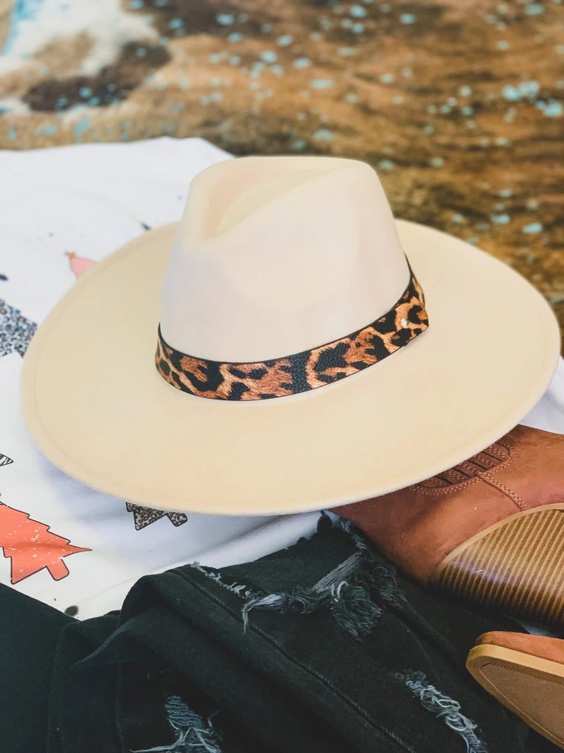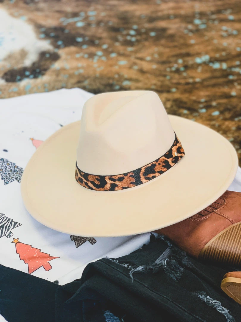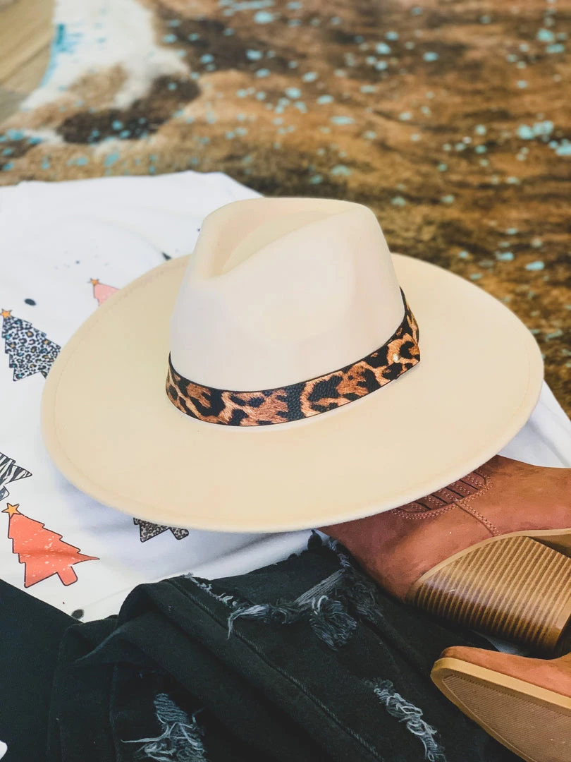 ONE SIZE beige tan colored wool felt hat with a pinched front crown. Hat features a faux leather brown leopard print colored hat band. We ADORE this hat! It is one size, but features an adjustable inner drawstring pull for sizing. SO perfect to pair with our Garland Sweatshirt, Blanco Pants, Novice Earrings, and Brundage Bootie for the complete holiday look!