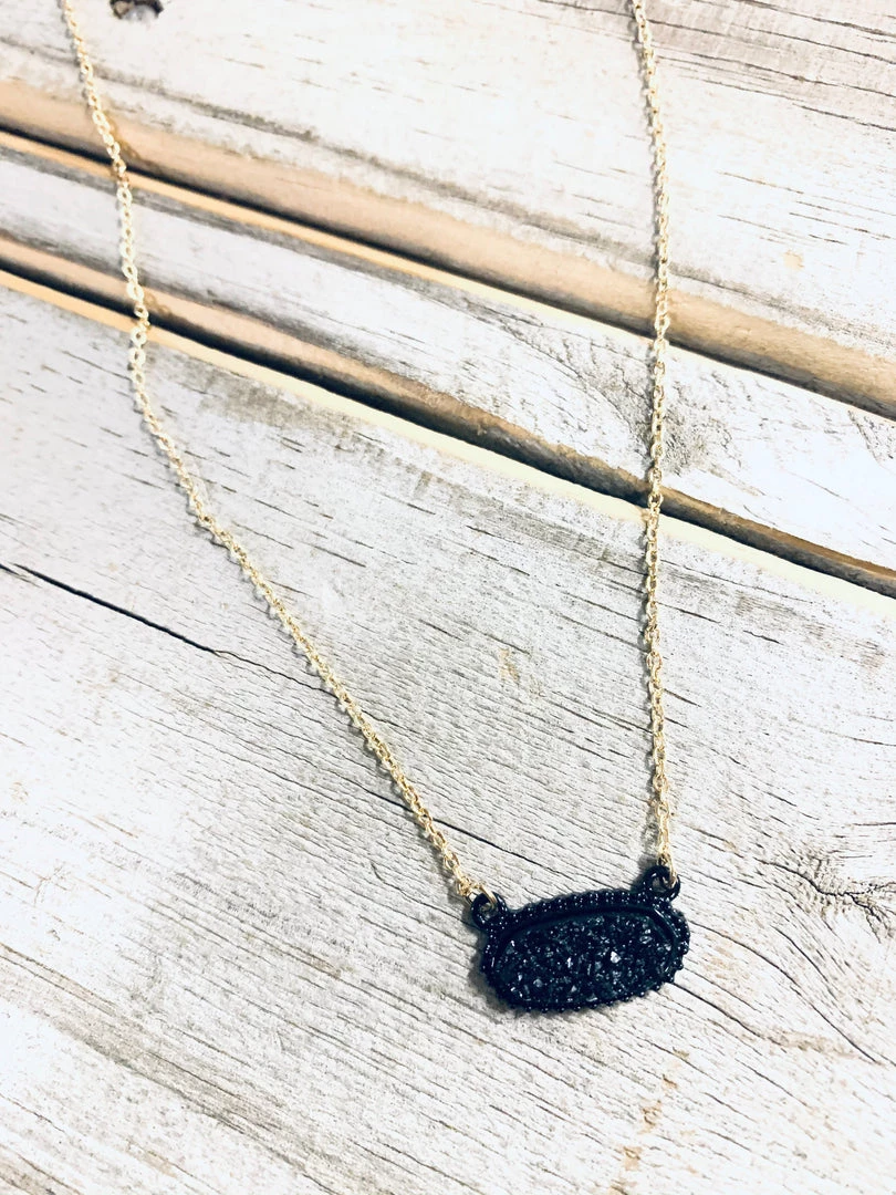Cute dainty black druzy stone in a black metal setting on a gold chain. Necklace is light weight and perfect for layering. Such a sweet necklace or the perfect gift!