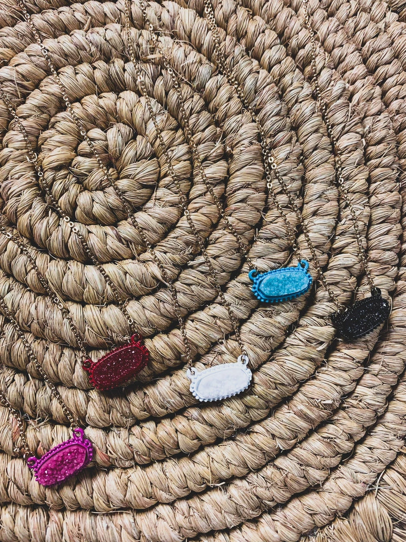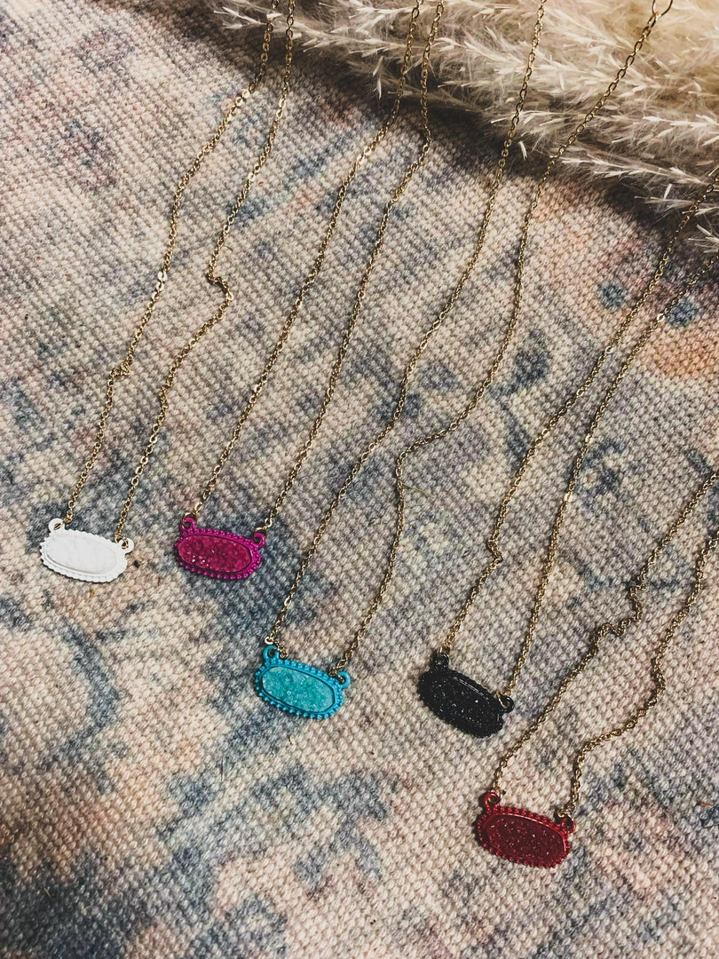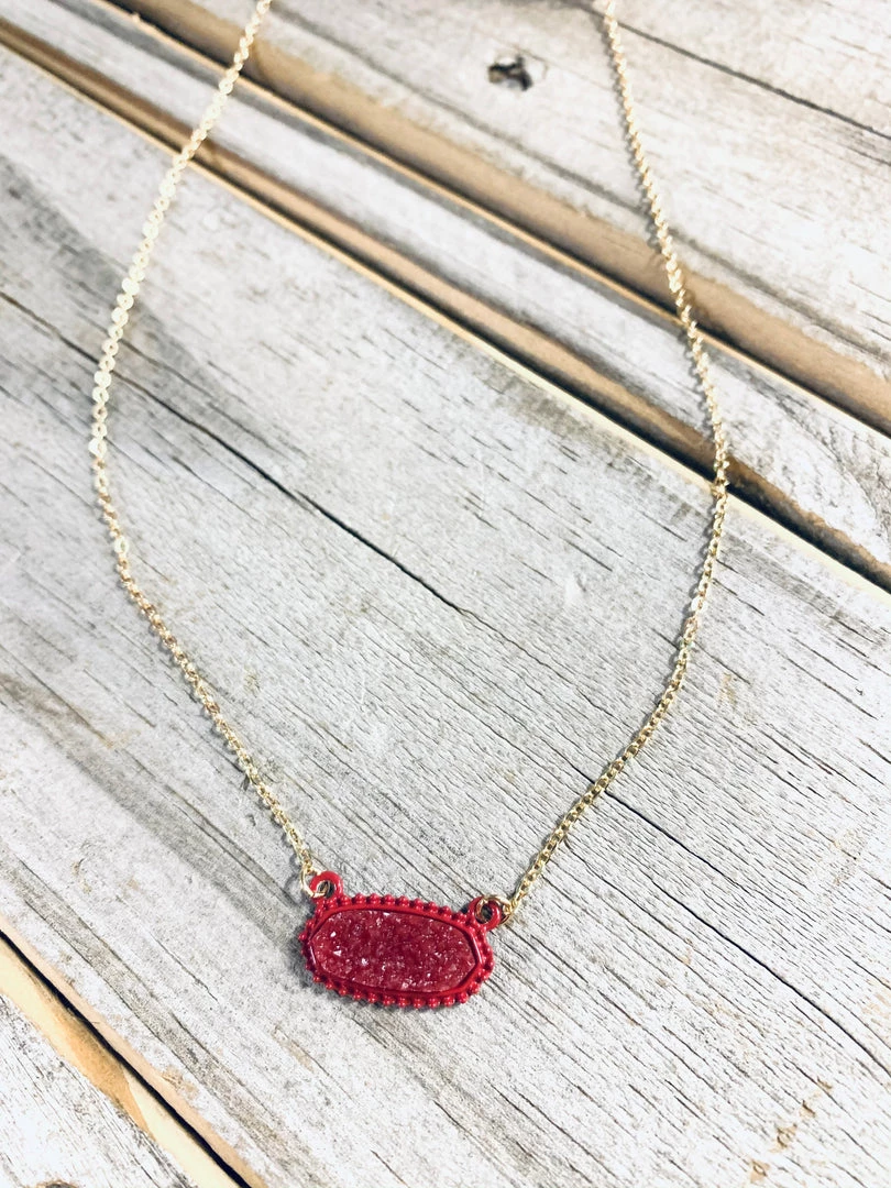 Cute dainty red druzy stone in a red metal setting on a gold chain. Necklace is light weight and perfect for layering. Such a sweet necklace or the perfect gift!