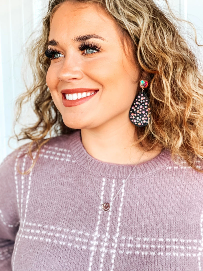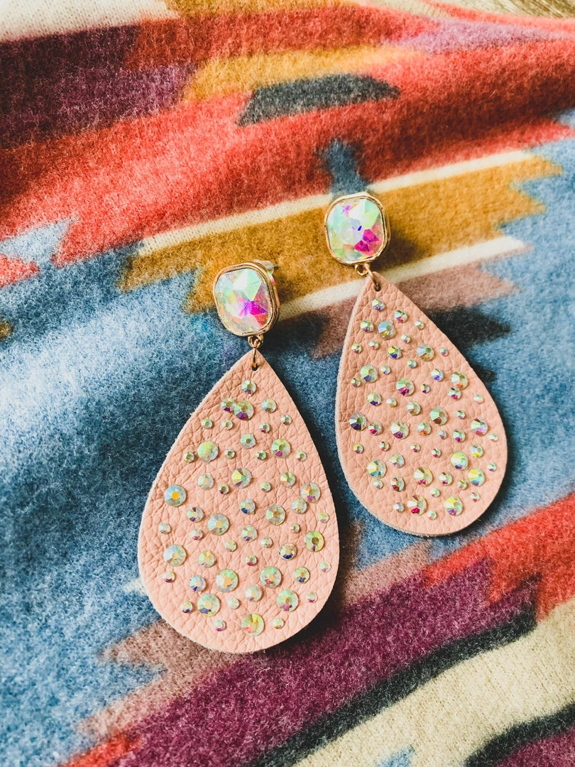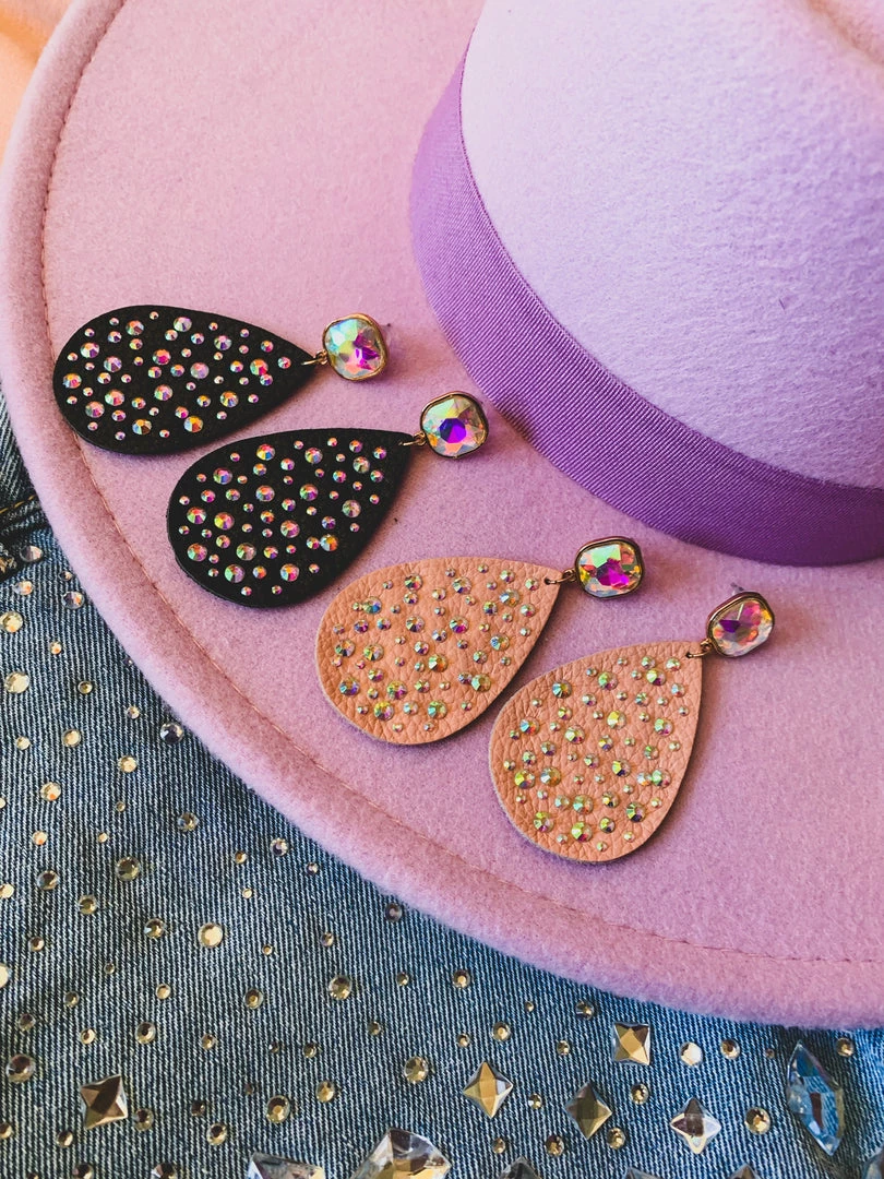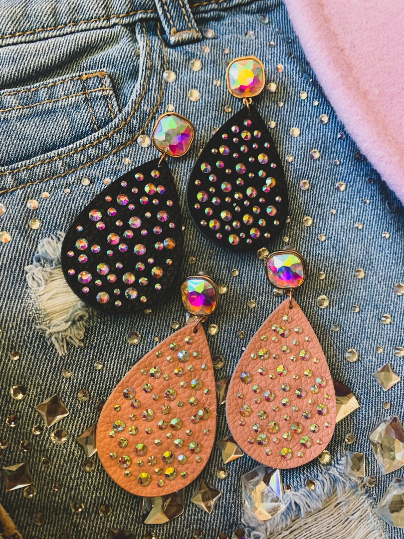 Beautiful rhinestone earrings are perfect to pair with your Fall looks! Features a teardrop shape leather earring with iridescent rhinestones on an iridescent rhinestone post. Such a cute light weight earring!