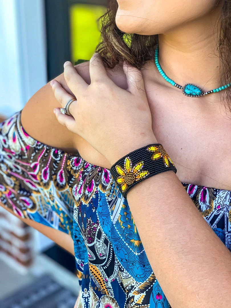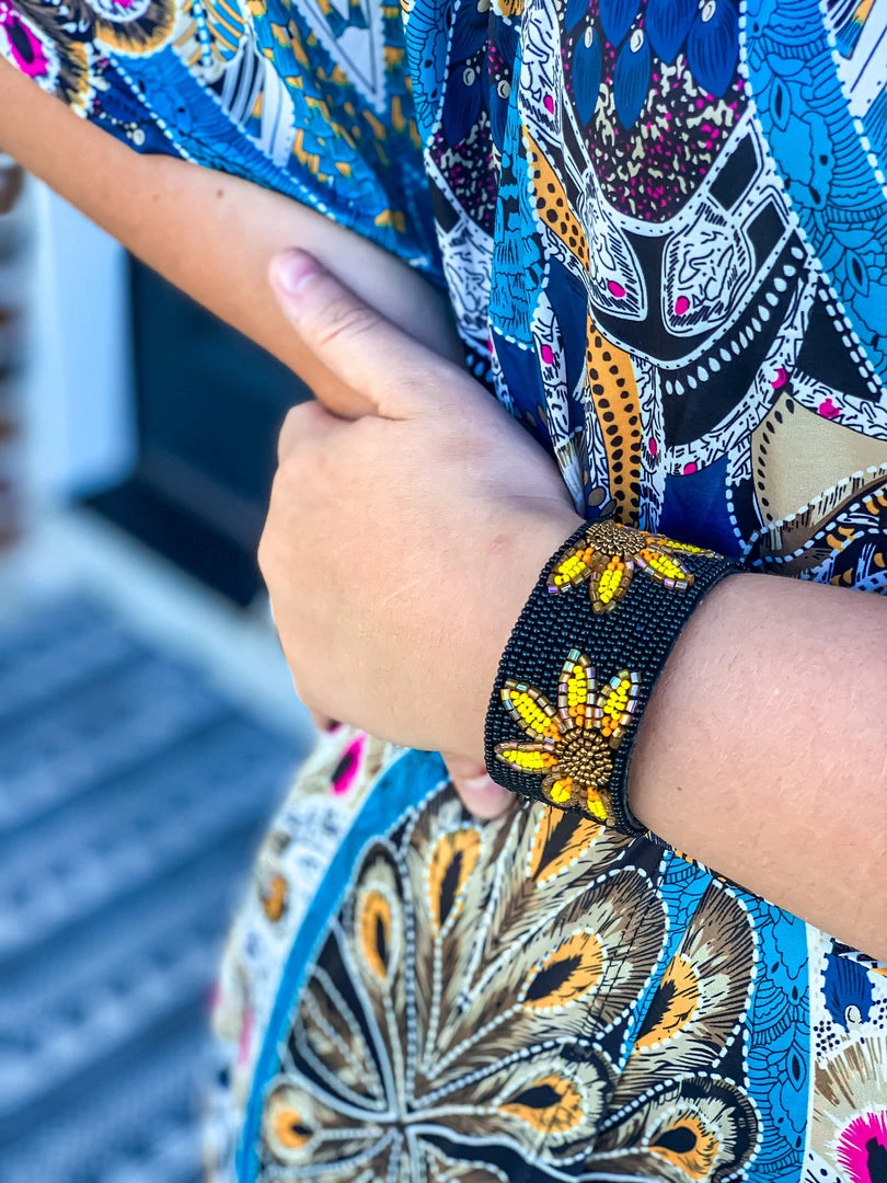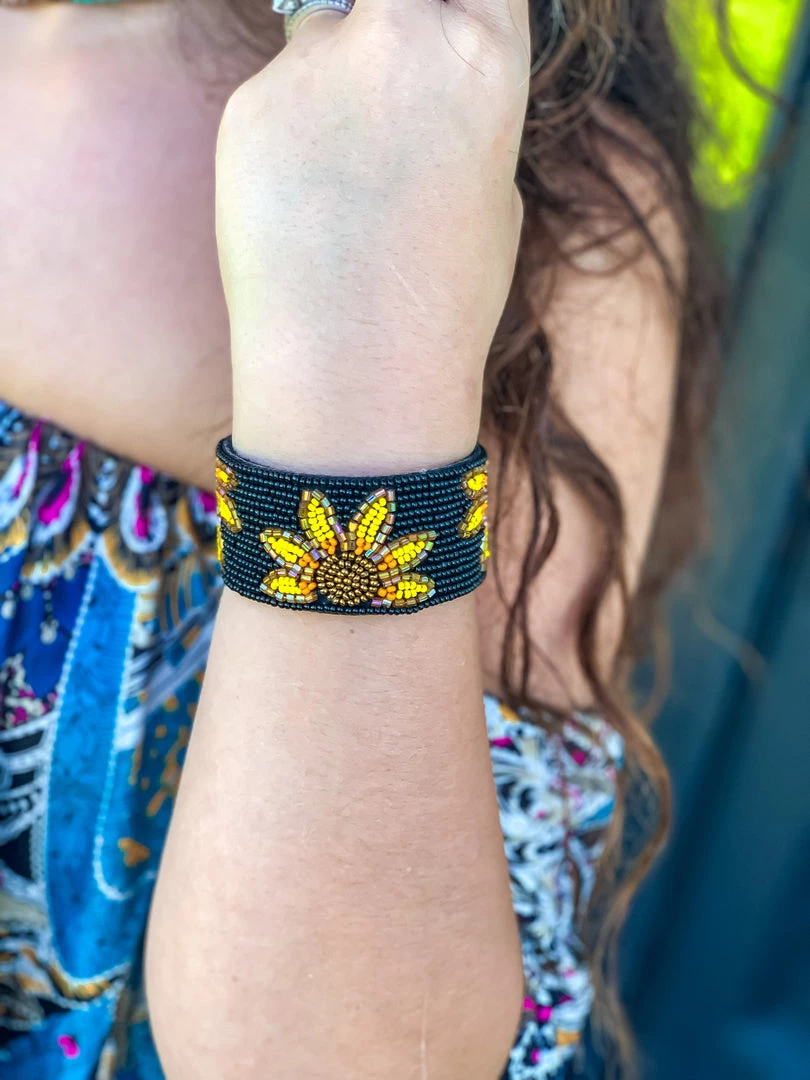 Fully beaded sunflower bracelet cuff is so cute for all year round! Bracelet if fully beaded and features a yellow sunflower.
