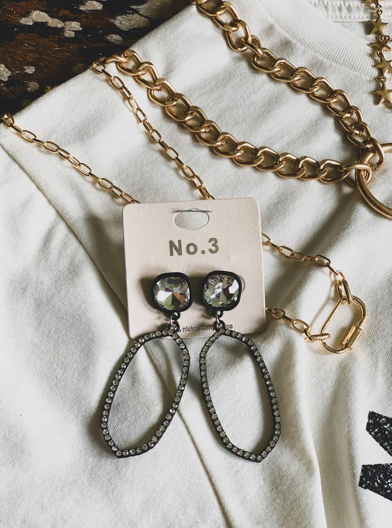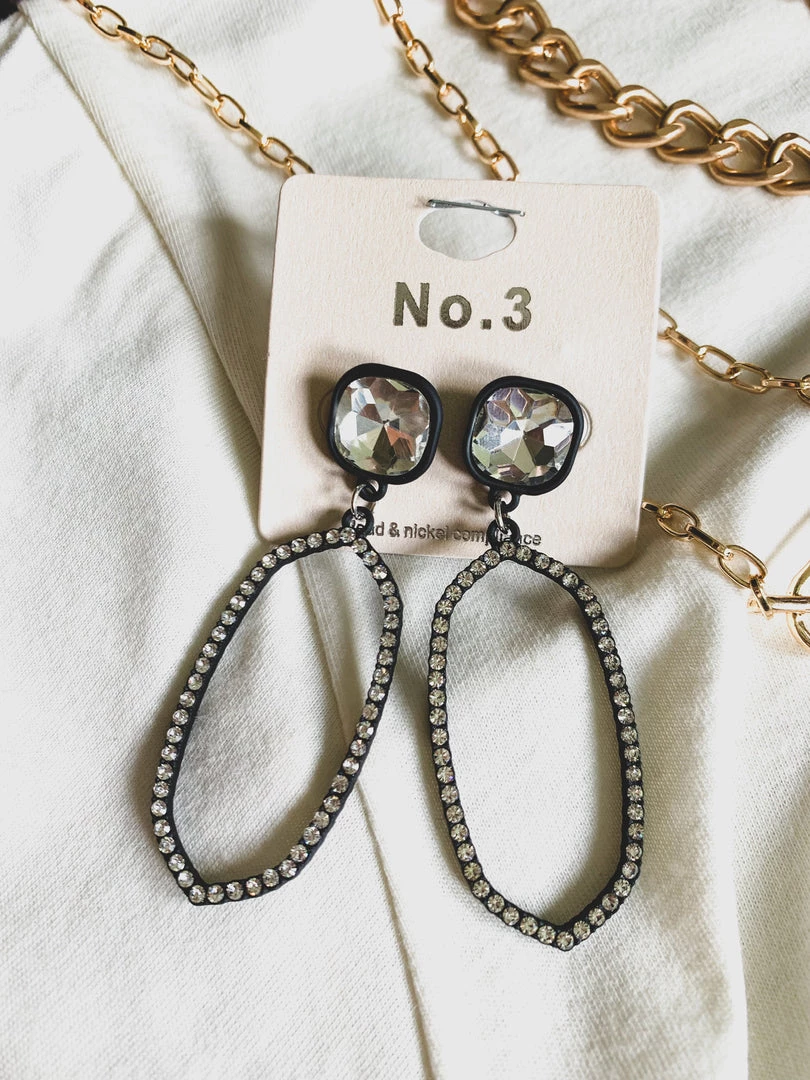 Black polygon oval shape hollowed out earring with crystal rhinestones. Earrings are hollow and is on a rhinestone post set in a black setting. Perfect lightweight earring for all your looks!