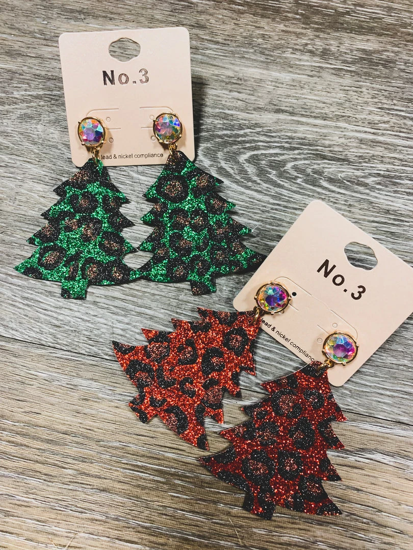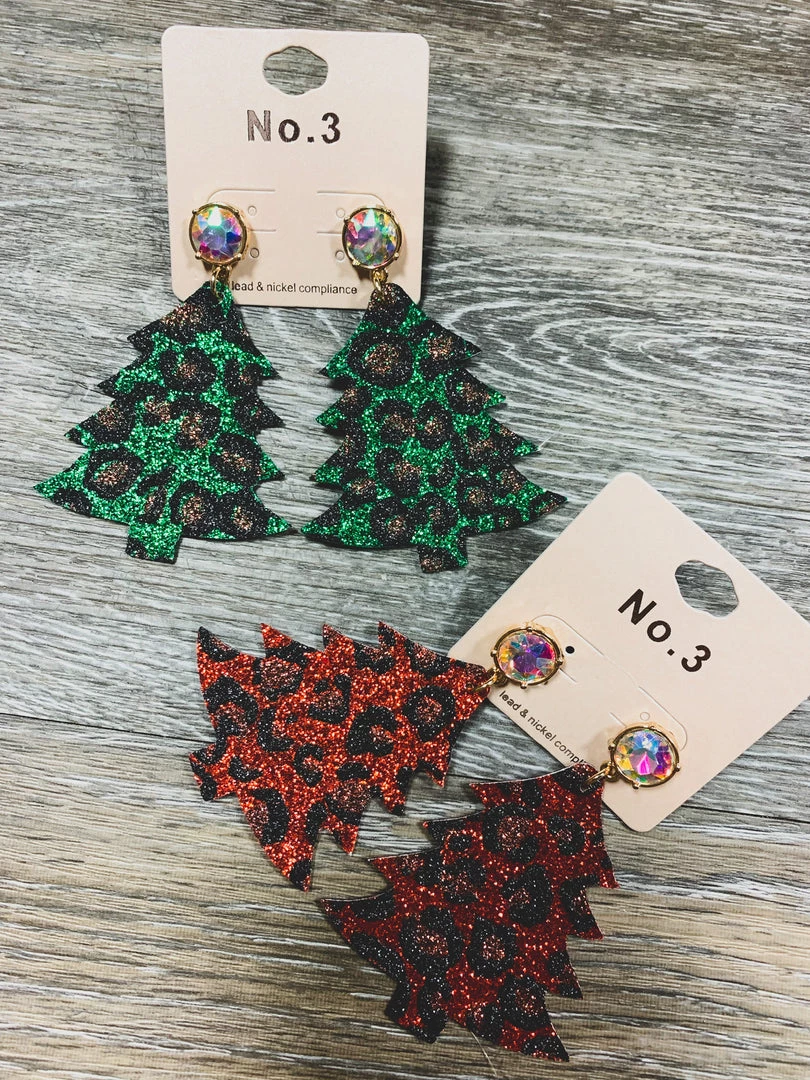 Red or green glitter leopard print Christmas tree earrings are the perfect touch to your Holiday looks! Features a Christmas tree leather shape, glitter leopard print, and is on a iridescent rhinestone post. So fun and super cute!