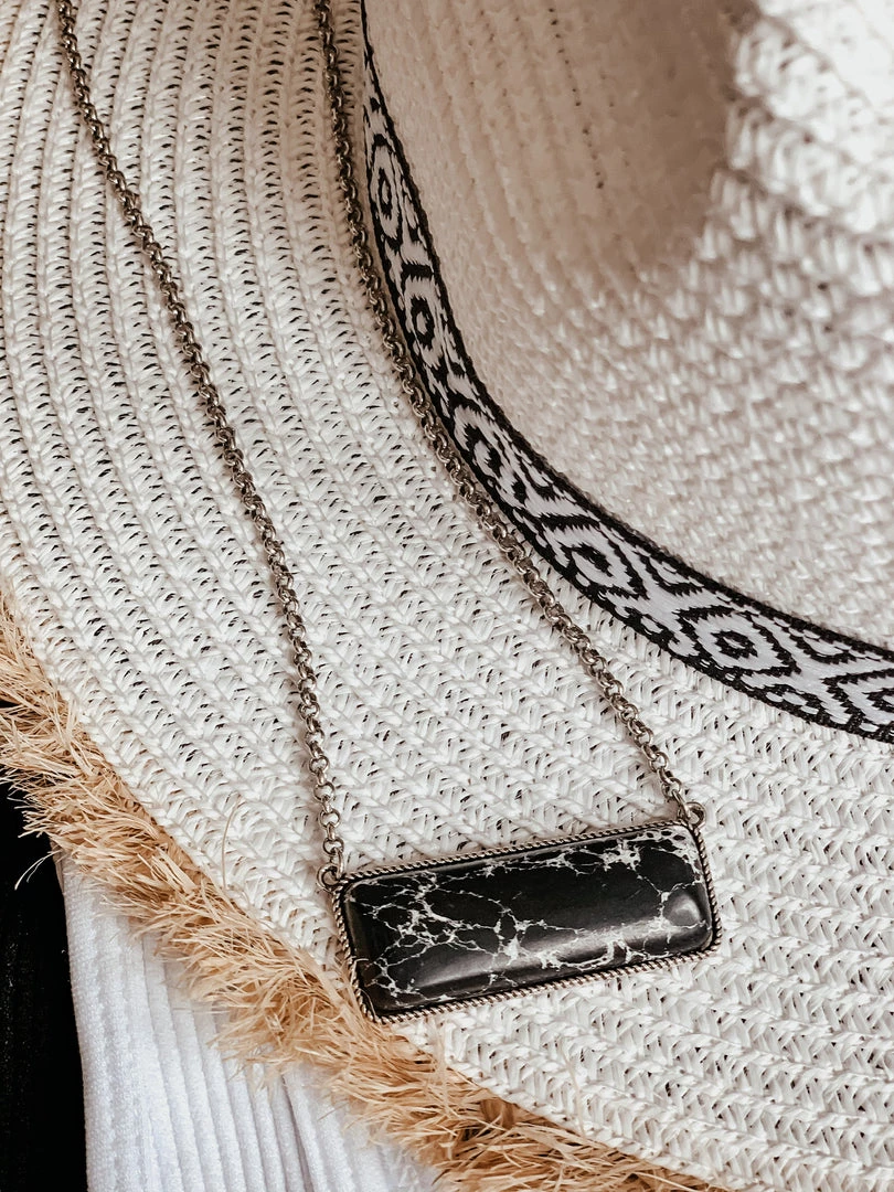 Rectangle black stone set in an antique silver setting. Necklace is on a beautiful chain with a lobster claps and adjustable links. Not all black rock stone pattern will be the same. Such a cute necklace to wear and layer!