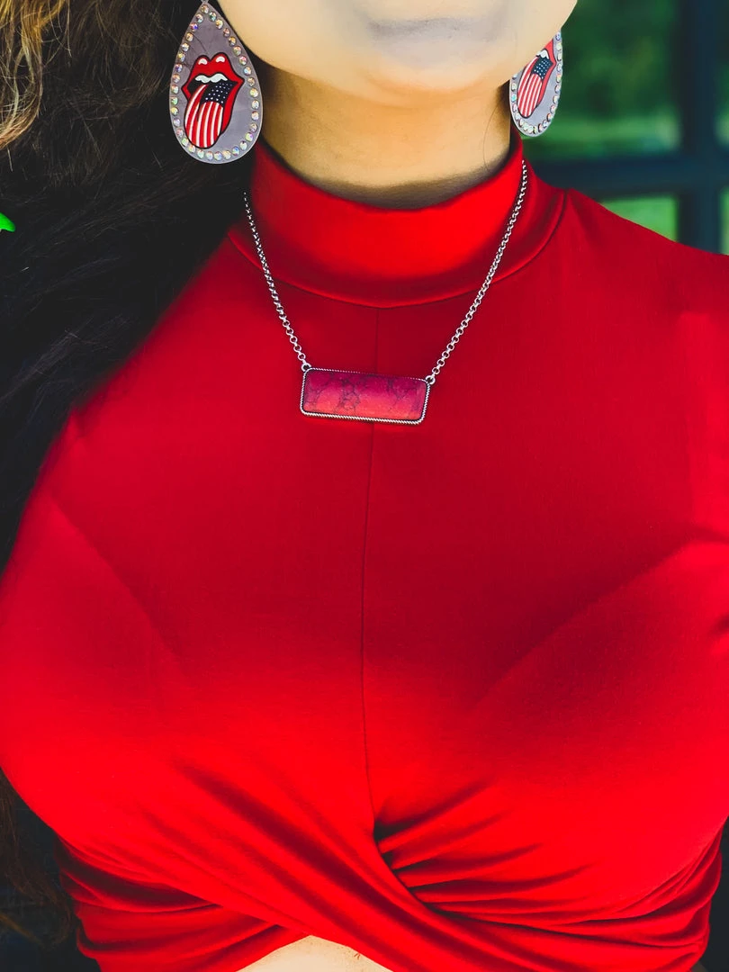 Rectangle red stone bar set in an antique silver setting. Necklace is on a beautiful chain with a lobster claps and adjustable links. Not all red stone pattern will be the same. Such a cute necklace to wear and layer!