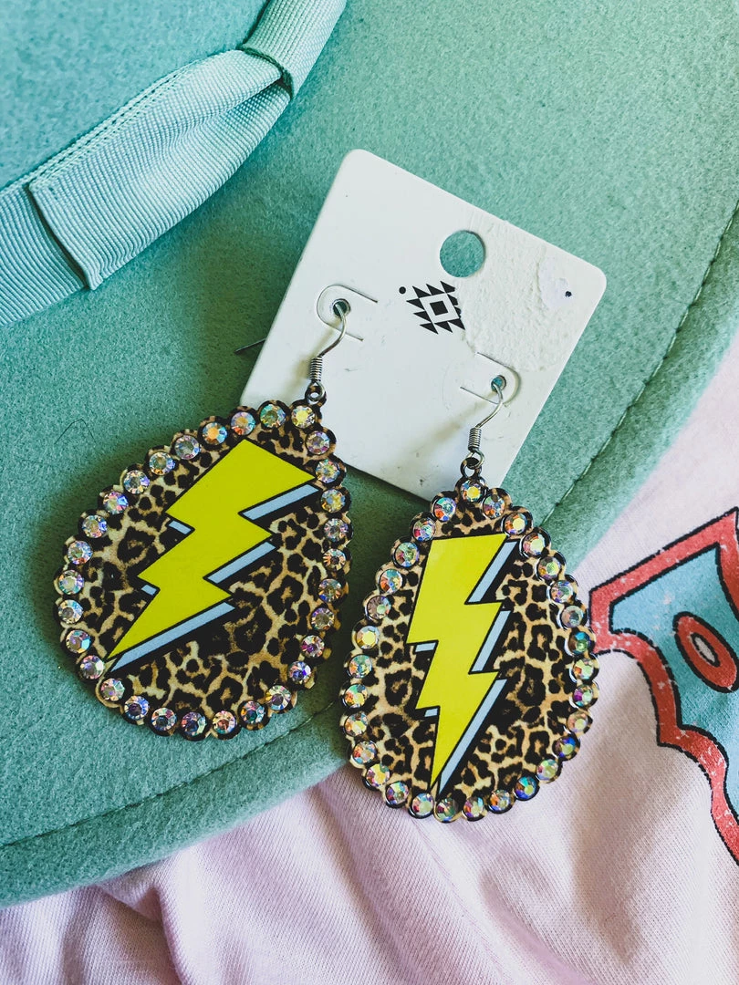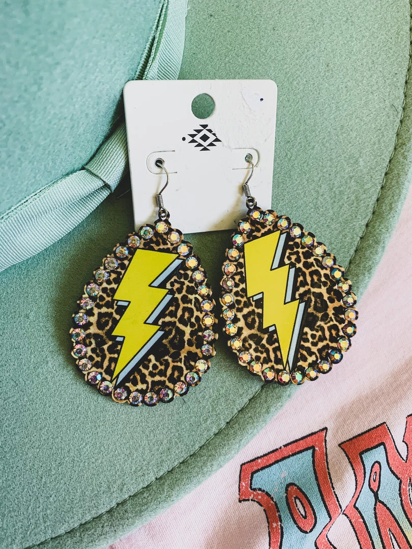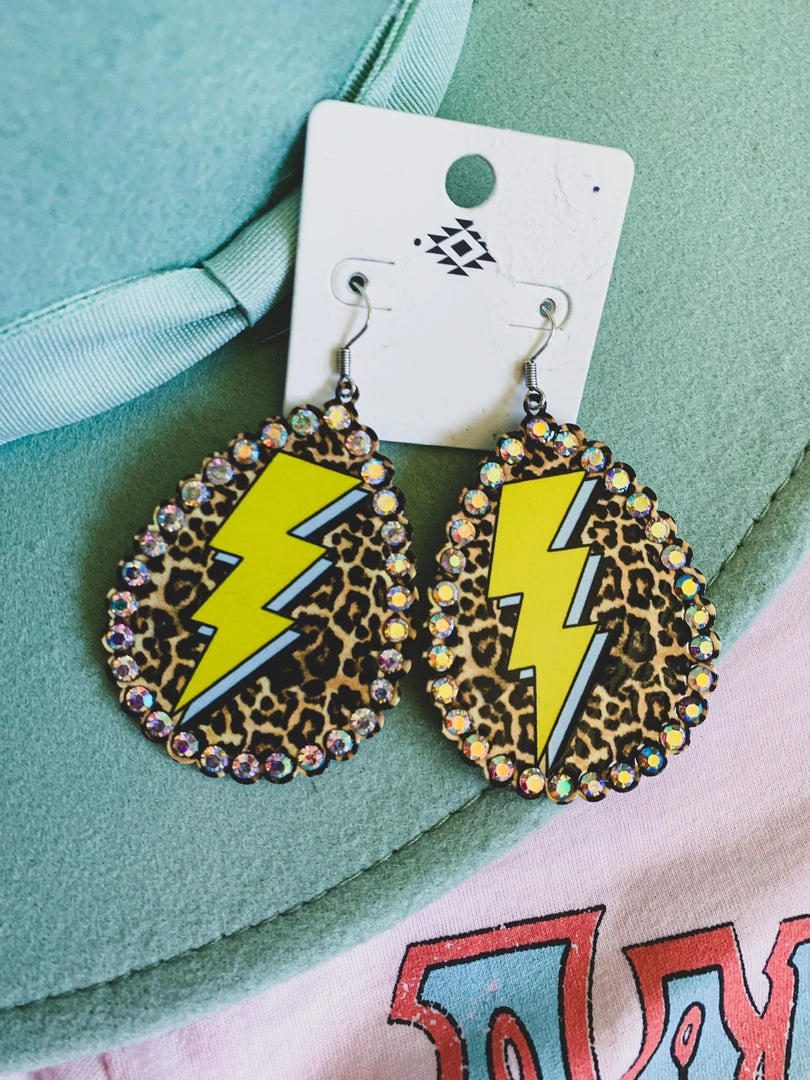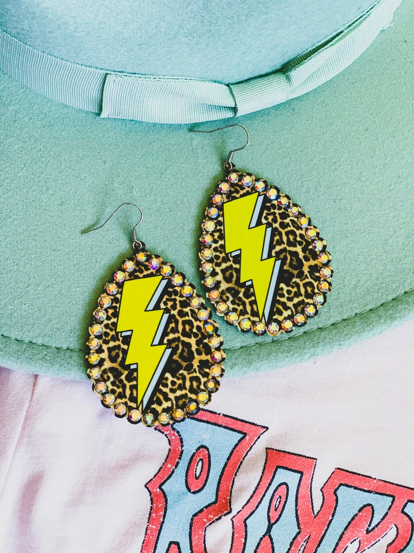 Metal teardrop shape earring with rhinestones, leopard print, and mustard lightning bolt. So cute, light weight, and adds the perfect POP to your outfits.