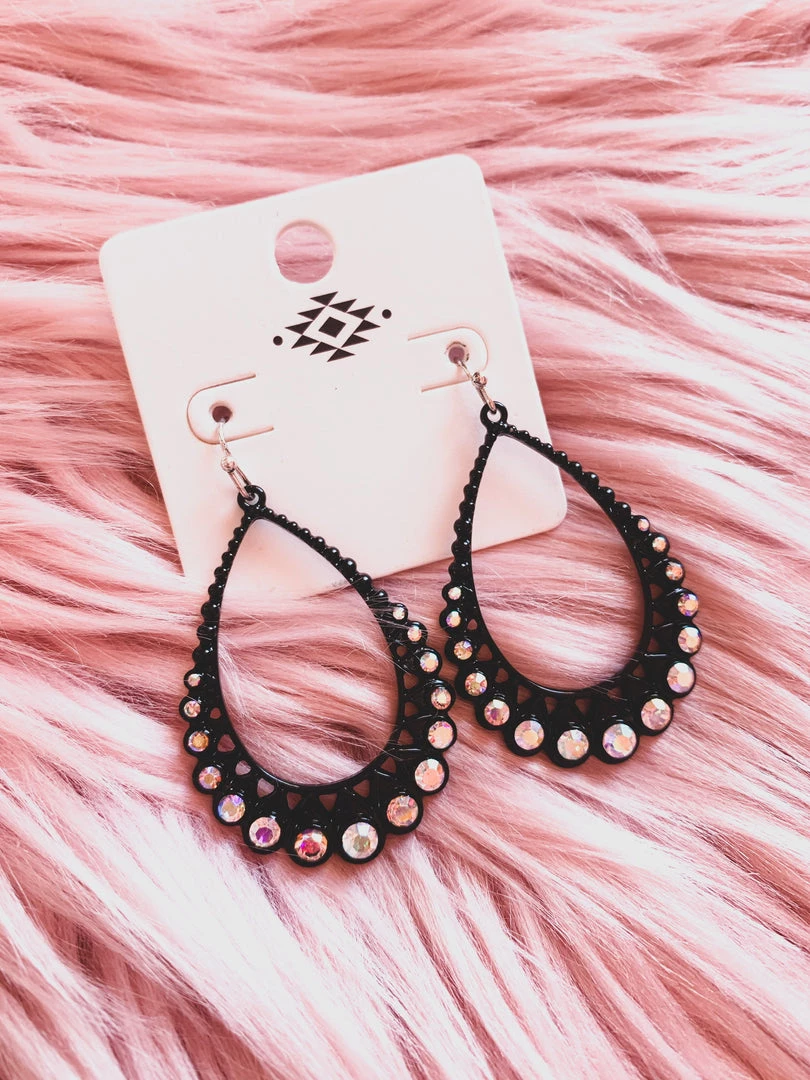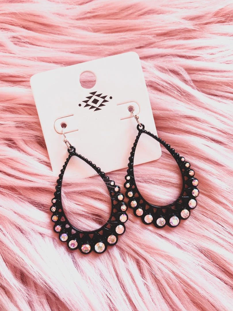 Black metal hollow teardrop earrings with beautiful iridescent crystal rhinestones. Such a simple yet SO cute earring. Light weight and goes with EVERYTHING!