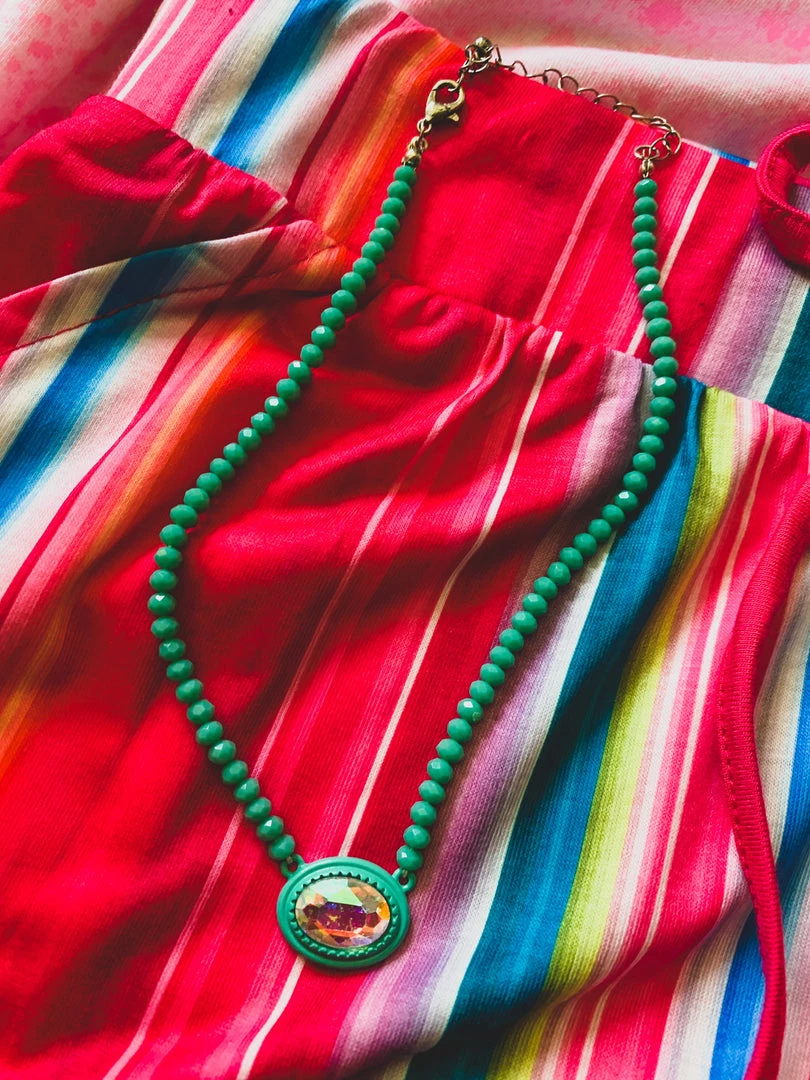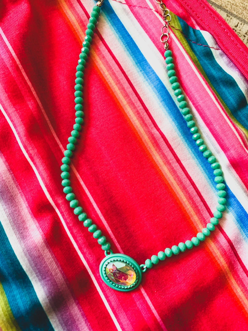 Turquoise beaded choker is a must in your jewelry collection! Necklace is fully beaded beaded and features an iridescent crystal stone set in a turquoise setting. Such a good piece for layering!