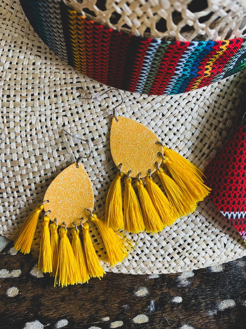 Be the center of attention and let your jewelry do the talking! Light weight and super fun YELLOW glitter teardrop earrings with yellow fringe tassels.Â