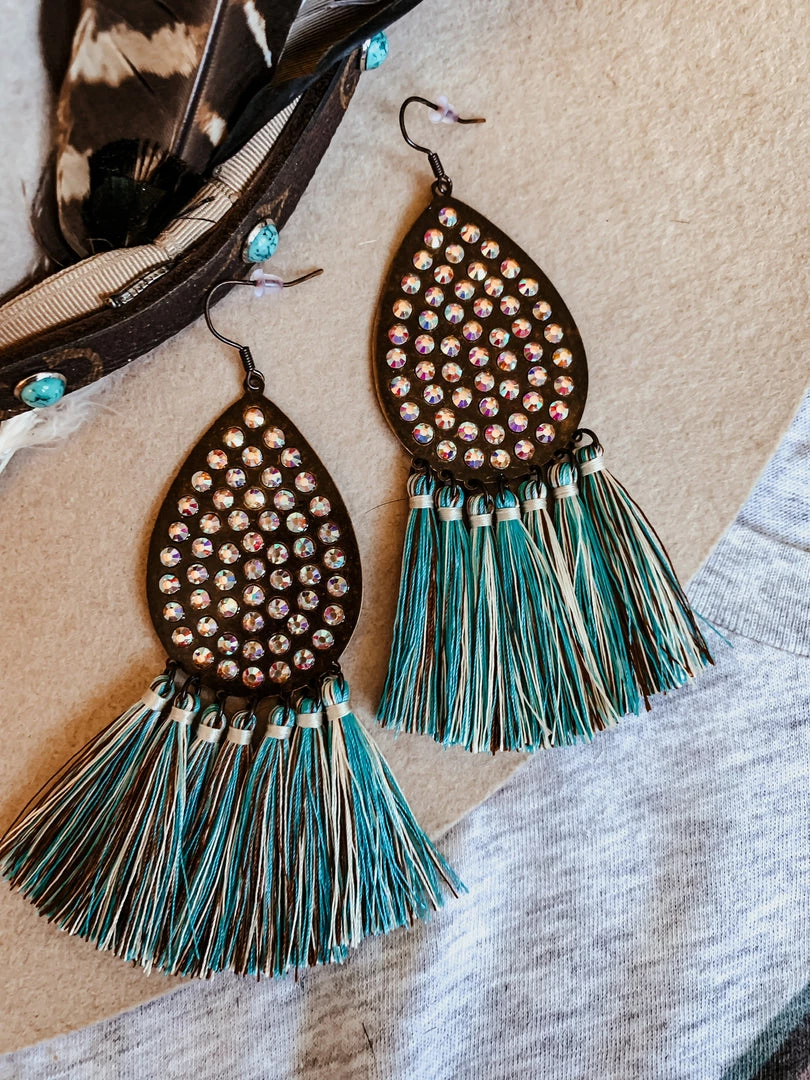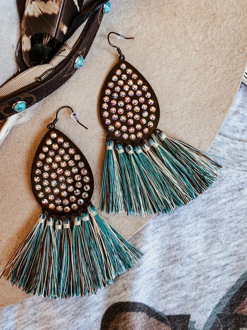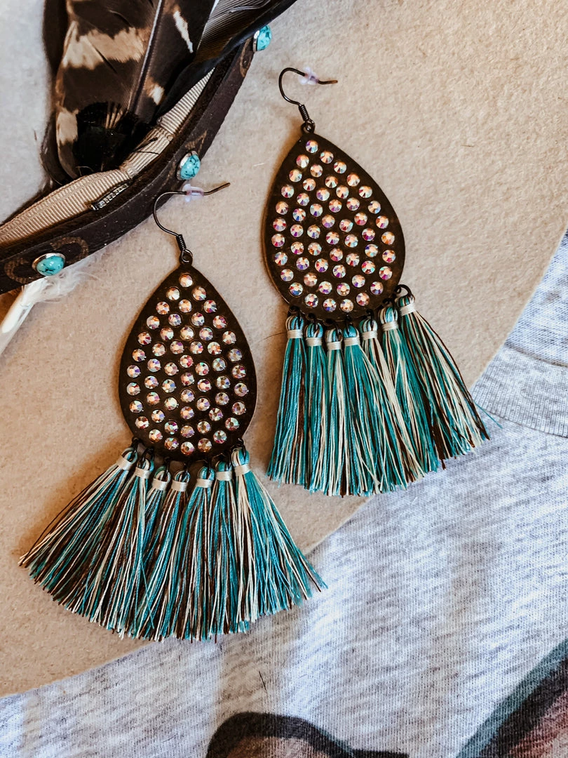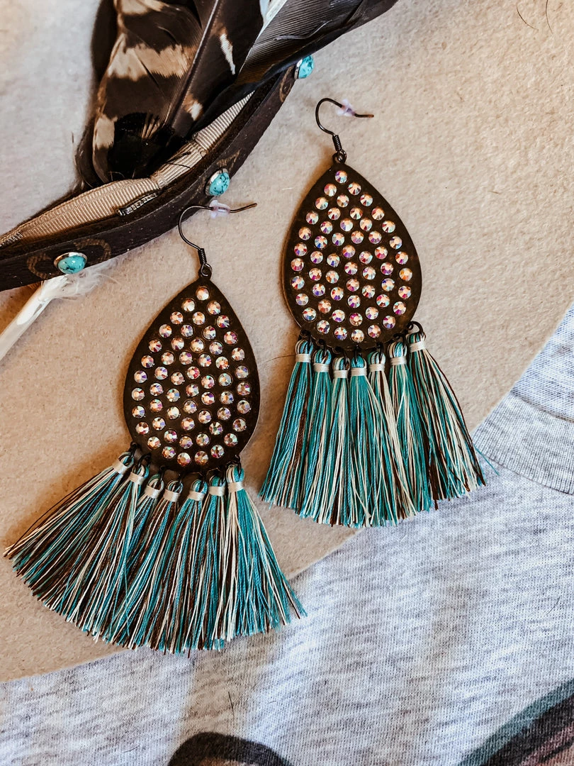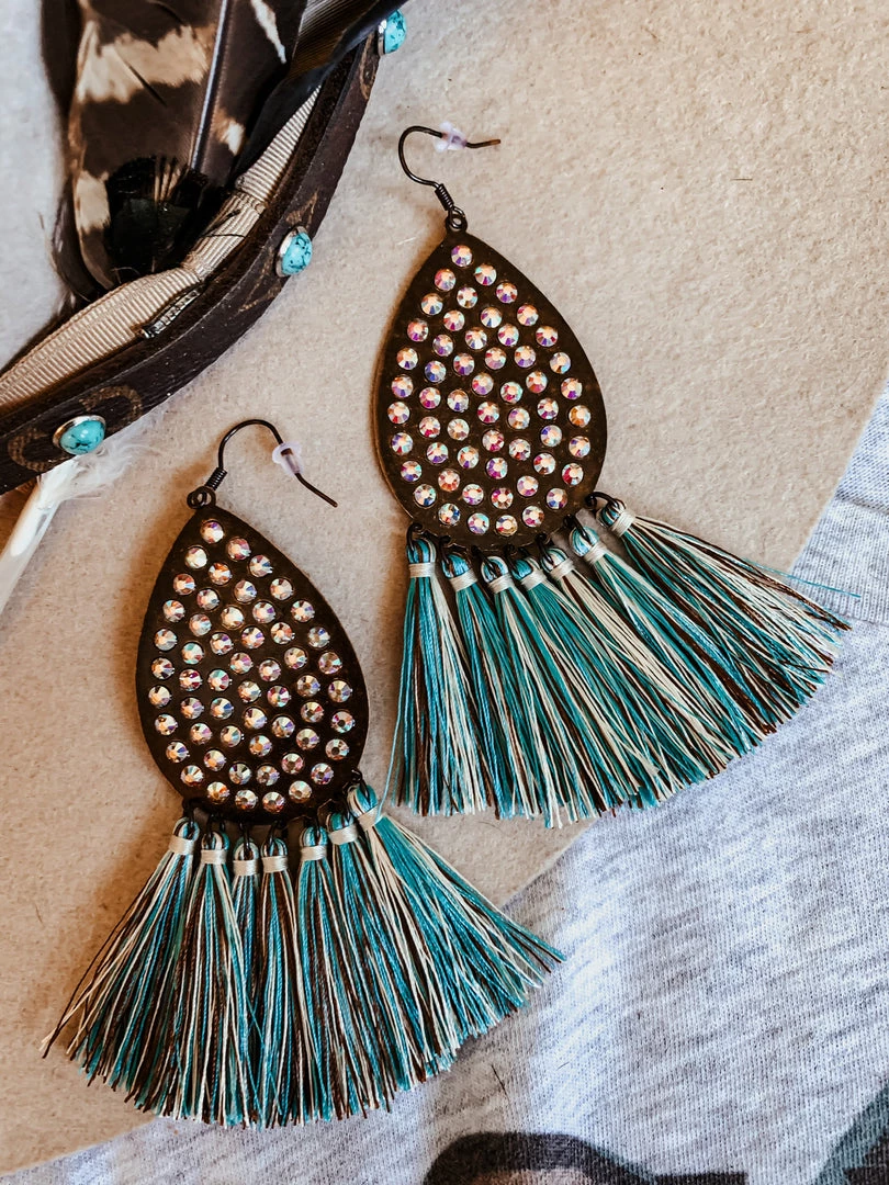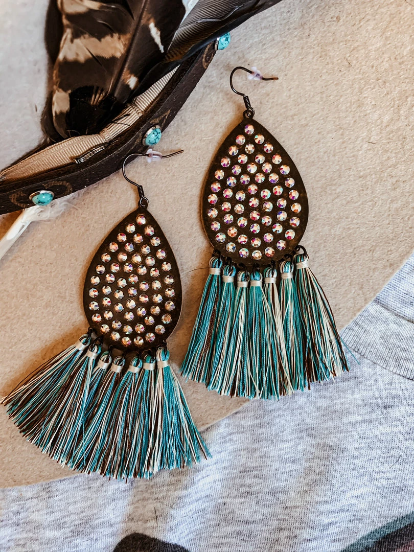 Metal teardrop earrings featuring gorgeous turquoise and brown hanging fringe tassels and rhinestones embedded in the teardrop shape. Lightweight and perfect size for a extra punch! Â
