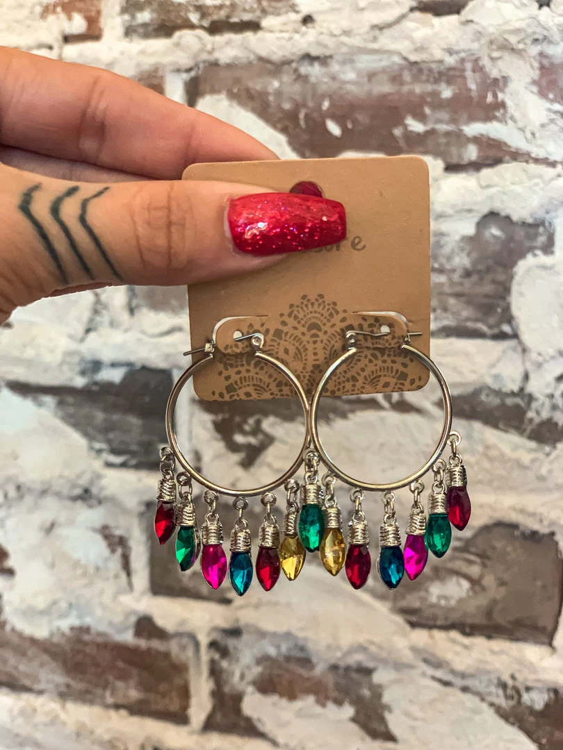 New Christmas light earrings will make the perfect finishing piece to your Holiday outfits! Features a gold or silver hoop with colorful Christmas light charms. These are a must have for your Holiday looks!