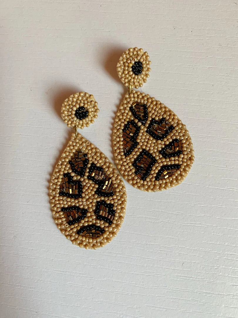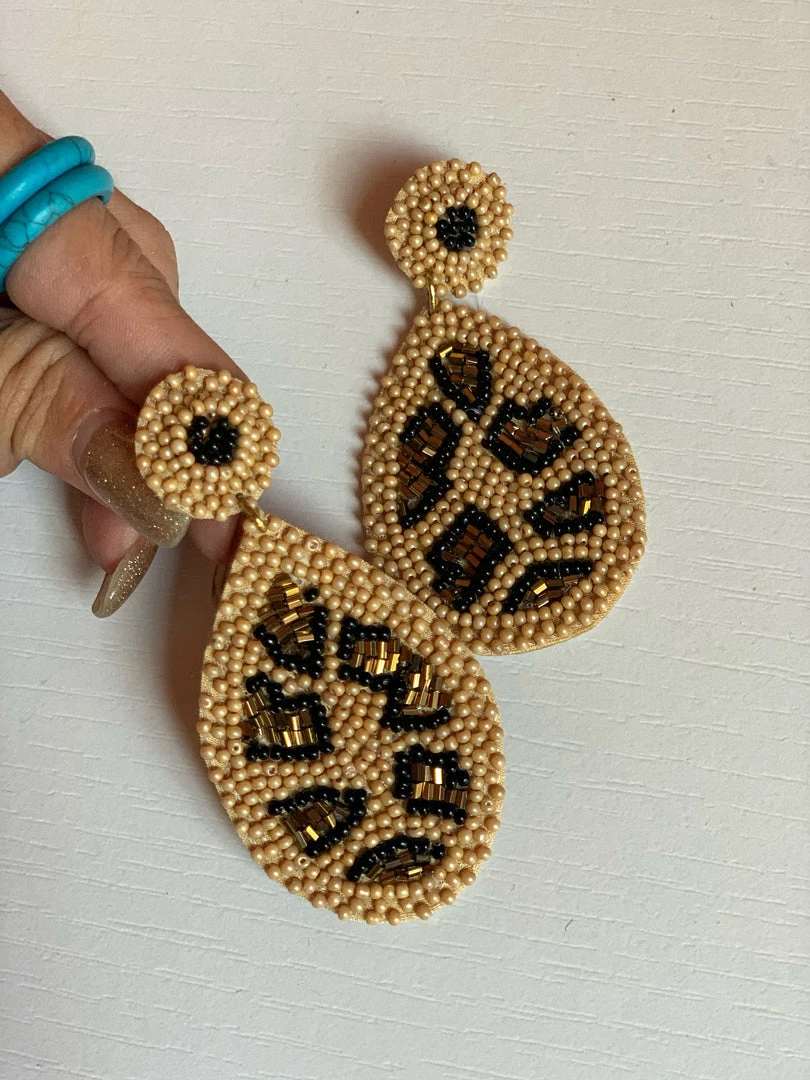 Fully beaded taupe leopard print earrings on a beaded post. Earrings have beaded leopard print detail and are super light weight. A must have Gypsy Waltz favorite!
