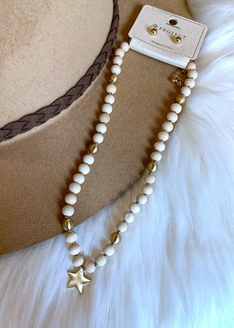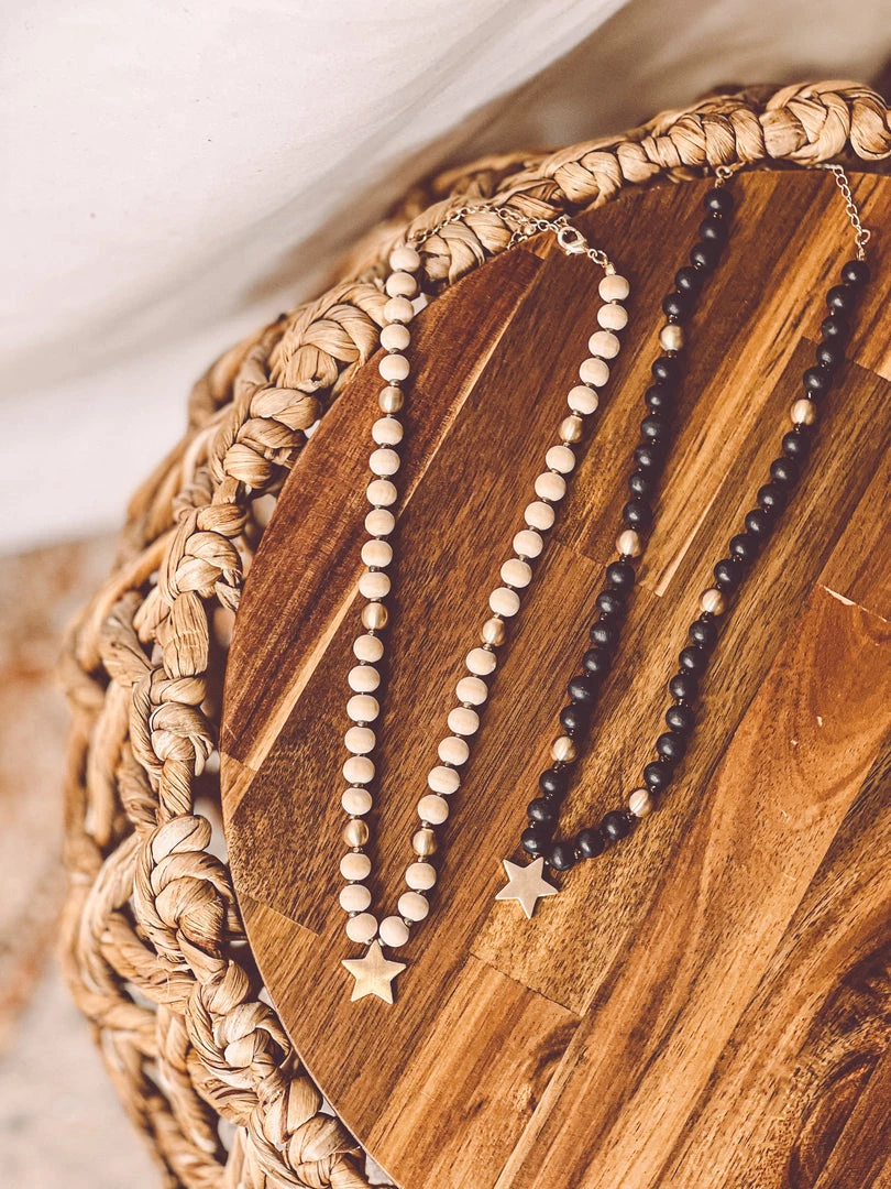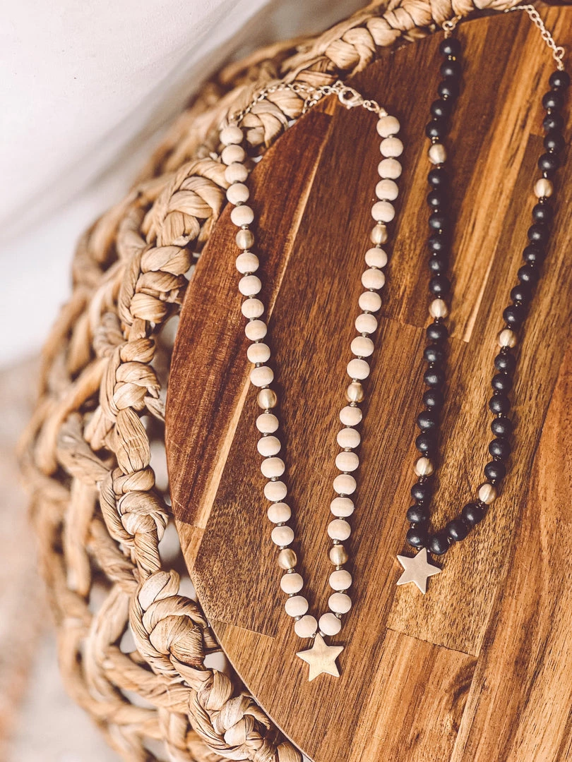 The perfect GO TO light weight star necklace is HERE! Necklace features wood like beads, gold beads, and a gold star charm. So cute and perfect to pair with your outfits!