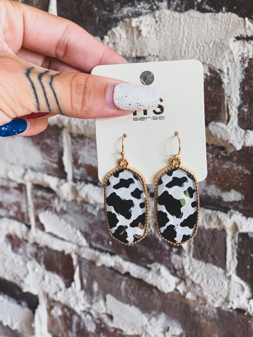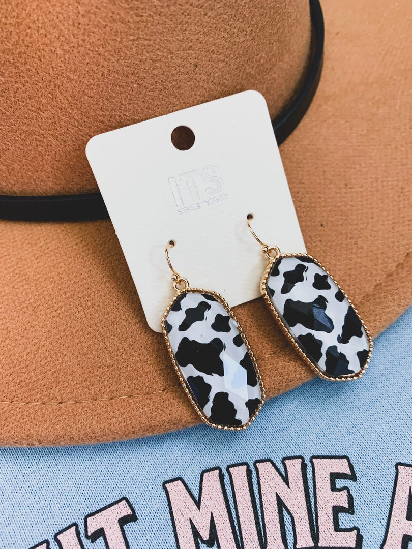 Beautiful “hexagon” trendy modern geometric style cow print earrings are a must have in your jewelry collection. Earrings feature black and white cow print pattern set in a gold setting on a gold fish hook. Earrings are light weight and the perfect pop of pattern!