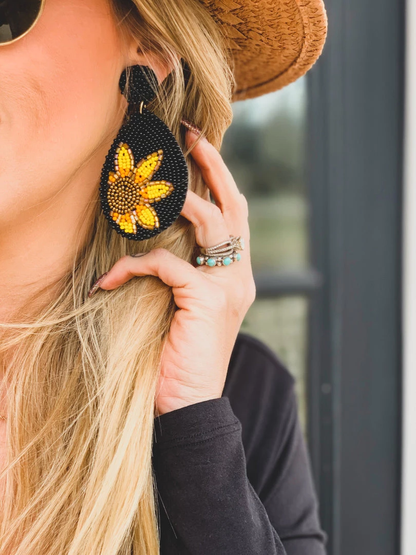 Fully beaded sunflower earrings on a beaded post. Earrings are light weight and feature a yellow sunflower.