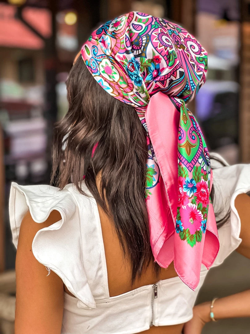 Multi color boho mandala paisley print silk wild rag is the perfect all around accessory. Scarf features so many beautiful colors. Gorgeous paisley pattern with the perfect silky shine. Tie it around your wrist, belt loop, in your hair as a head wrap, or wear it as a western wild rag around your neck. SO many different CUTE ways to incorporate this babe in your outfits. Stand out with our new bandana!