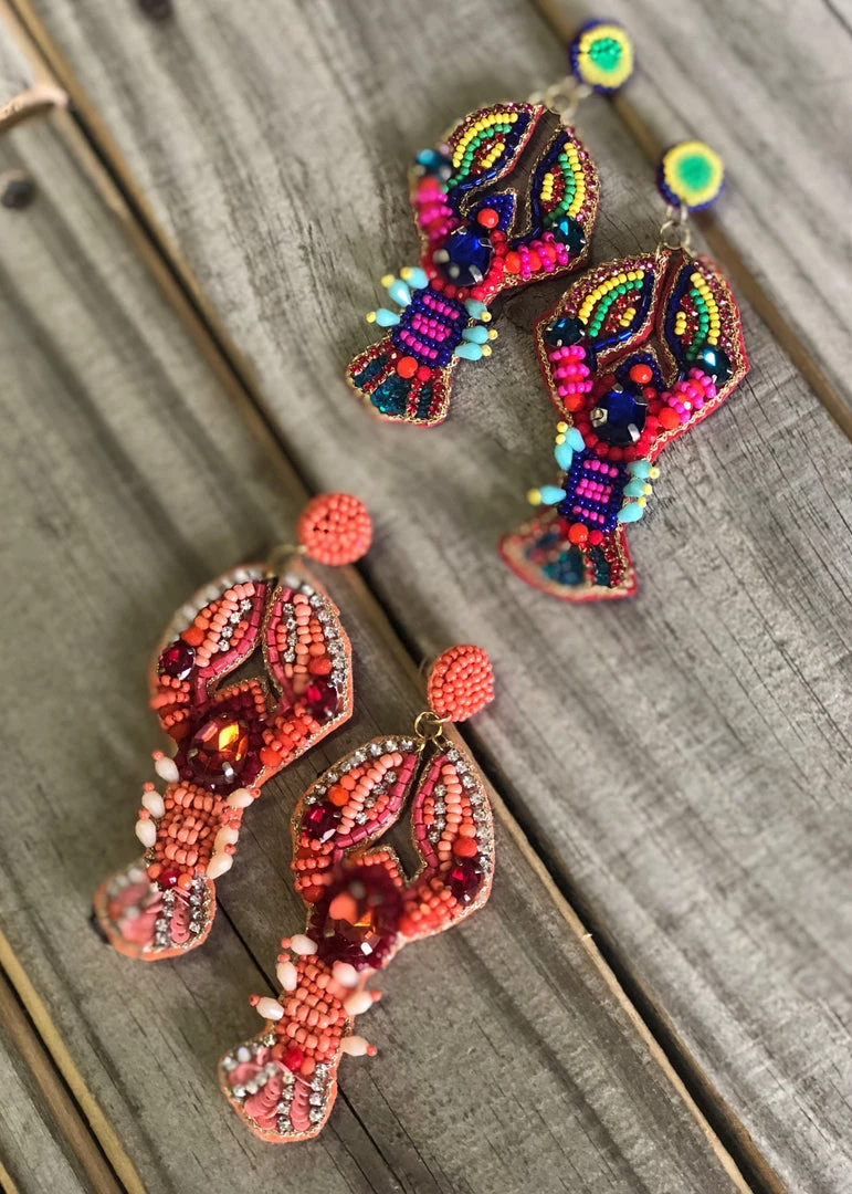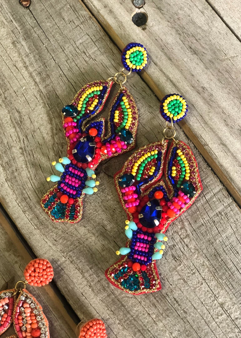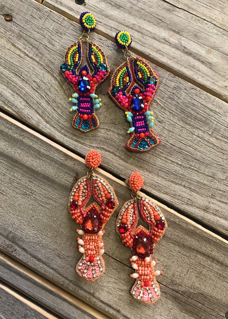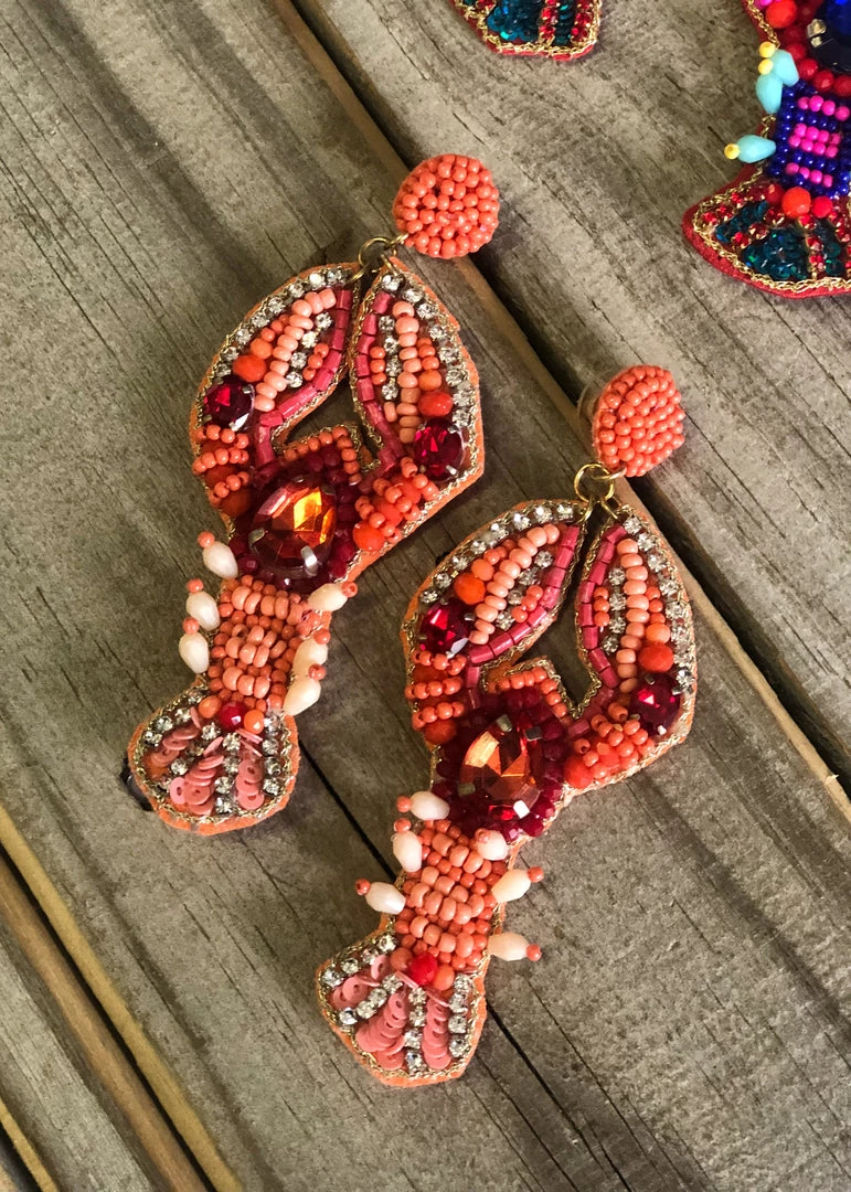 - Beaded and rhinestoned crawfish on a beaded stud post