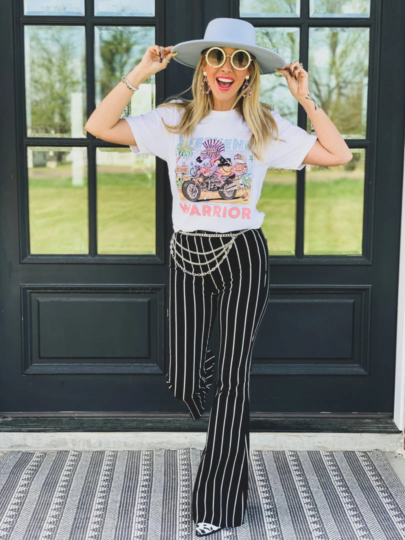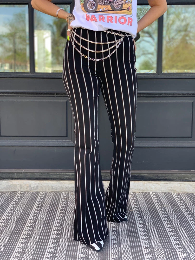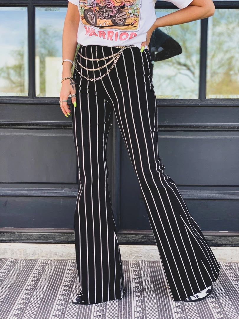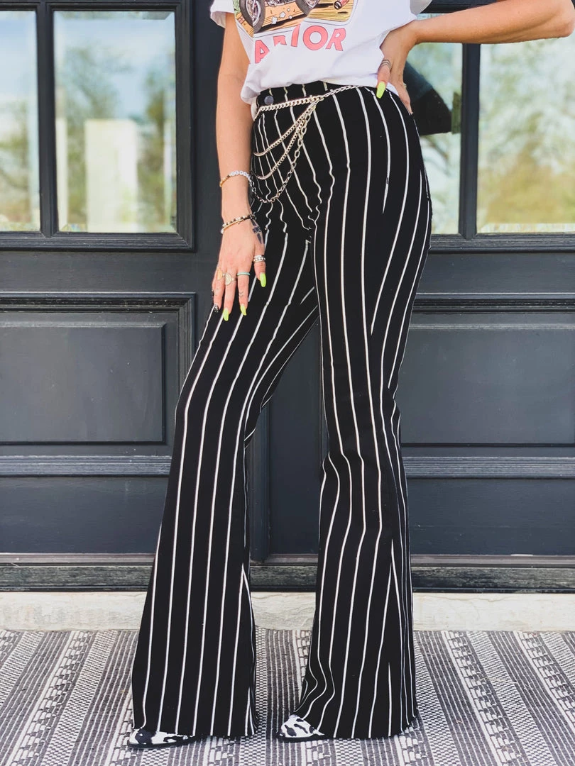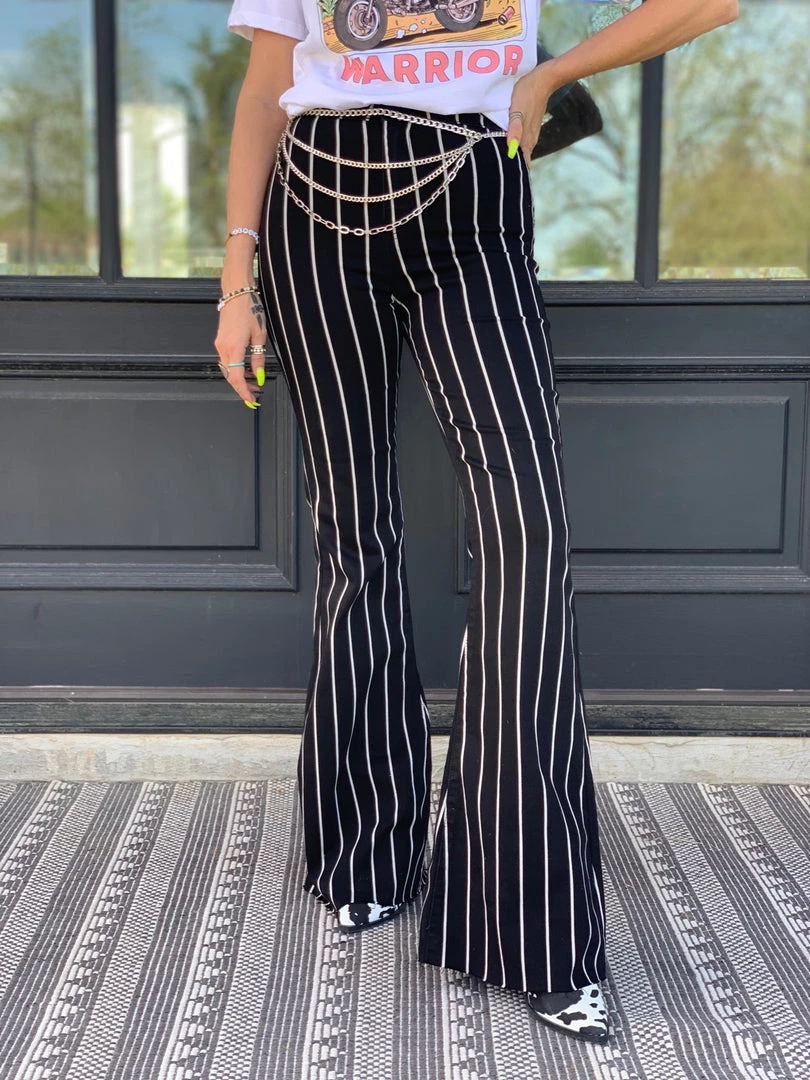 Black and white striped high-rise denim flares are O M G perfect. Flares features black and white stripes, frayed unfinished hem, the traditional button and zipper closure, two front pockets, and two back pockets, and the perfect high waist. Pants are stretchy and are super flattering. Bell bottoms have a frayed hem which is perfect to cut to length for our shorter babes.