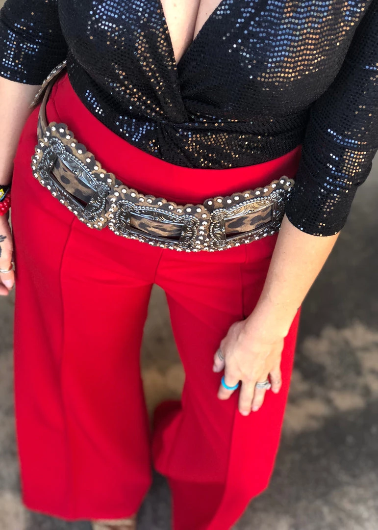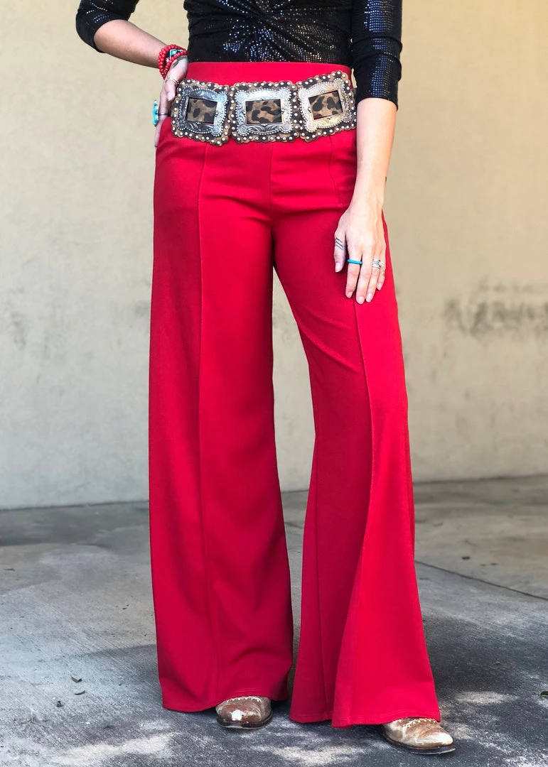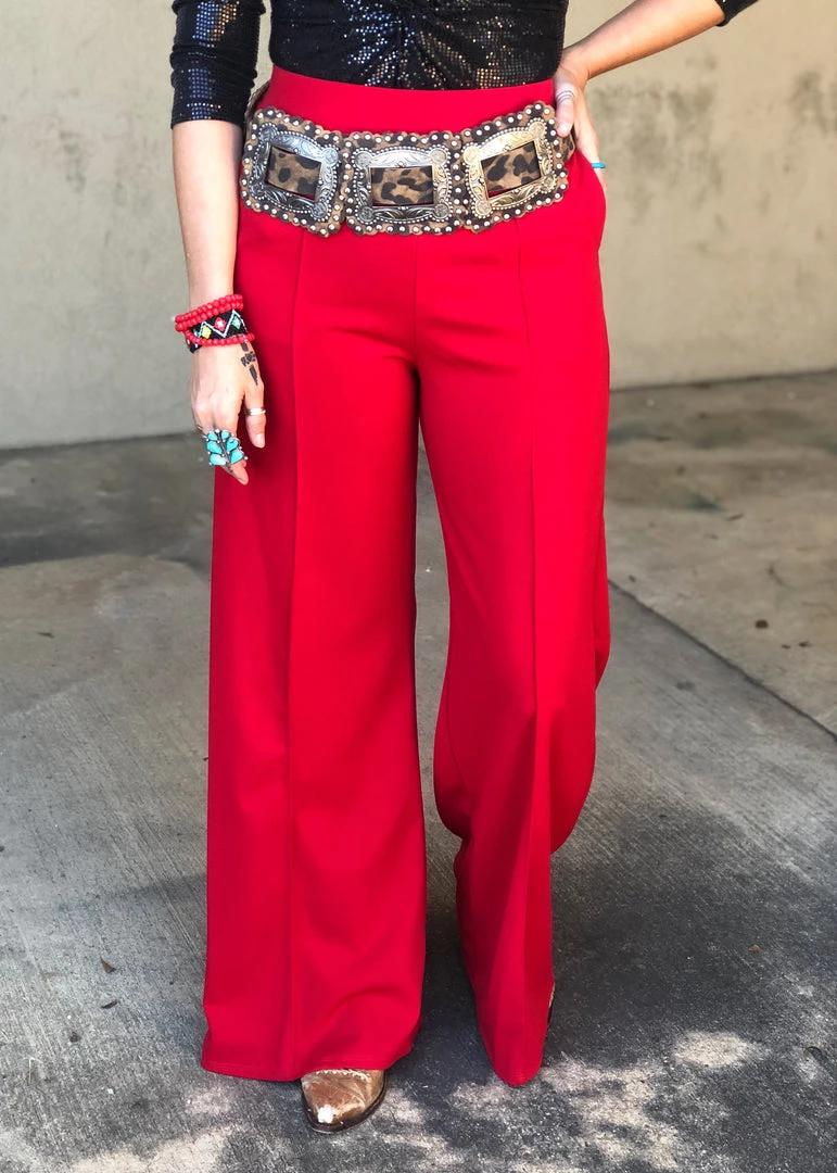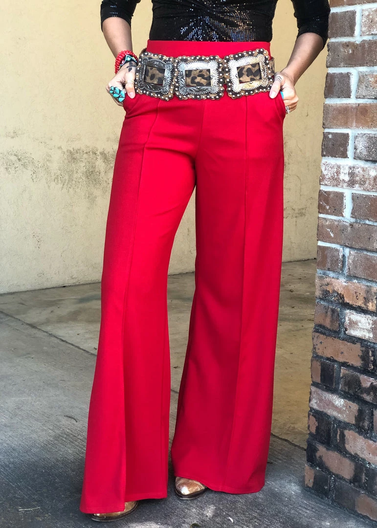 Our sell out palazzo pants are back and better than ever!! Features an elastic waist , front pleats, and side pockets. So many ways to style these cute pants. Perfect pants to strut in at the NFR.