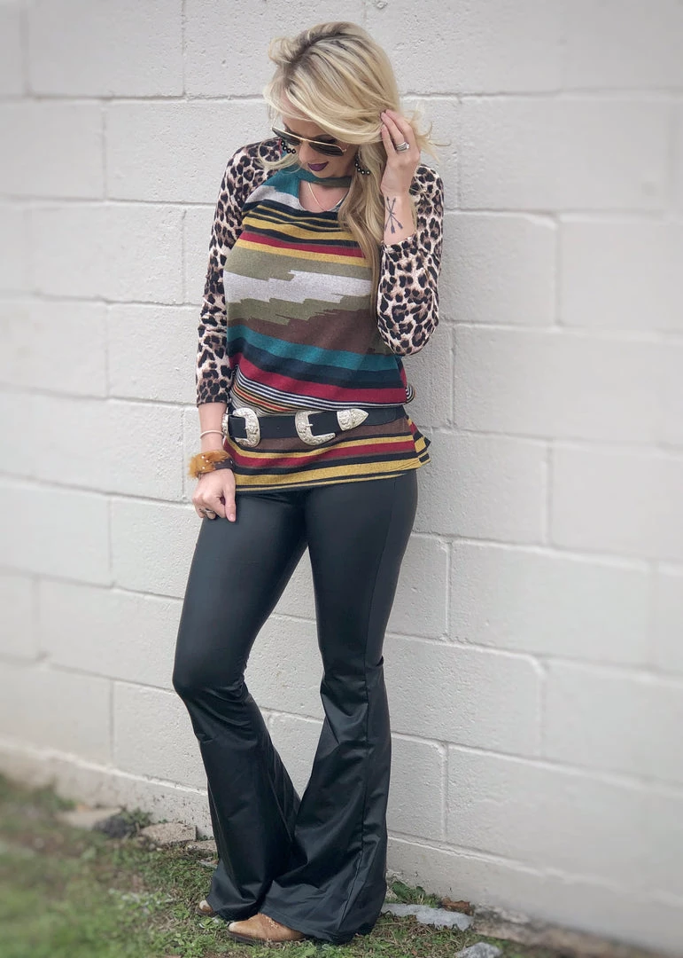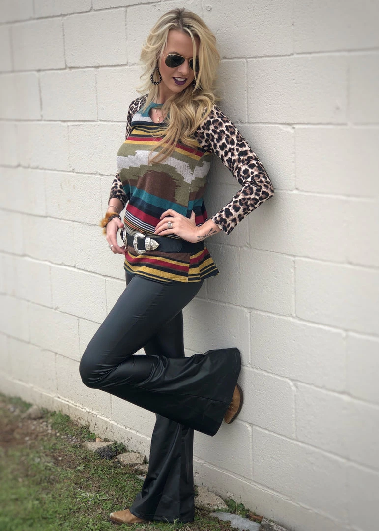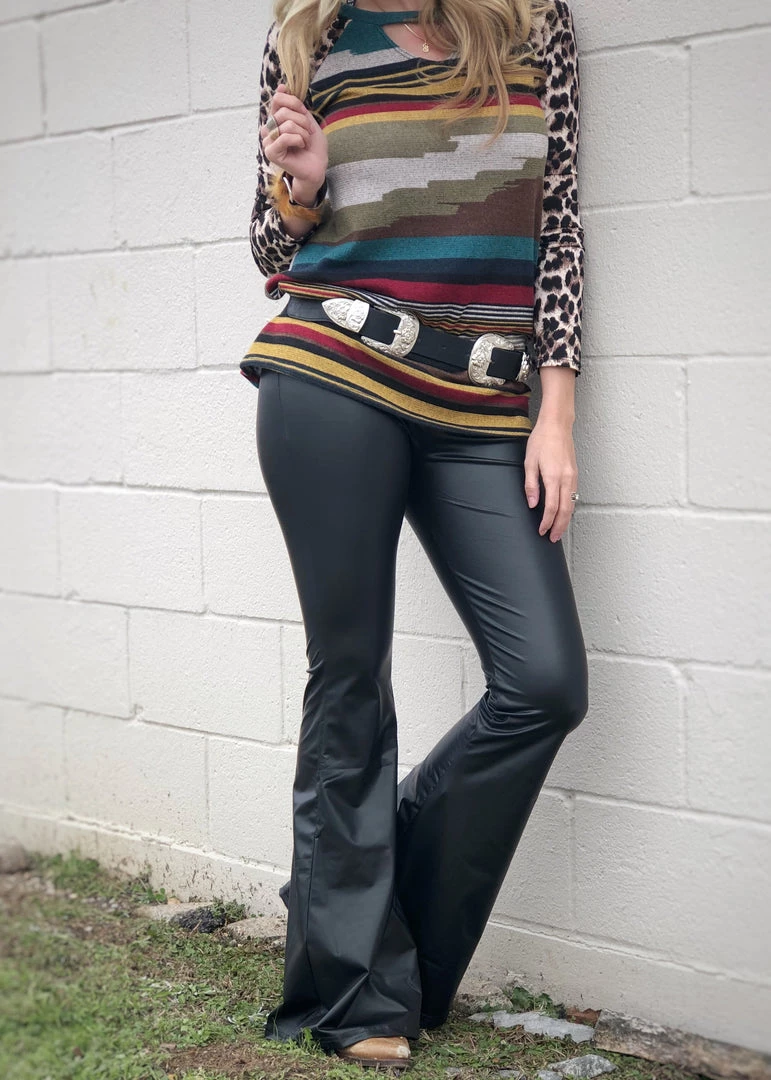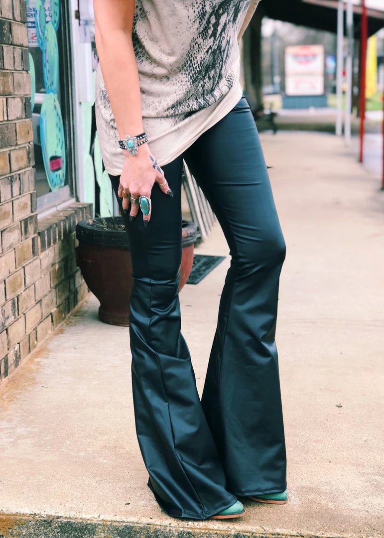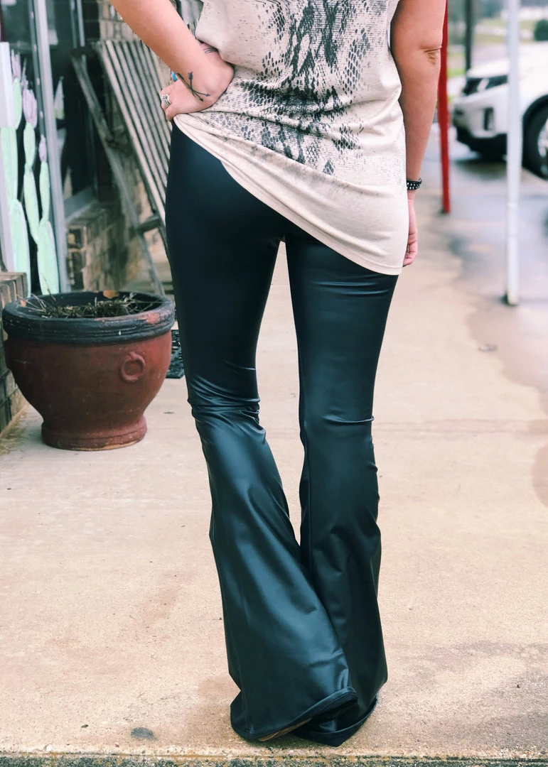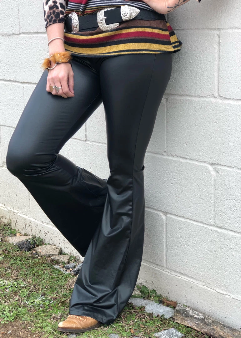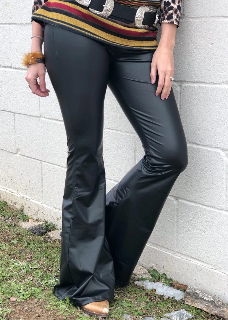 Fitted flare super soft black faux leather bell bottoms. Features an elastic waistband with lots of stretch!