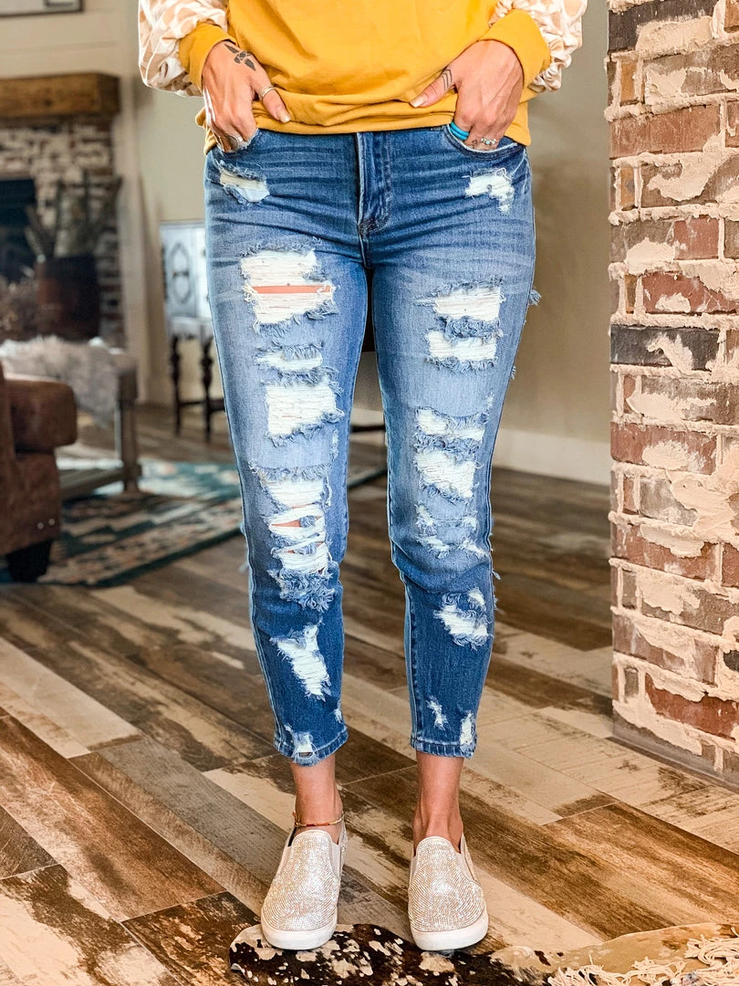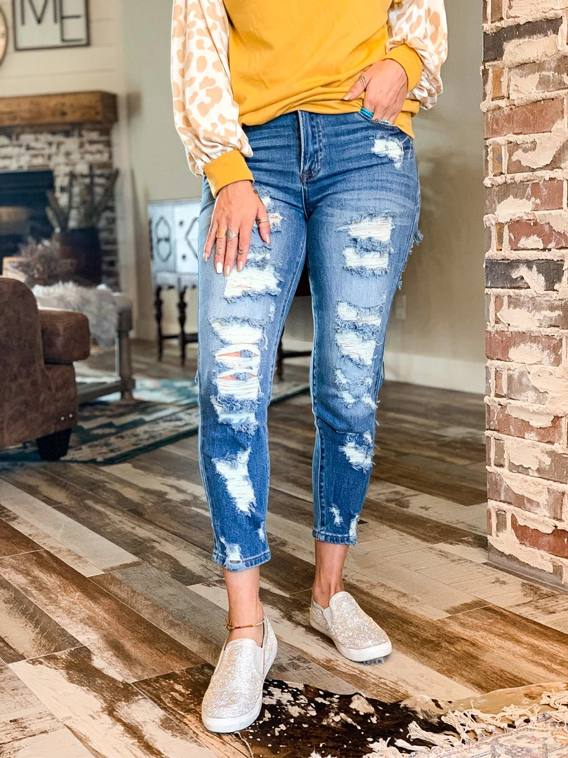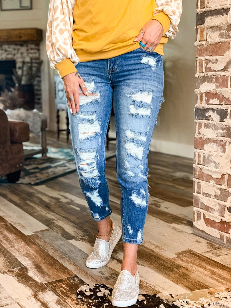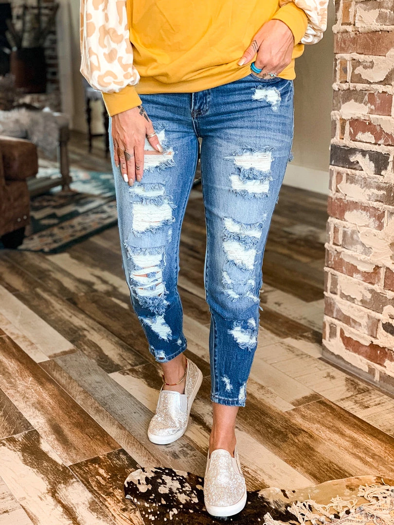 Can you scream OBSESSED! New ldark wash extreme distressed skinnies. Jeans feature distressing on the front, a distressing on the hem, and a light distressing on the back of the jeans. So cute paired with all your Fall sweaters and flannels!