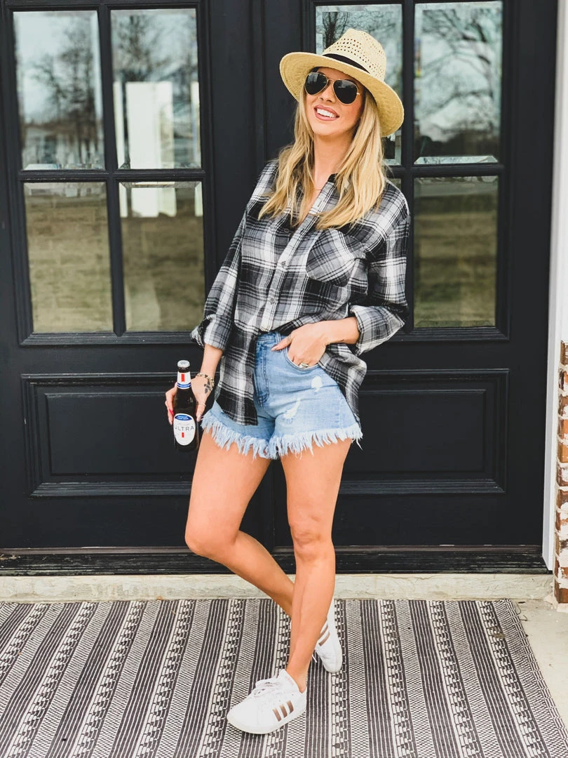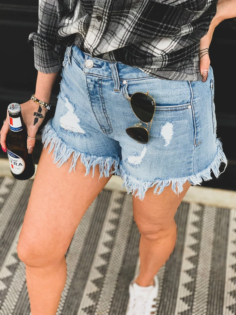 Light wash high waist shorts are so perfect for Summer. Shorts feature traditional button front and zipper closure, distressing, a slight distressing on the back, an uneven hem line, and a long raw frayed hem. Trust us when we say, these will be your FAVORITE shorts.