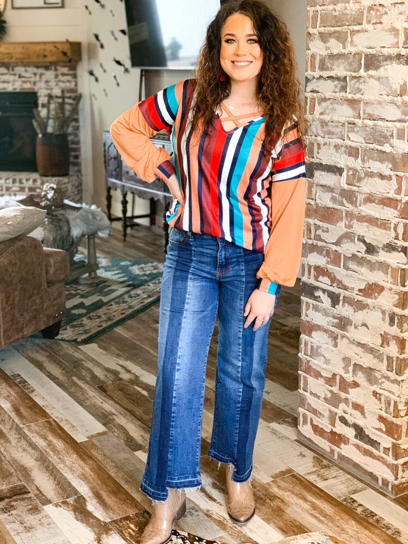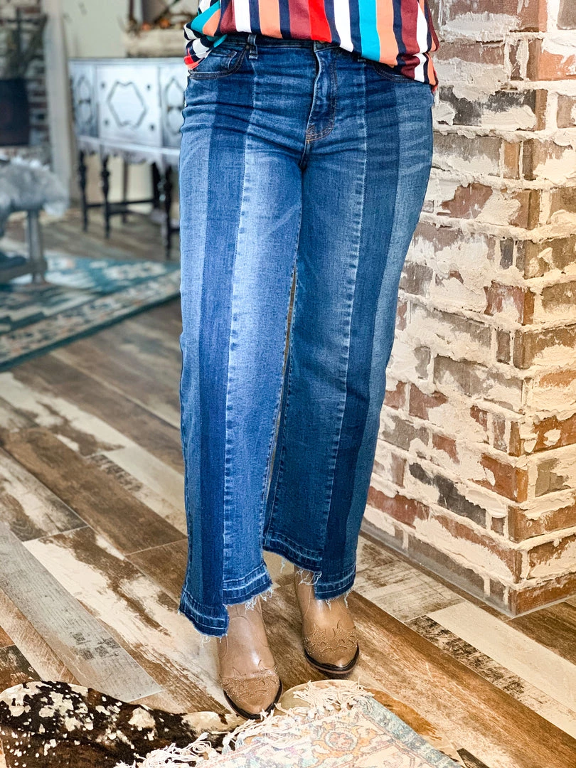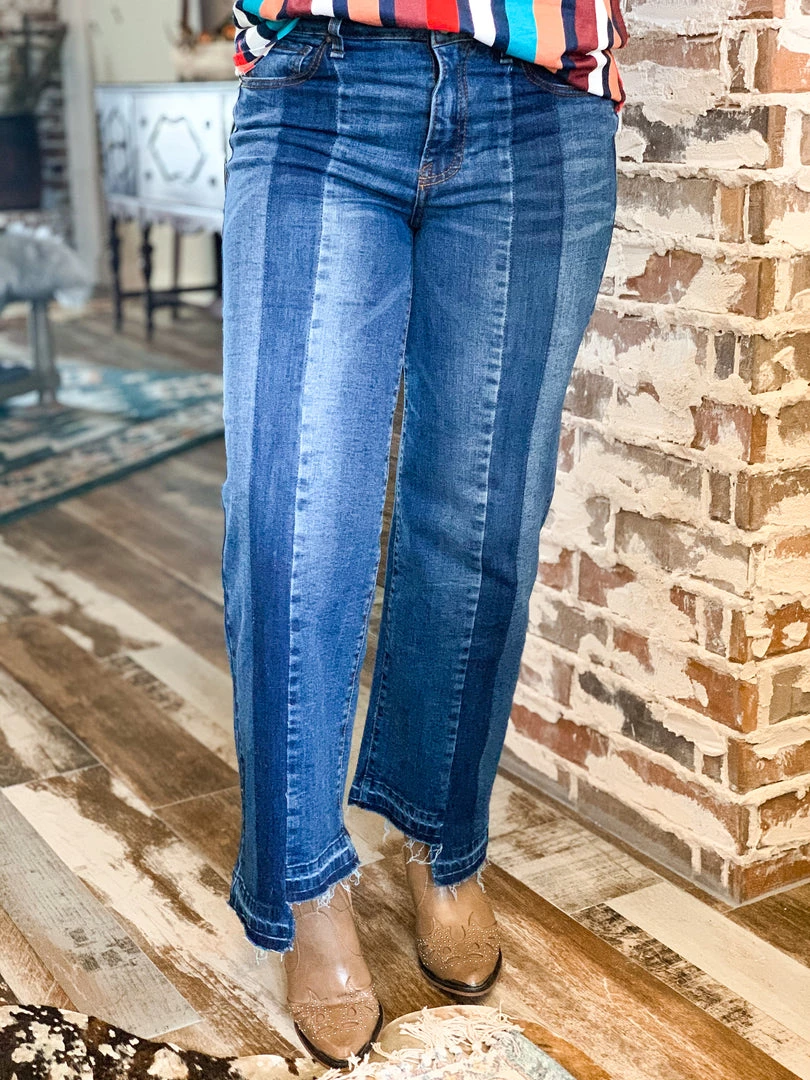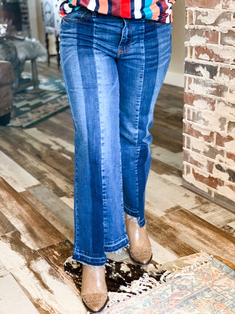 Retro denim crop jean is Gypsy Waltz new GO TO jean! So retro and unique. Hi rise pants feature a raw hem crop, an uneven crop, multi color contrast denim, traditional button and zipper closure, two front pockets, and two back pockets. Pants are SO comfortable and flattering. We love it paired with our Decatur Top.