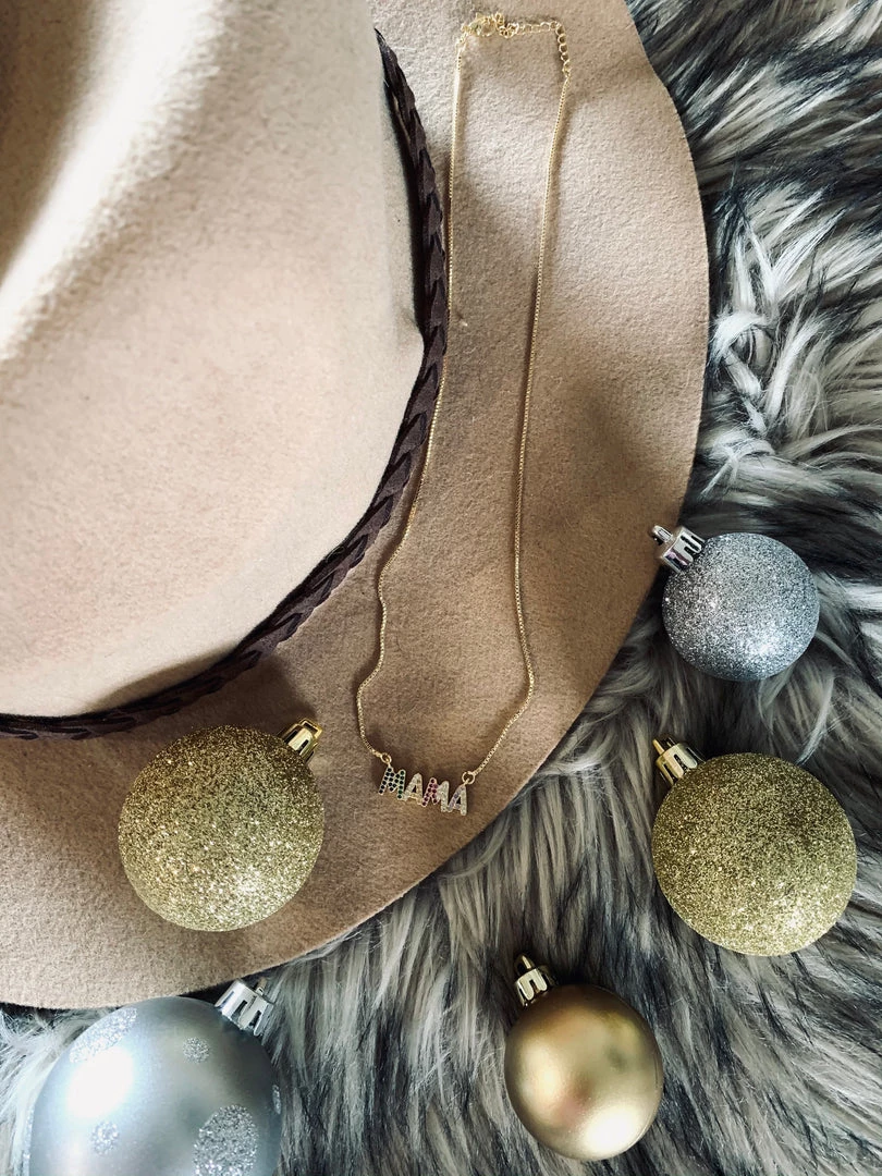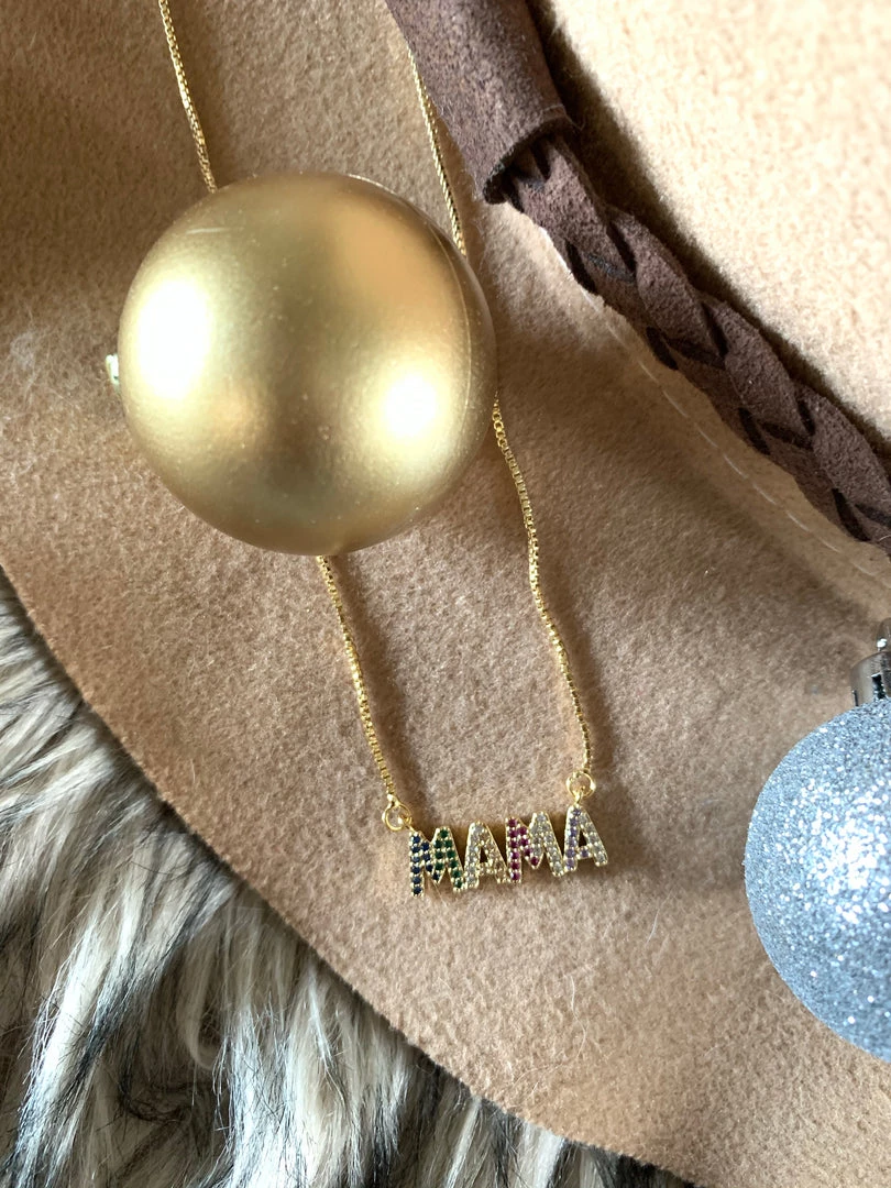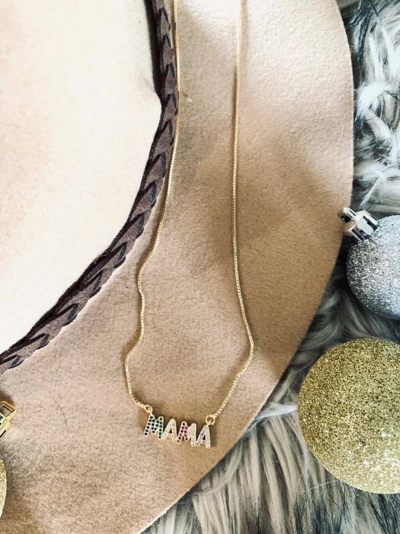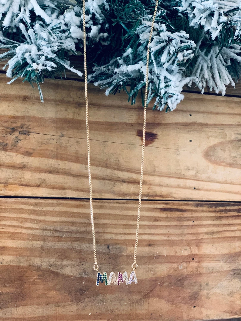 MAMA necklace with colorful rhinestones in a gold setting on a gold chain. Necklace is dainty, light weight, and perfect for all our mamas.Â